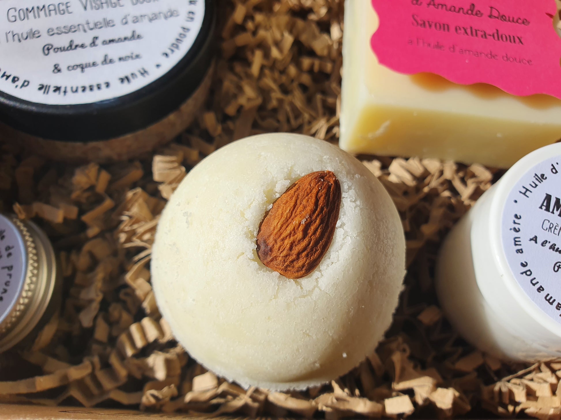 - et enfin une grosse bombe de bain à l'huile essentielle d'amande amère, au beurre de karité et au seul d'Epsom pour un super moment de détente. En fondant la bombe effervescente va libérer un délicieux parfum de... vous l'aurez compris !