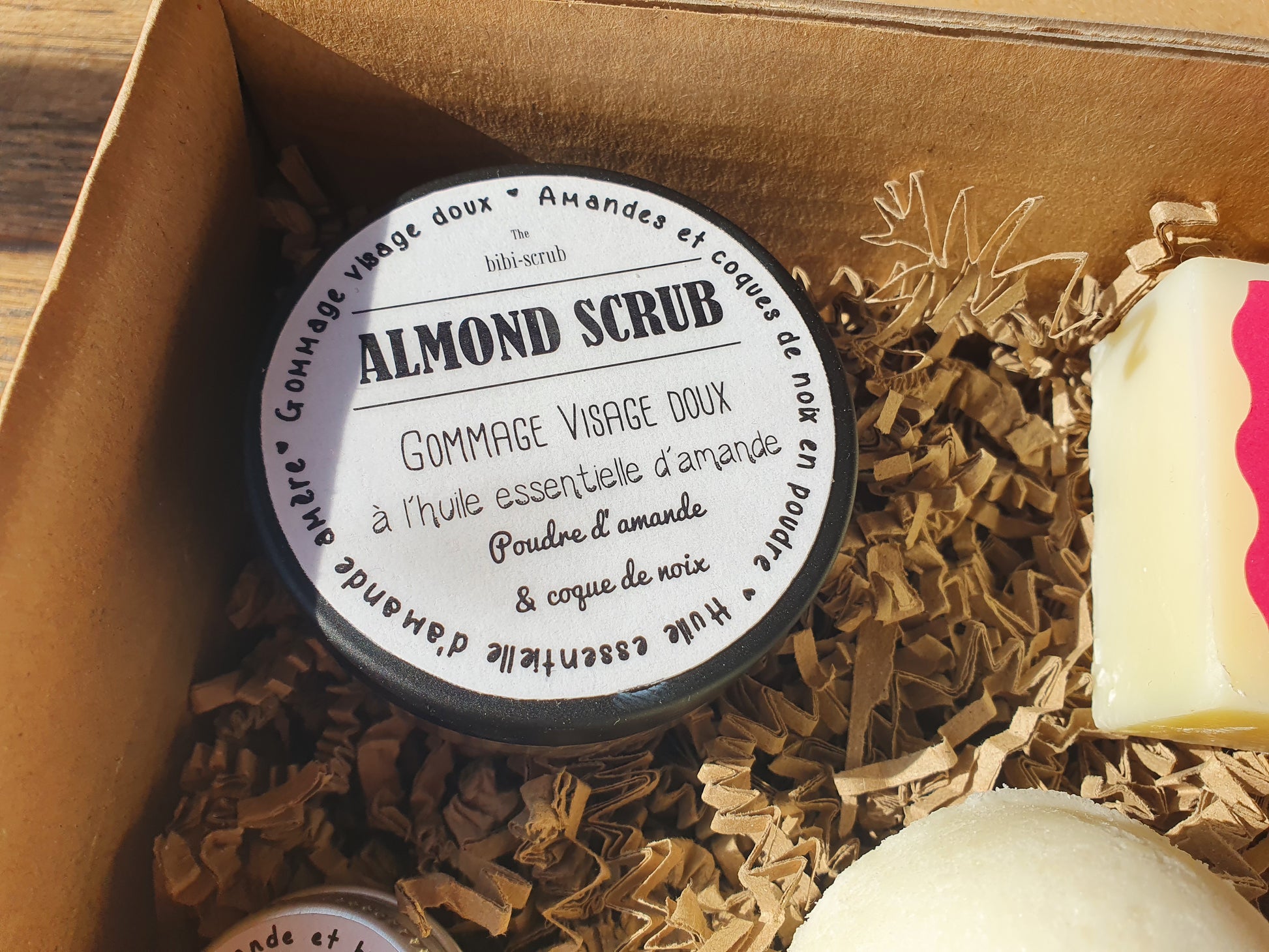 - un gommage "Almond scrub" à la poudre d'amande pour une exfoliation tout en douceur et en gourmandise.