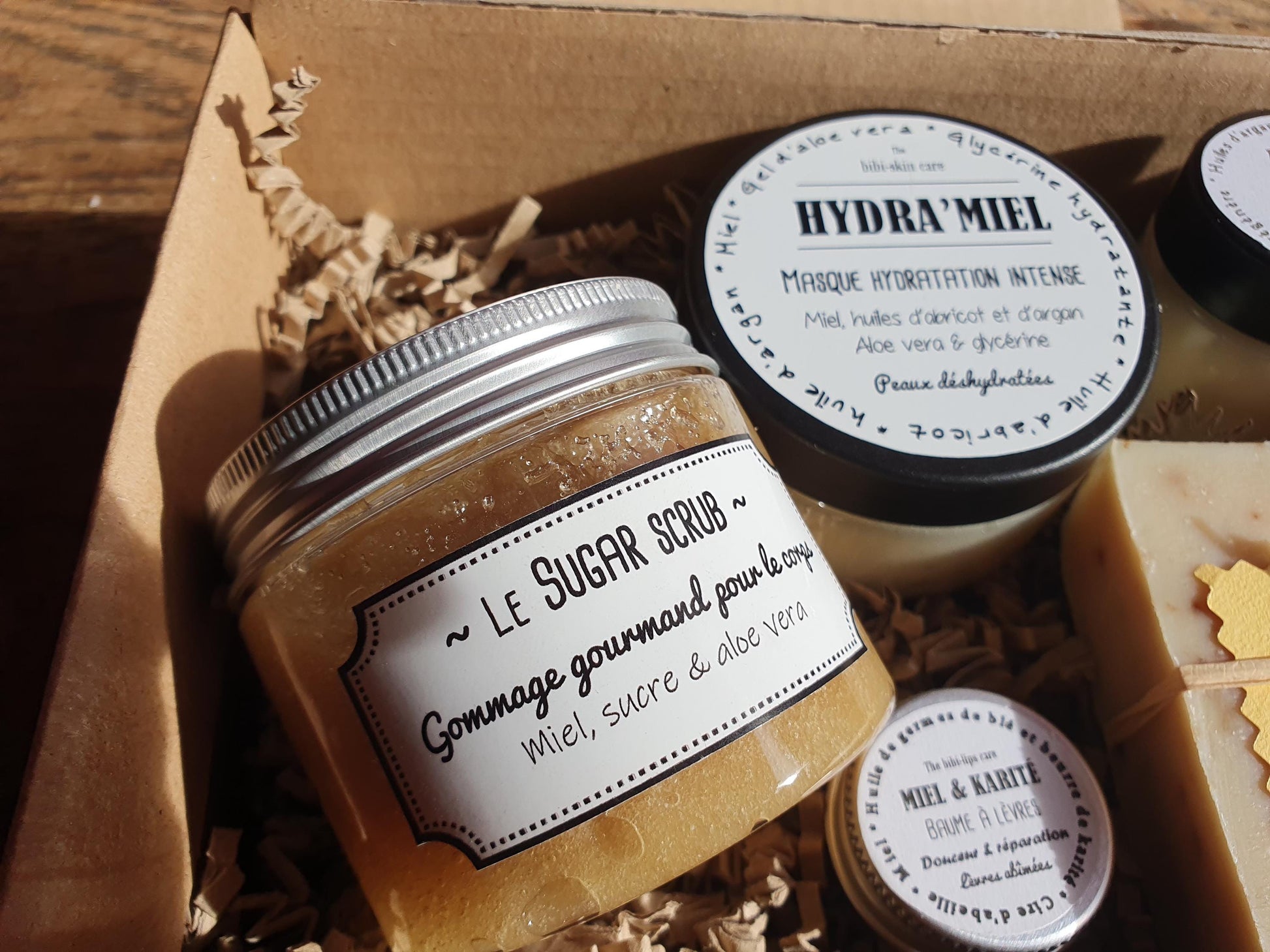 - un gommage pour le corps au sucre, au miel et à l'aloe vera pour une peau ultra douce et éclatante.