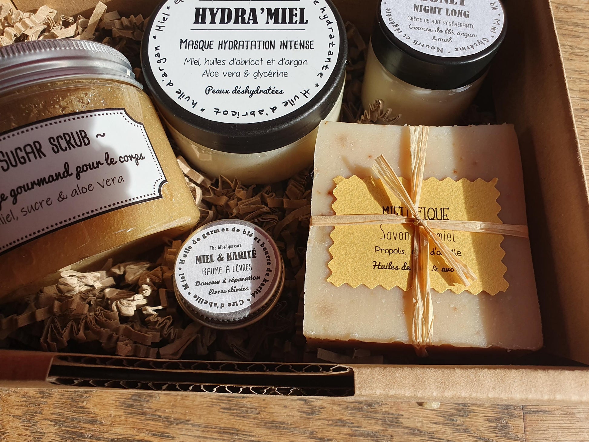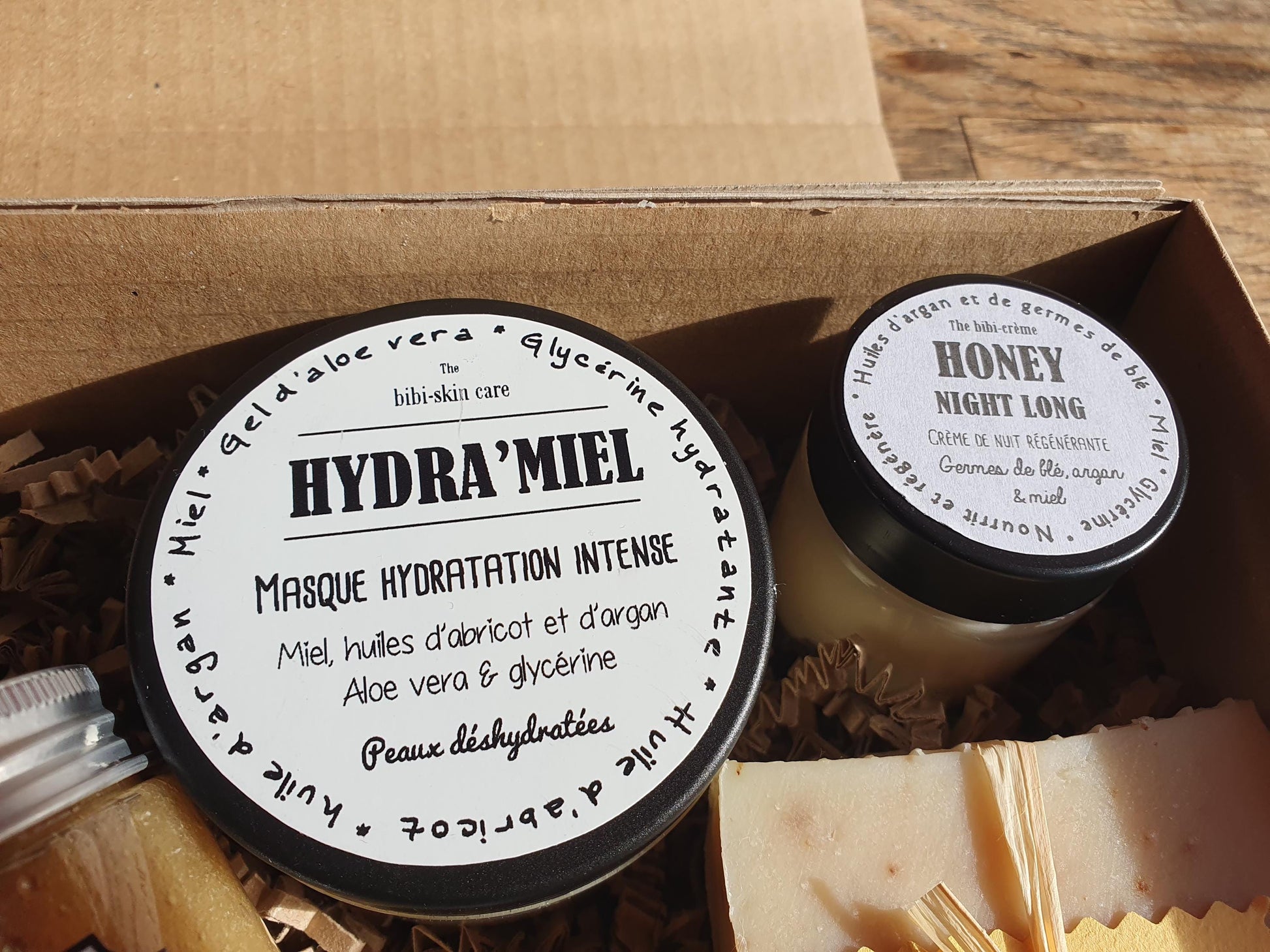 - un savon "Miellifique" au miel, propolis, cire d'abeille et huiles végétales de noix, d'olive et d'avocat.