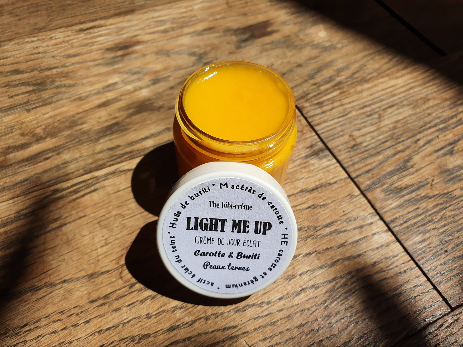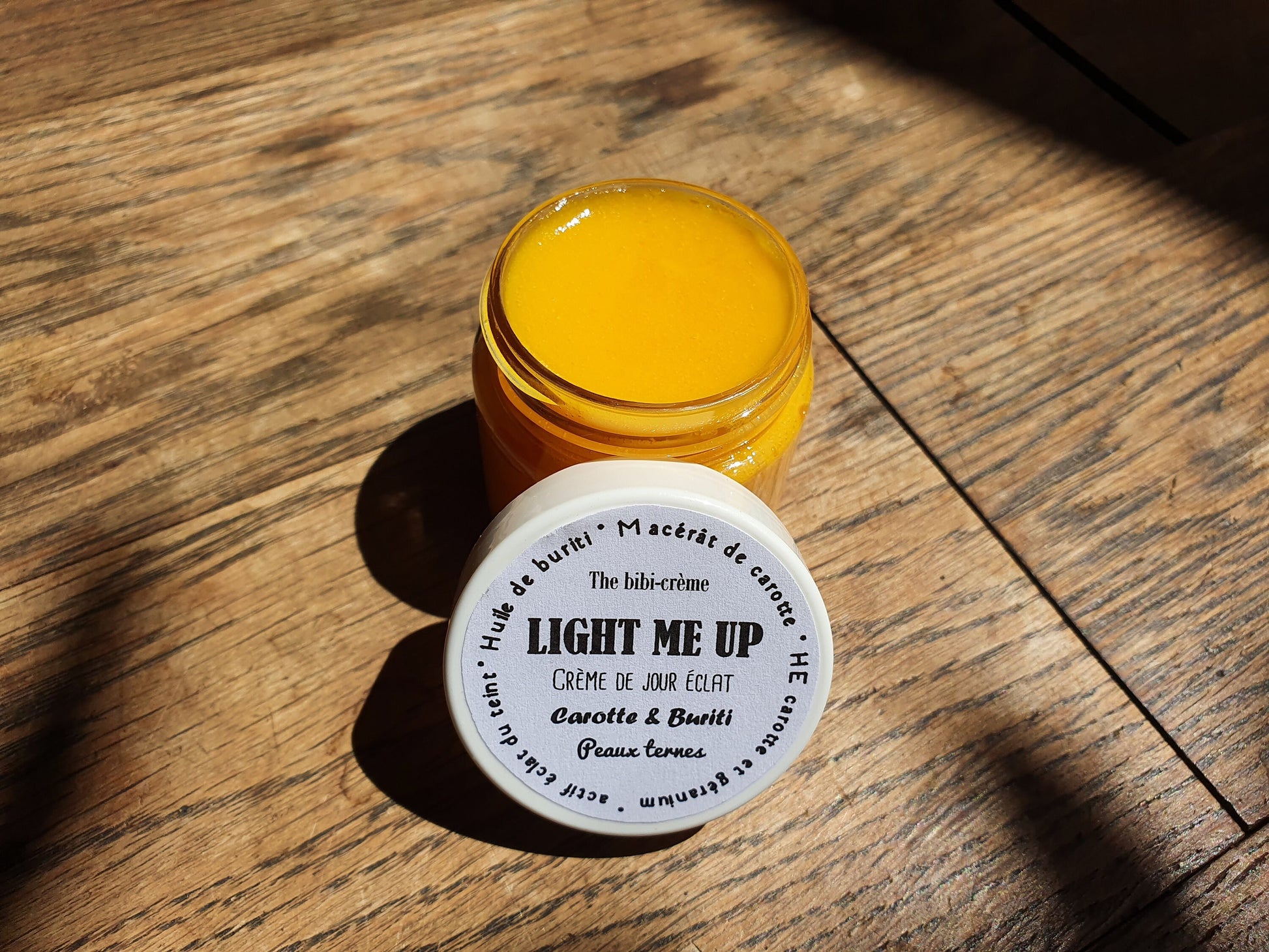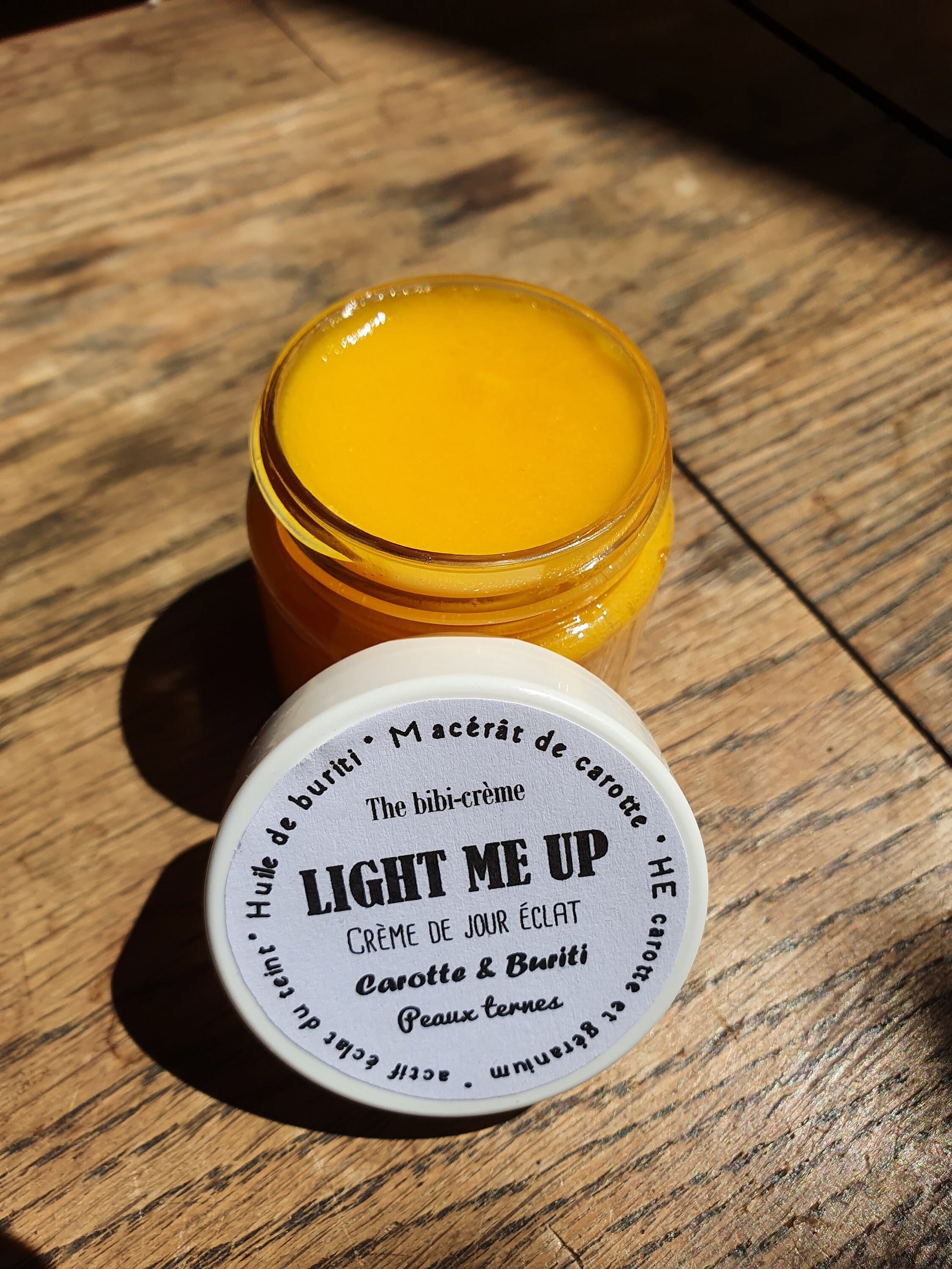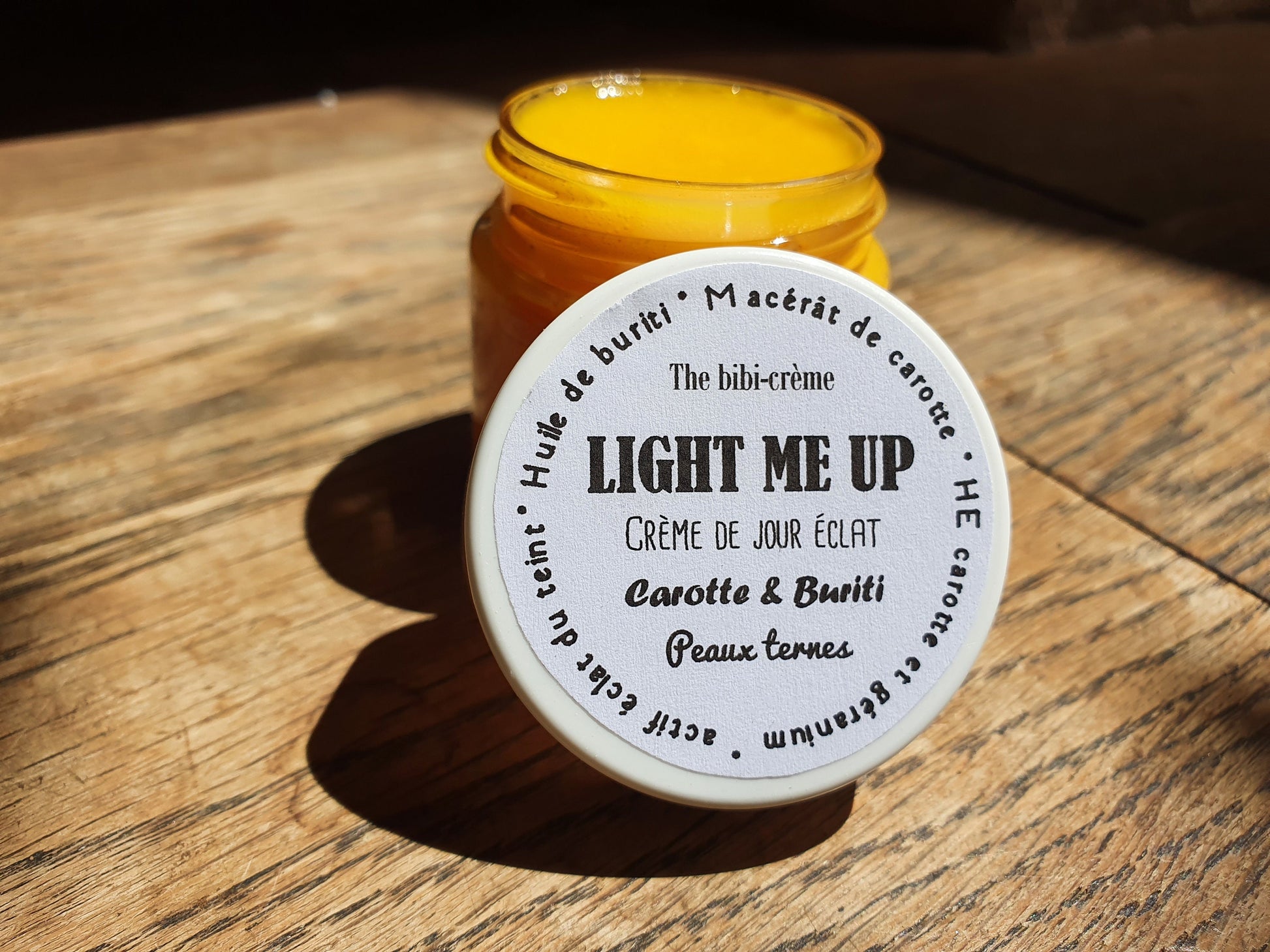 La "Light me up", crème de jour éclat du teint à l'huile de buriti, au macérât de carotte et huile essentielle de géranium peaux ternes