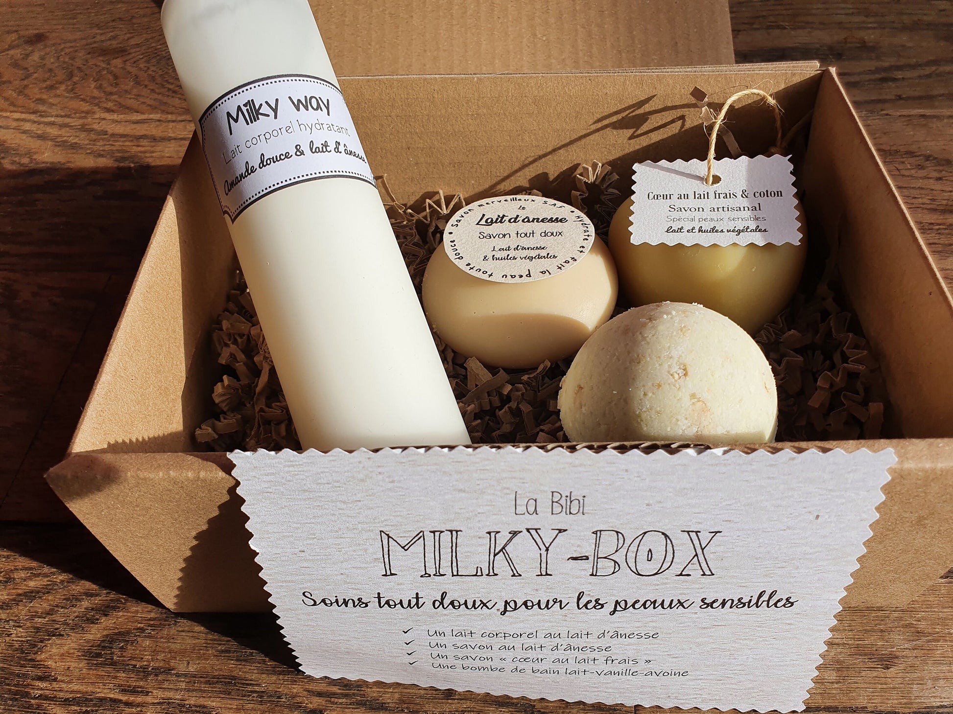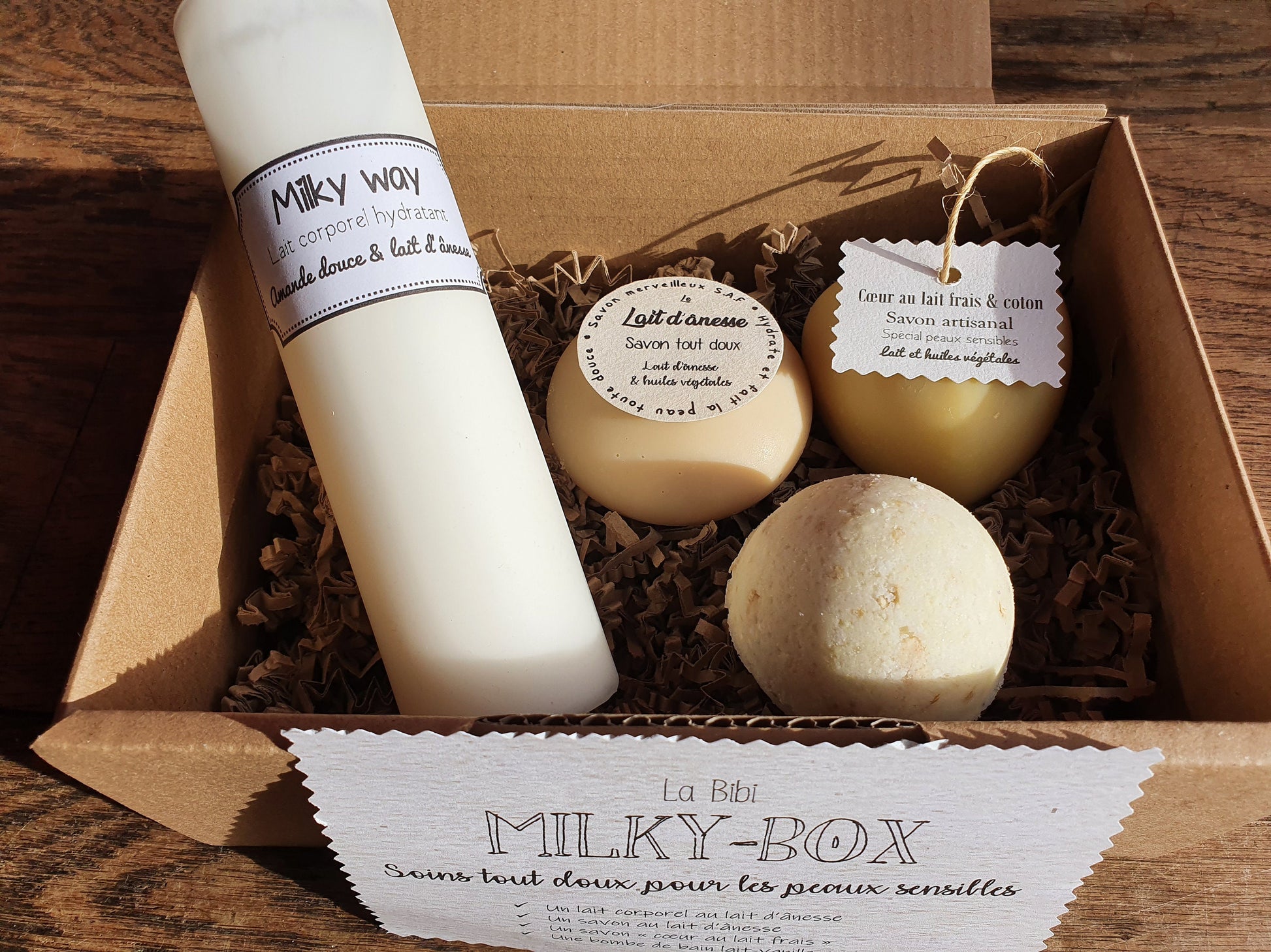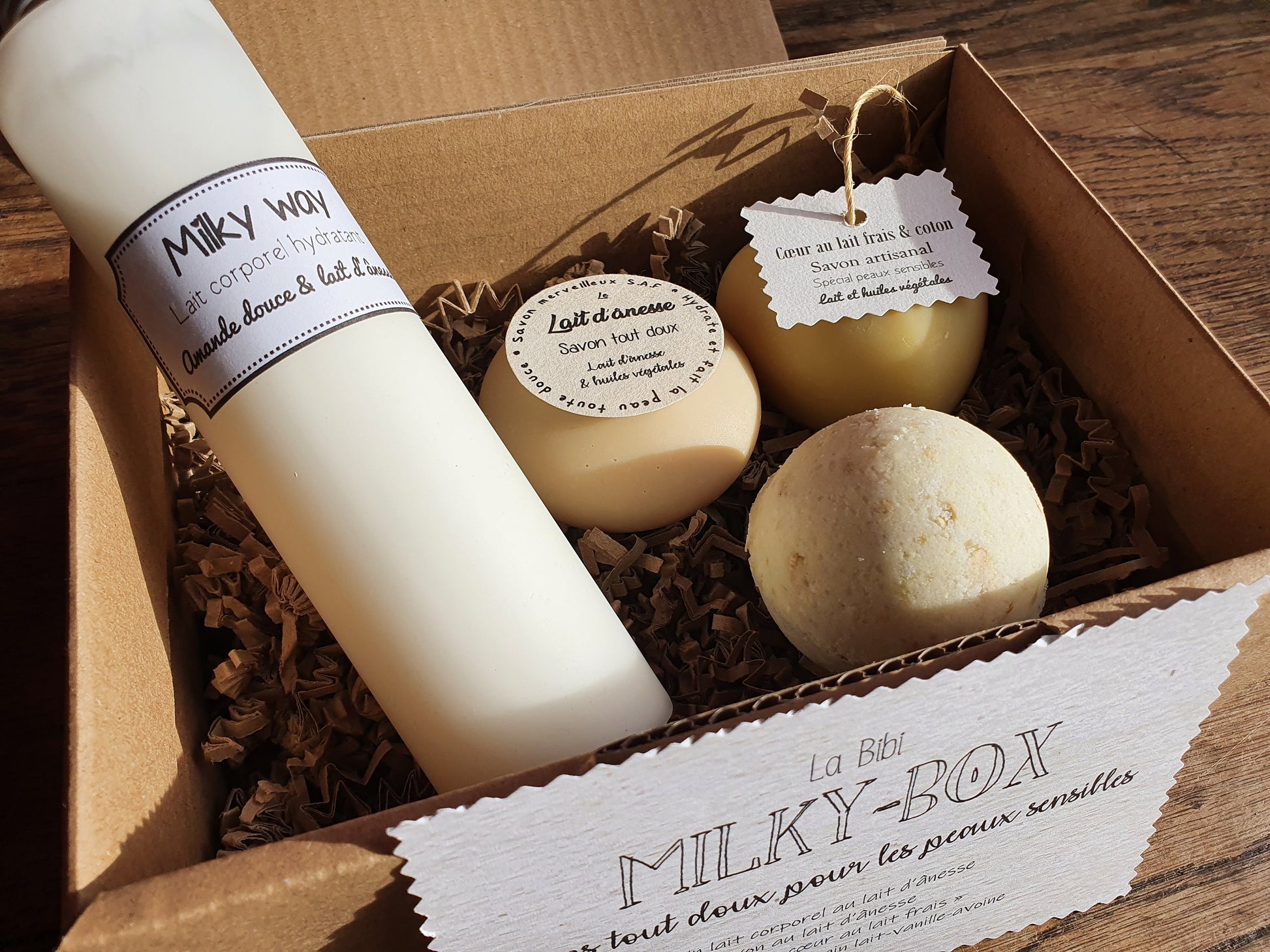 La "Milky-box", coffret ou boîte cadeau de soins complets au lait pour les peaux en manque de douceur et d'hydratation