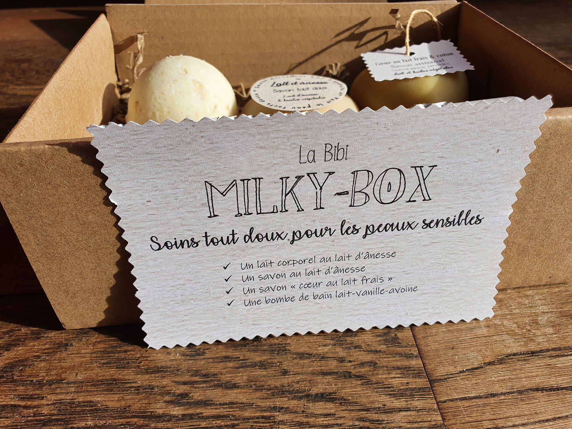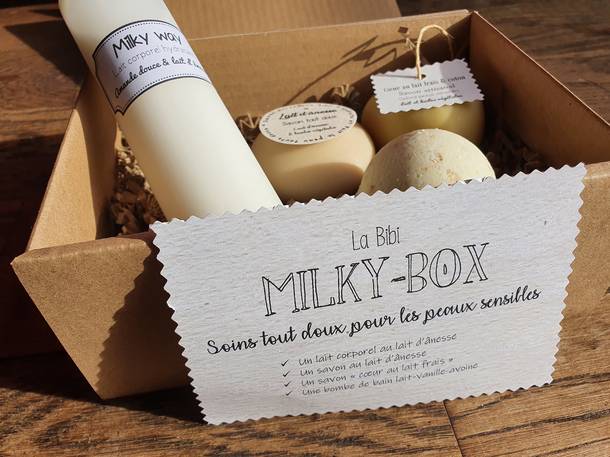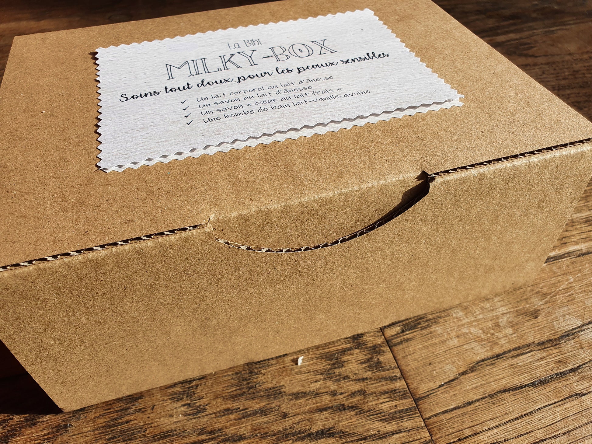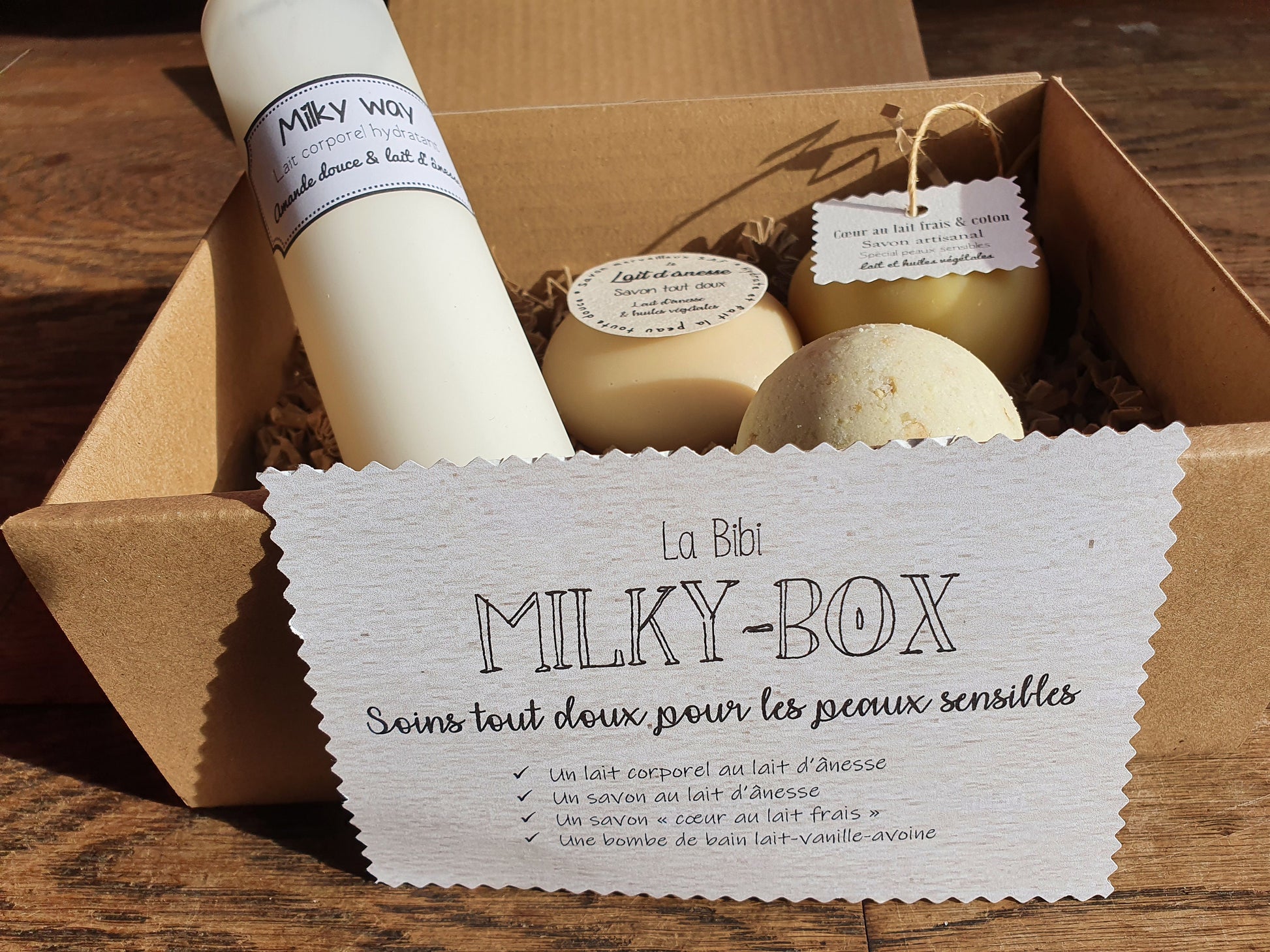 La "Milky-box", coffret ou boîte cadeau de soins complets au lait pour les peaux en manque de douceur et d'hydratation