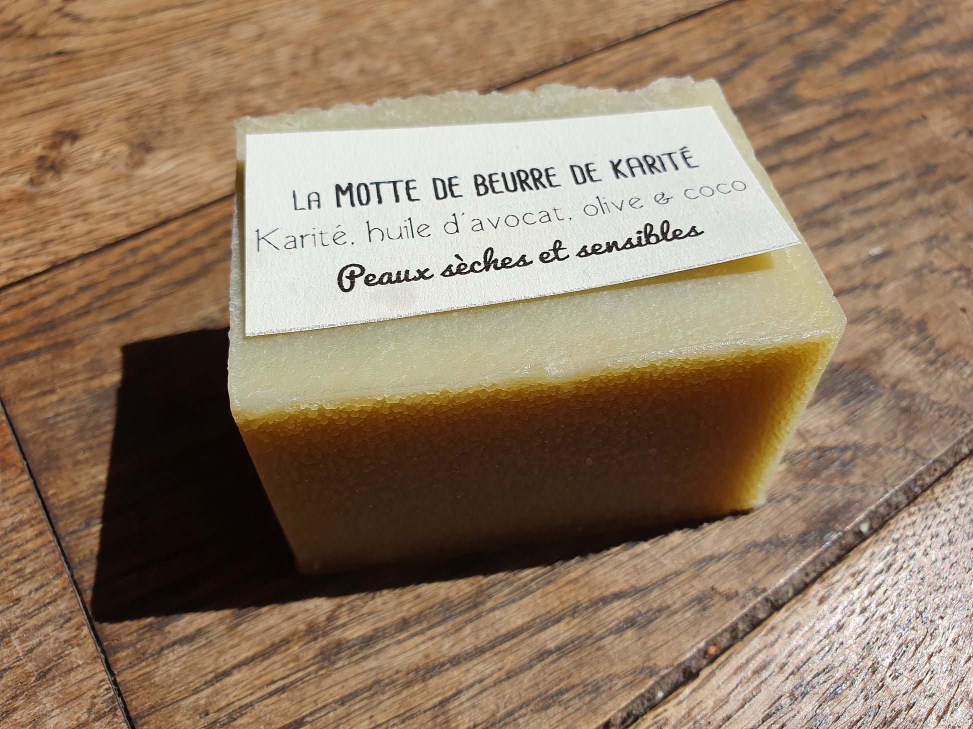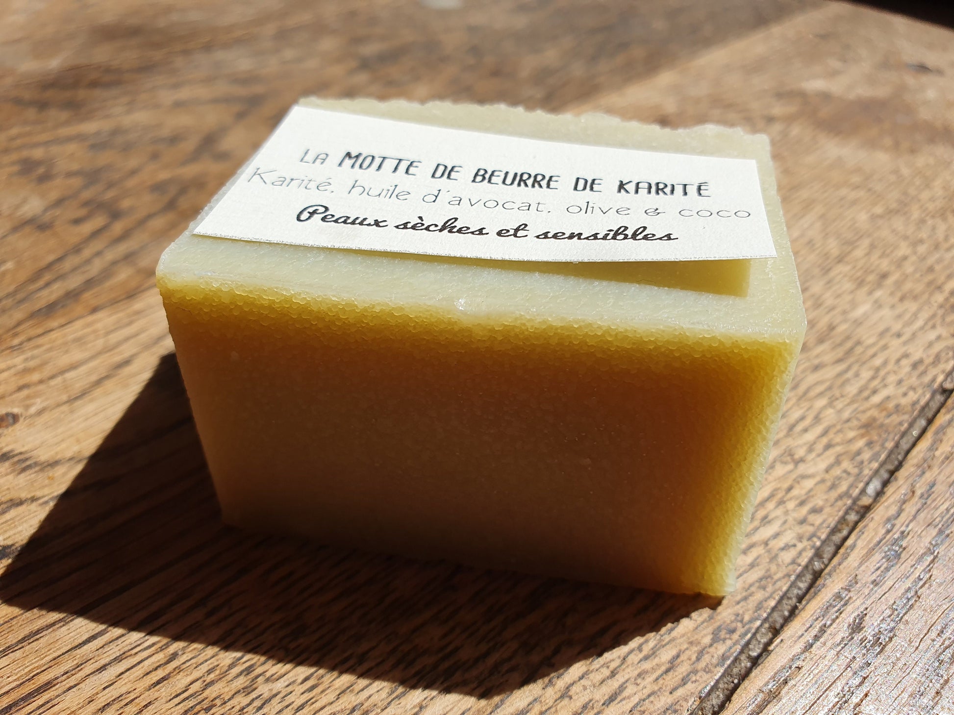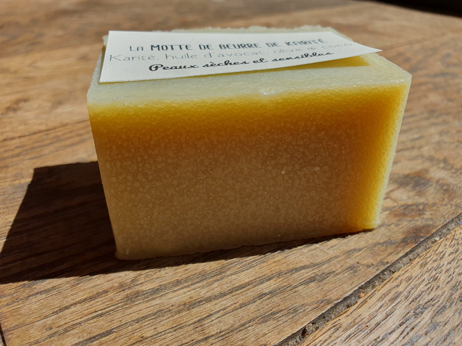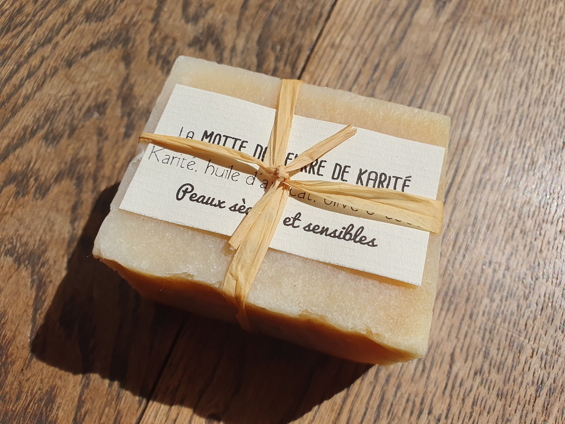 La "Motte de beurre de karité", savon artisanal surgras saponifié à froid au karité et huiles végétales d'olive, avocat et coco pour les peaux sèches et sensibles
