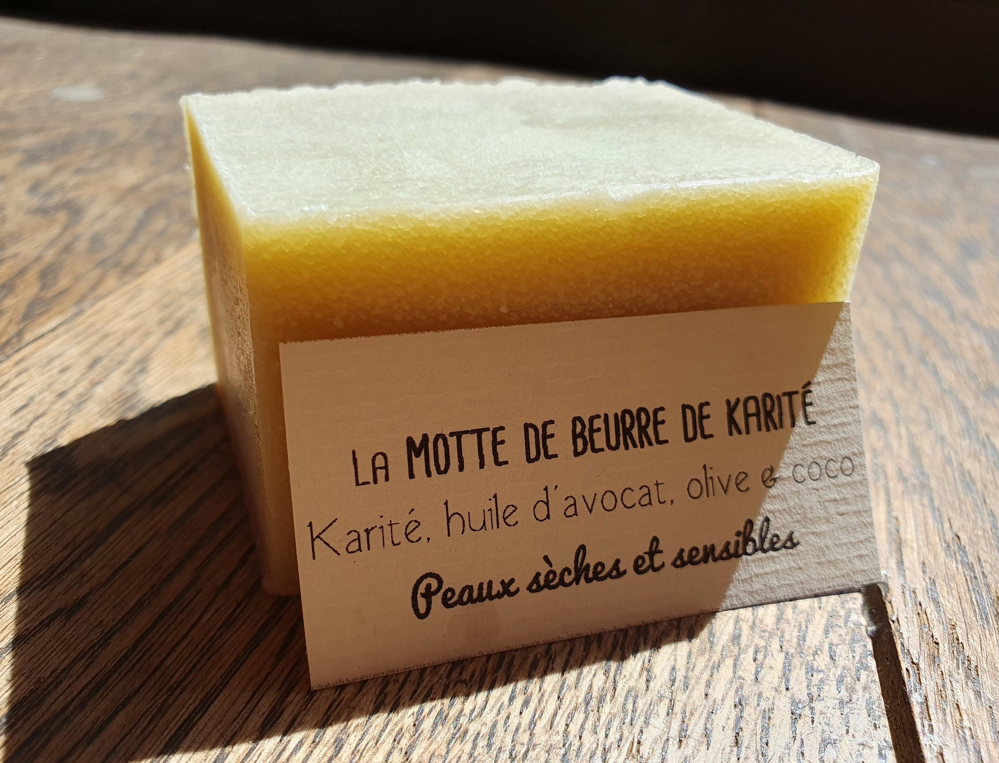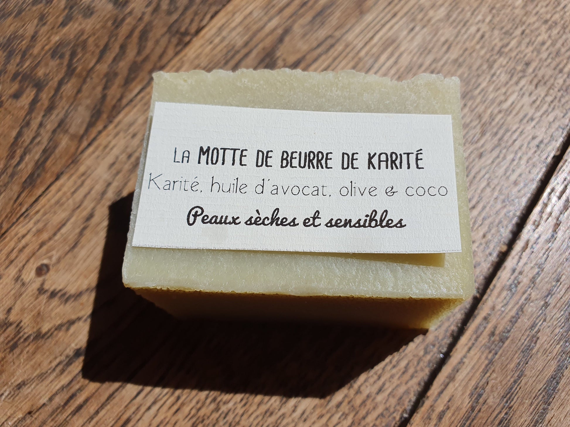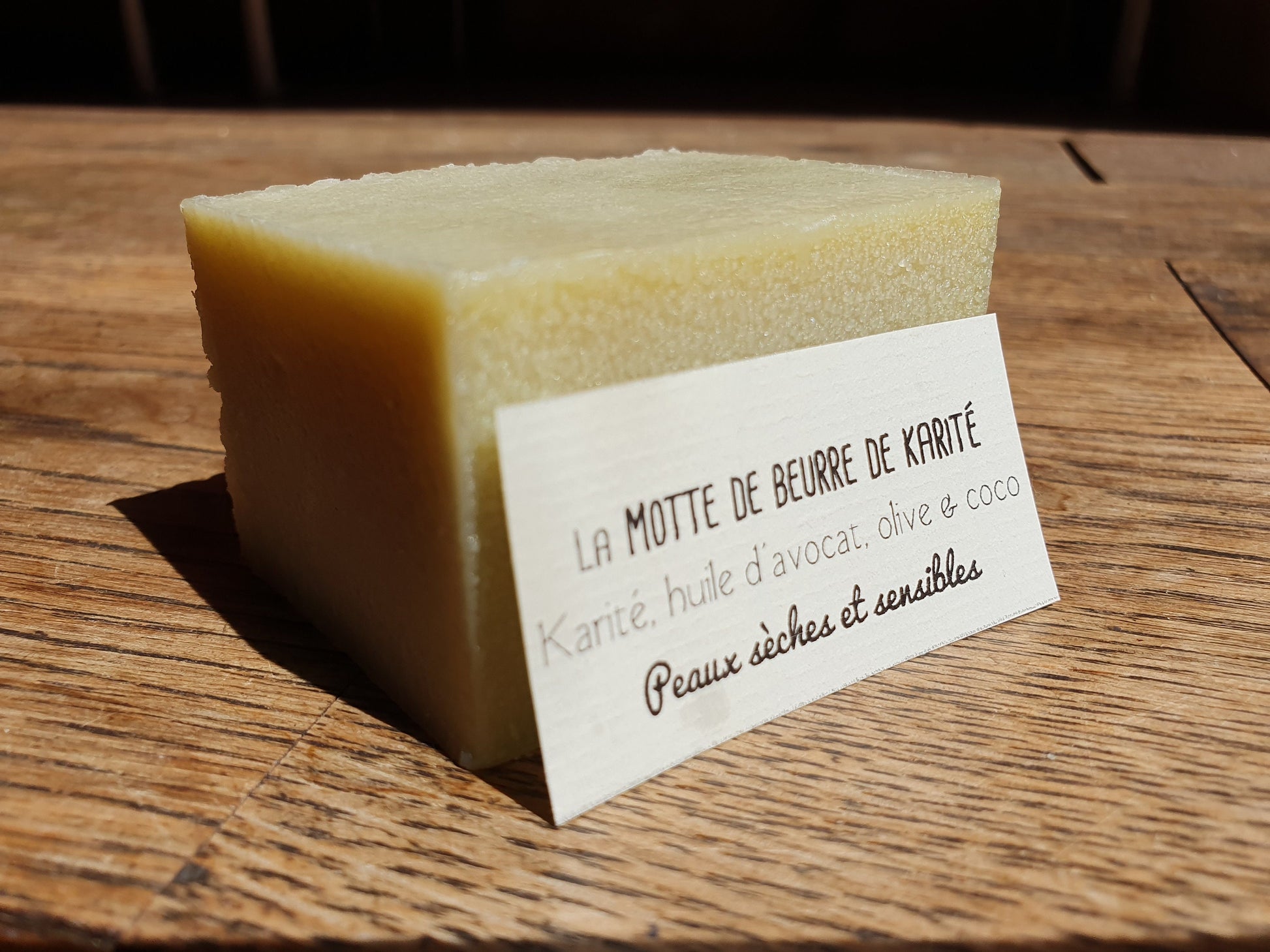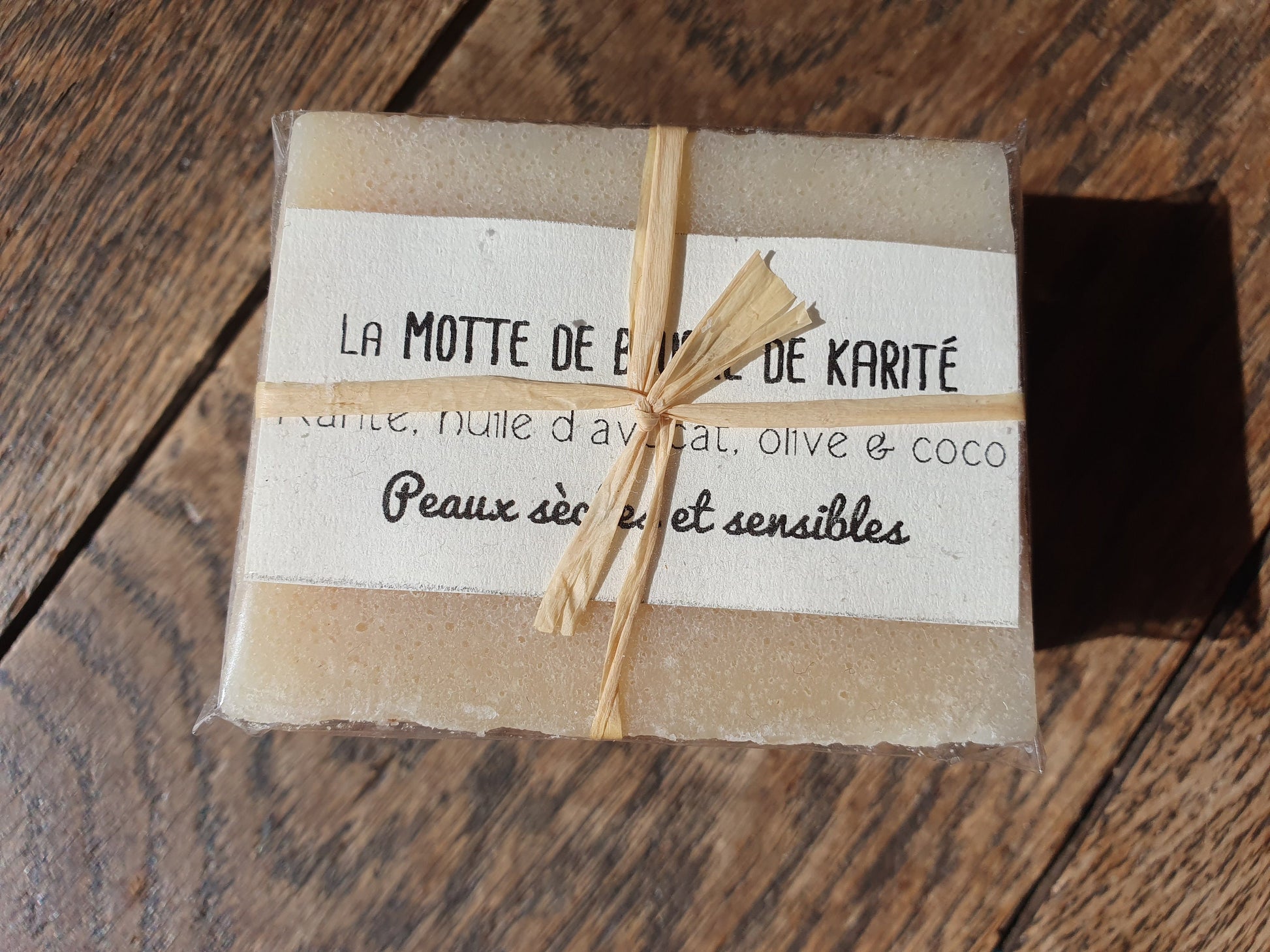 La "Motte de beurre de karité", savon artisanal surgras saponifié à froid au karité et huiles végétales d'olive, avocat et coco pour les peaux sèches et sensibles