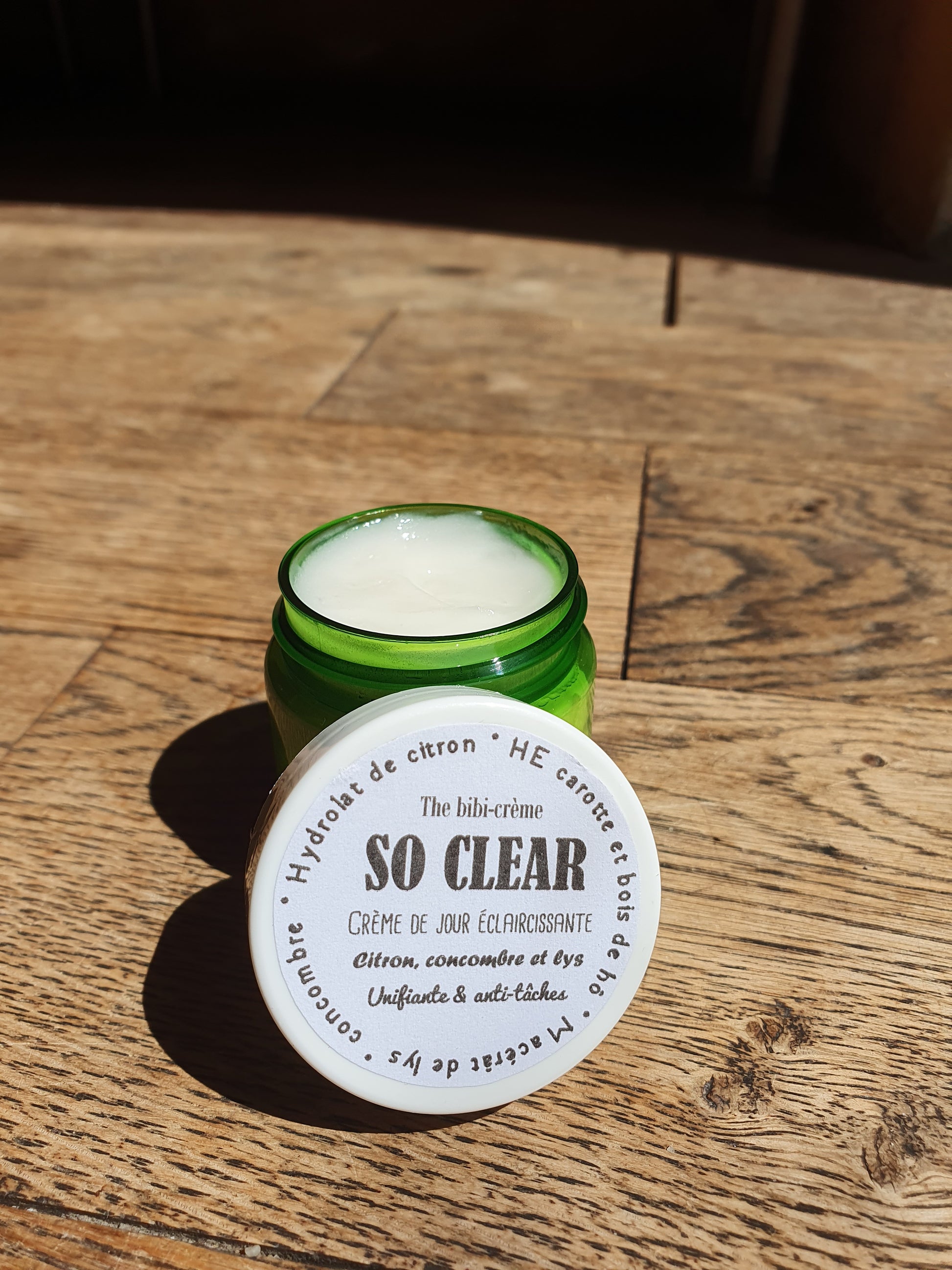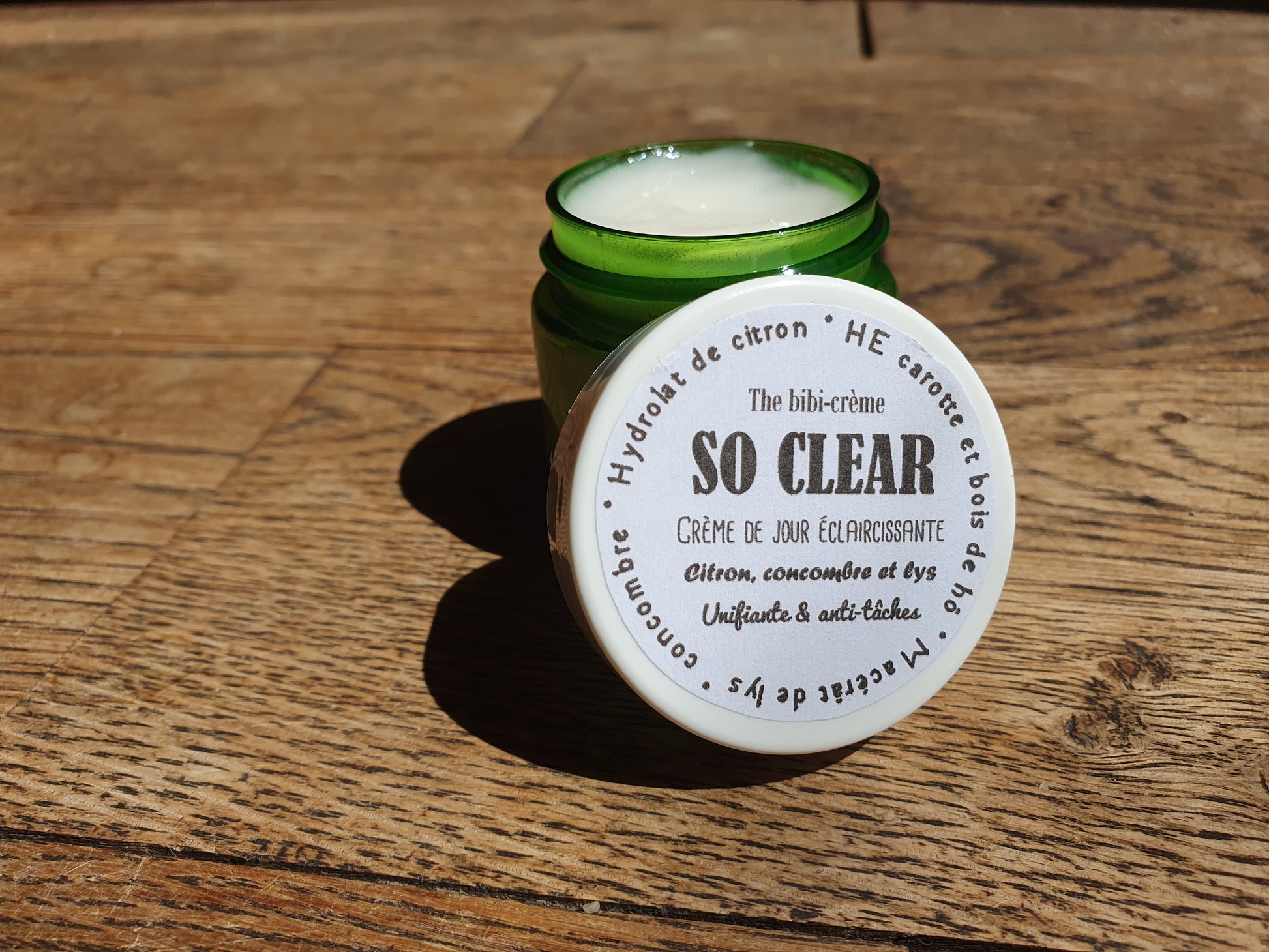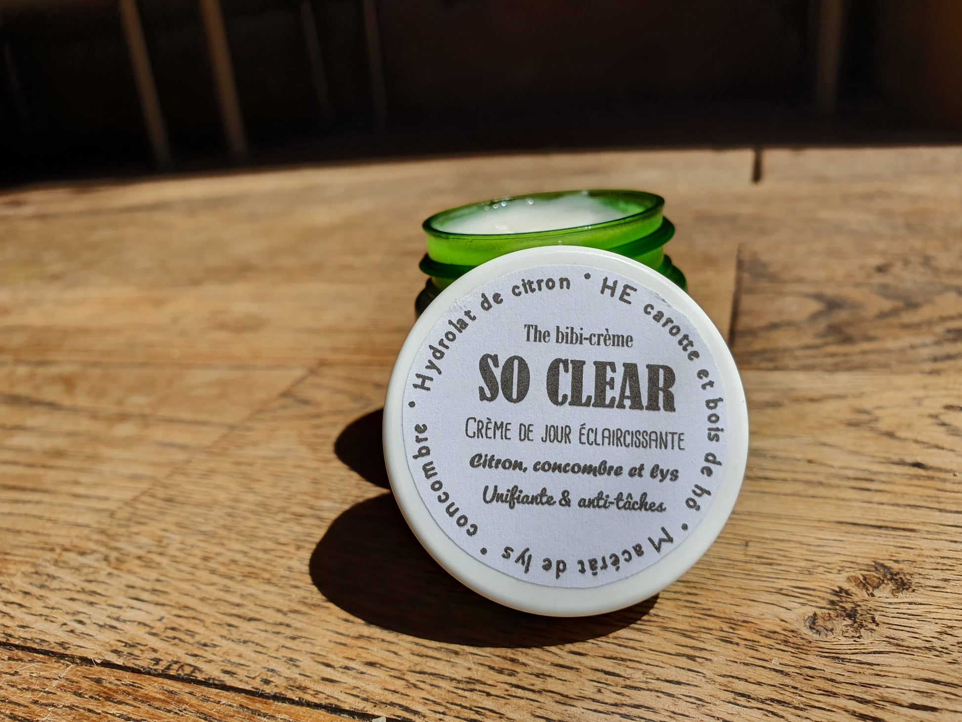 La "So Clear", crème de jour hydratante éclaircissante à l'huile de lys, concombre, huile essentielle de carotte et de citron