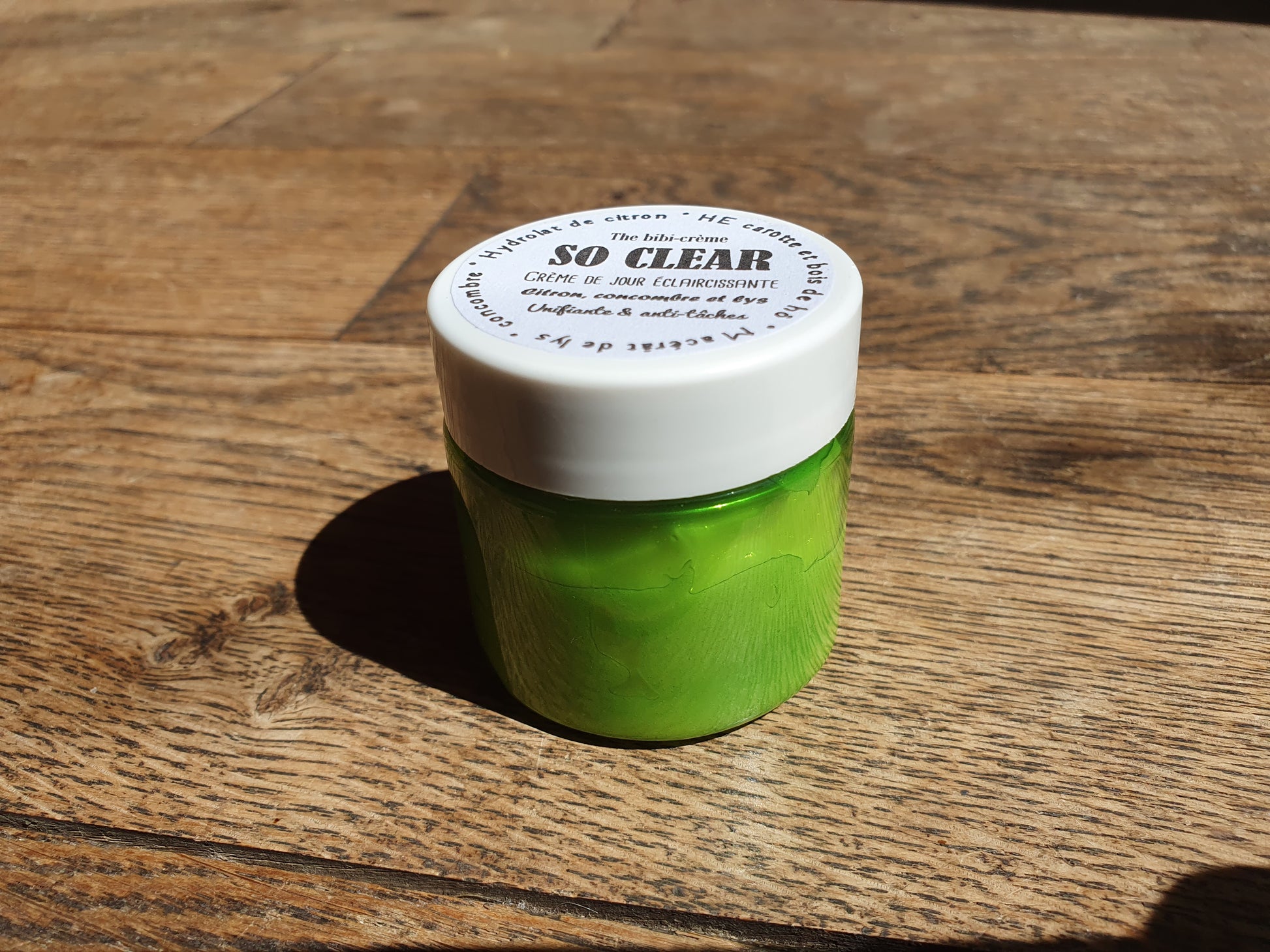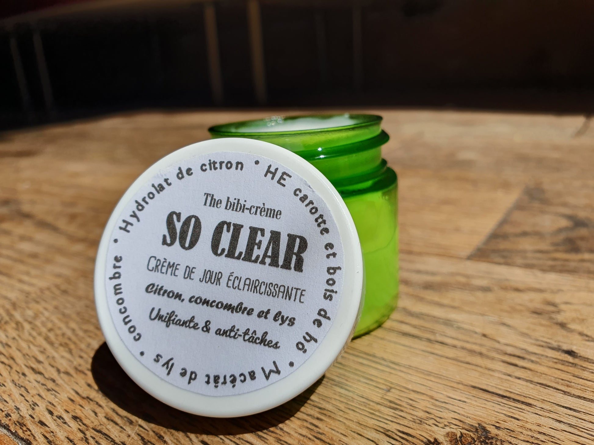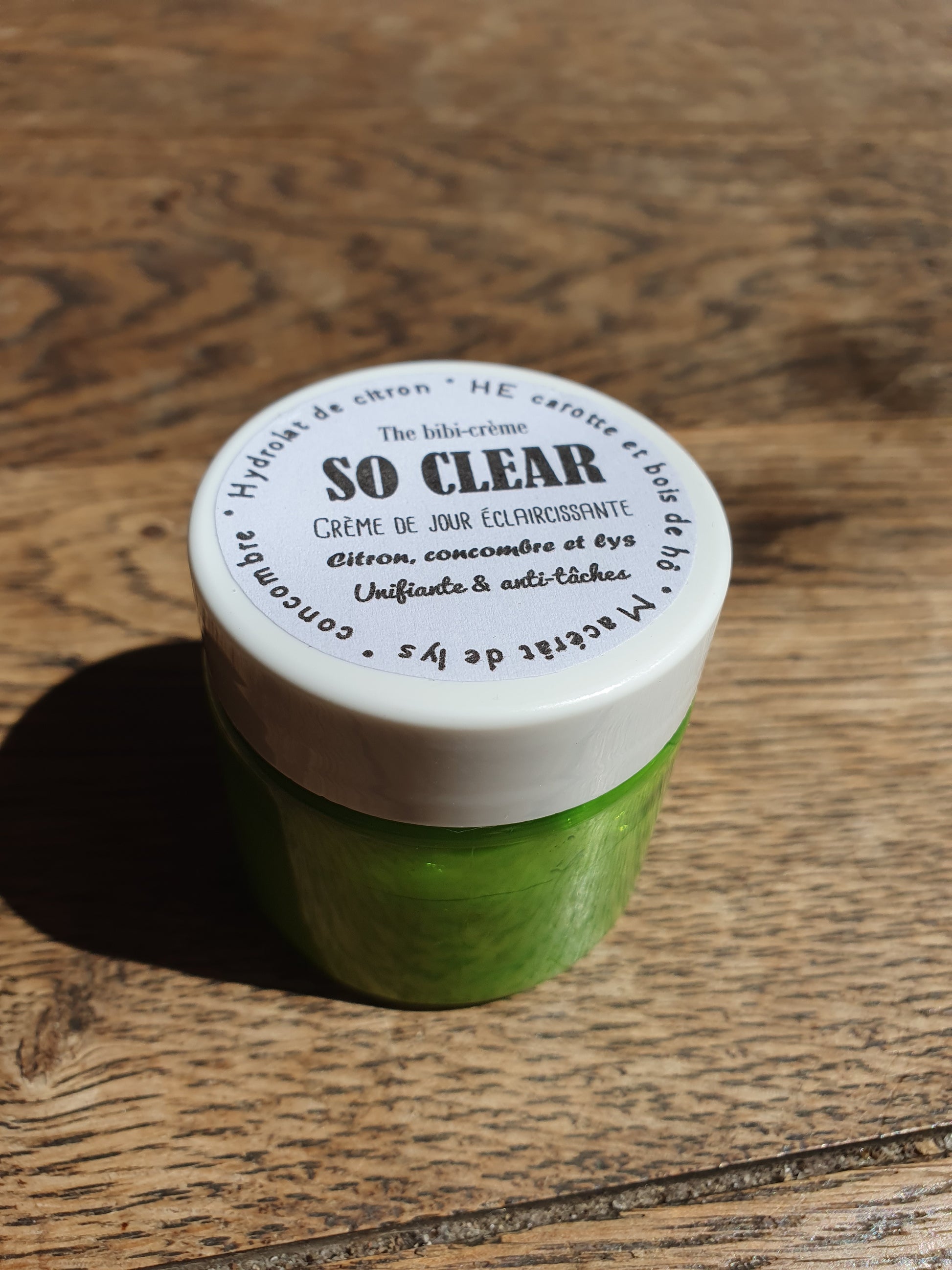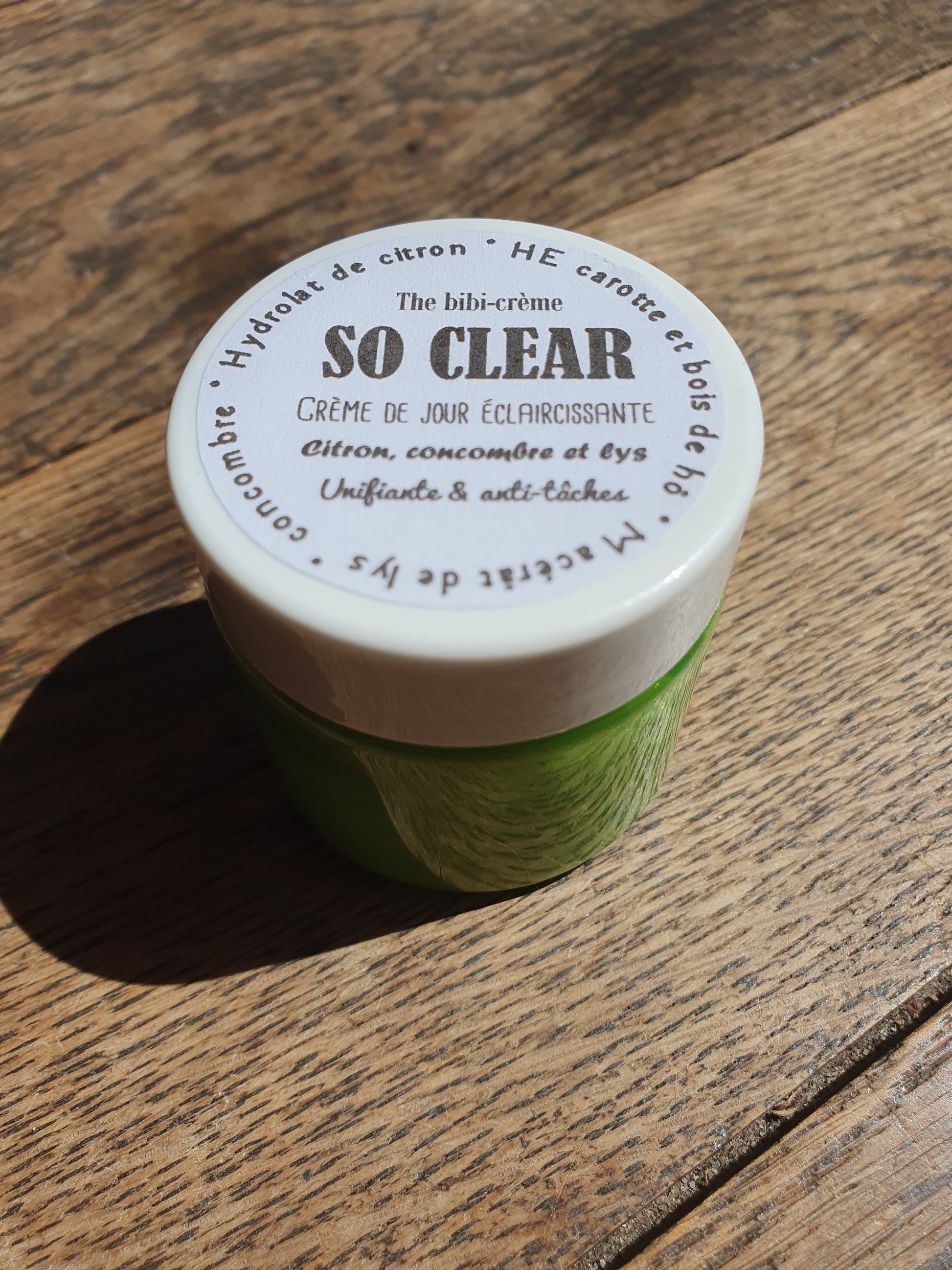 La "So Clear", crème de jour hydratante éclaircissante à l'huile de lys, concombre, huile essentielle de carotte et de citron