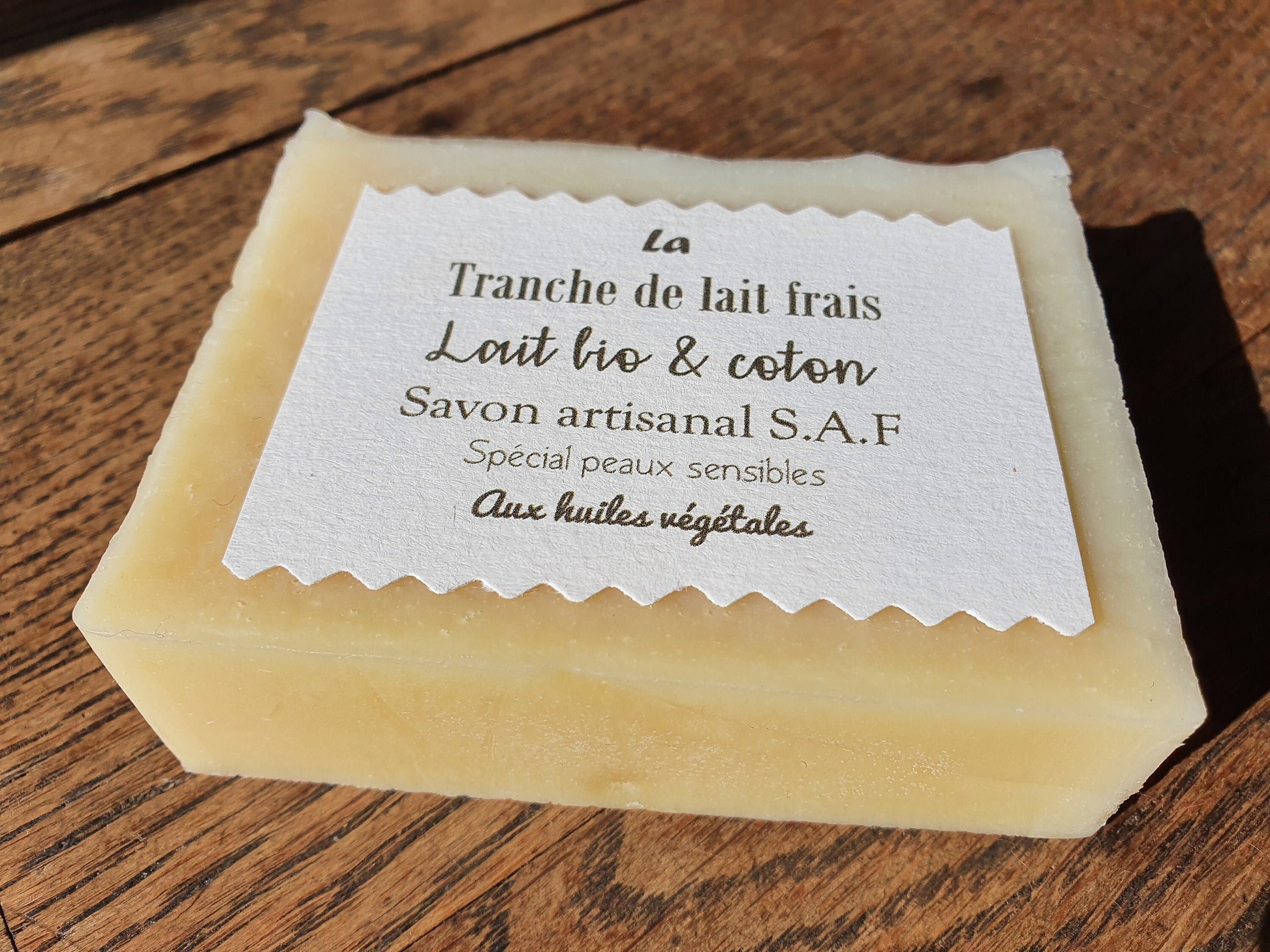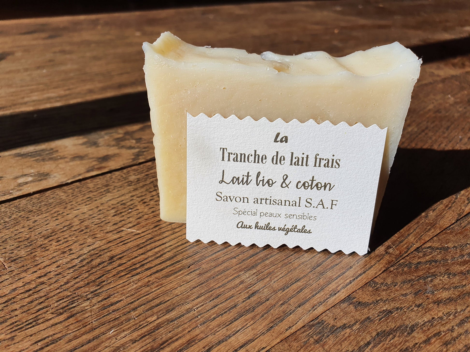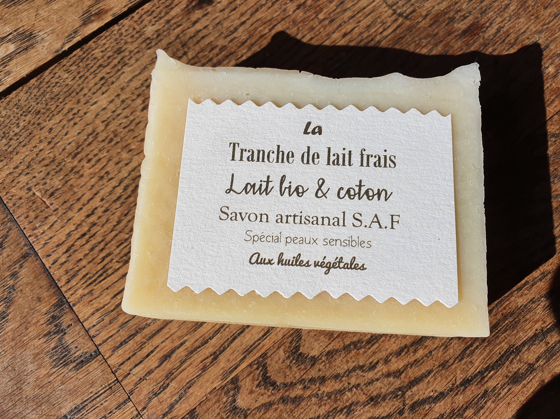 La "Tranche de lait frais", savon artisanal surgras saponifié à froid au lait bio et parfumé au coton pour les peaux fragiles et sensibles