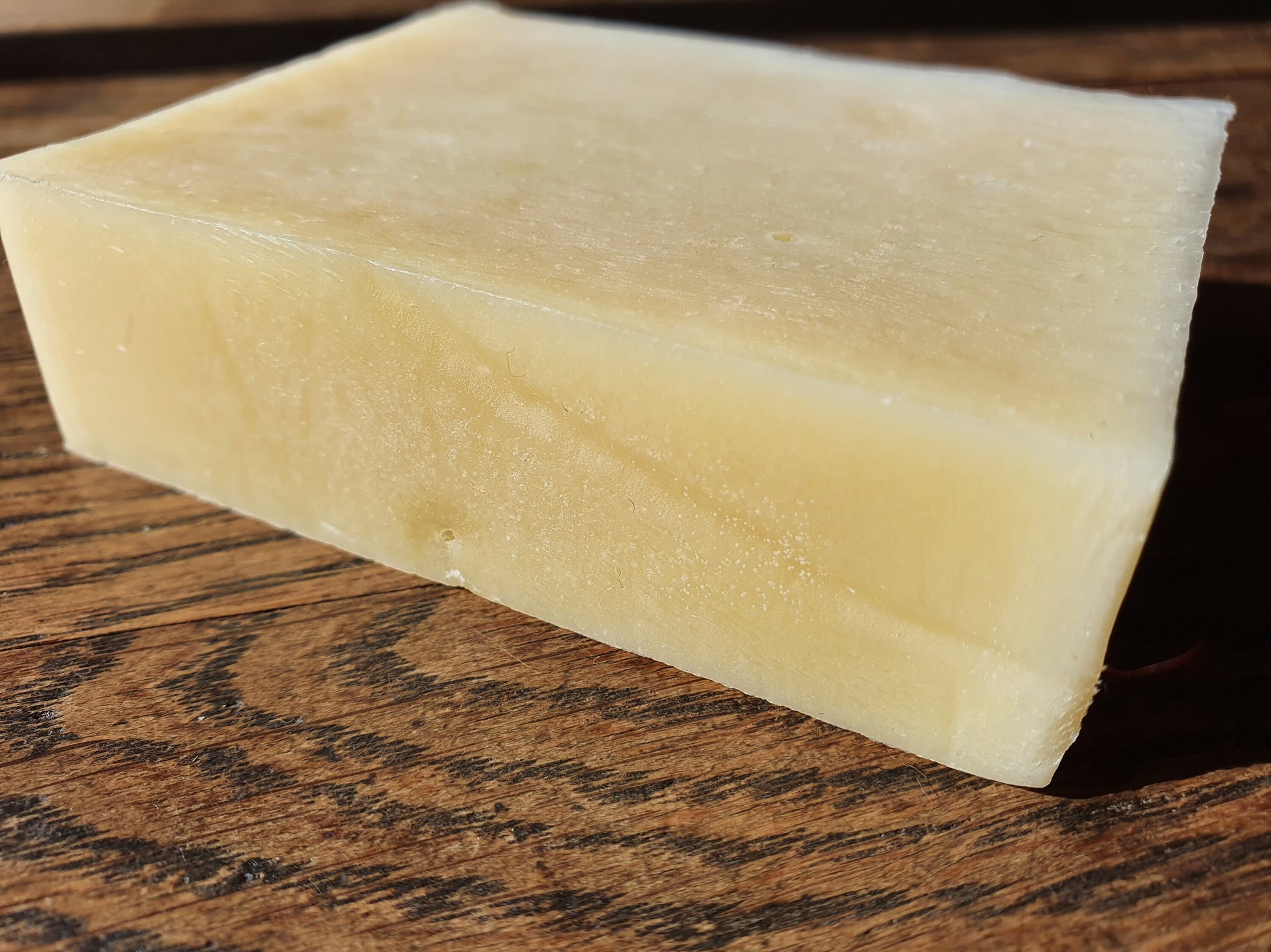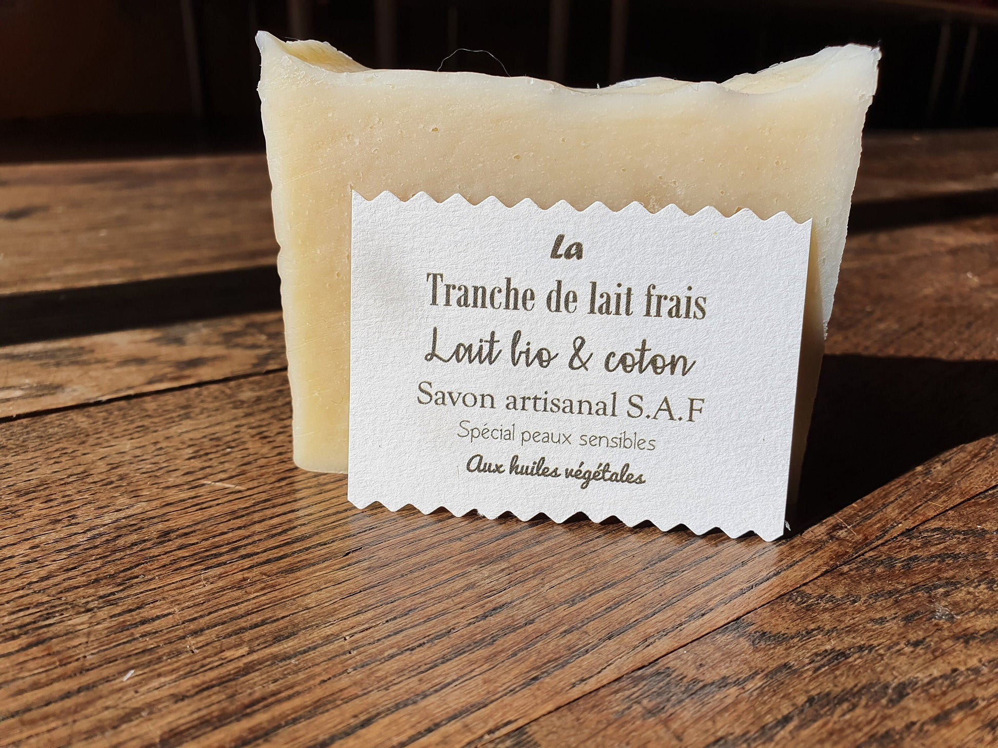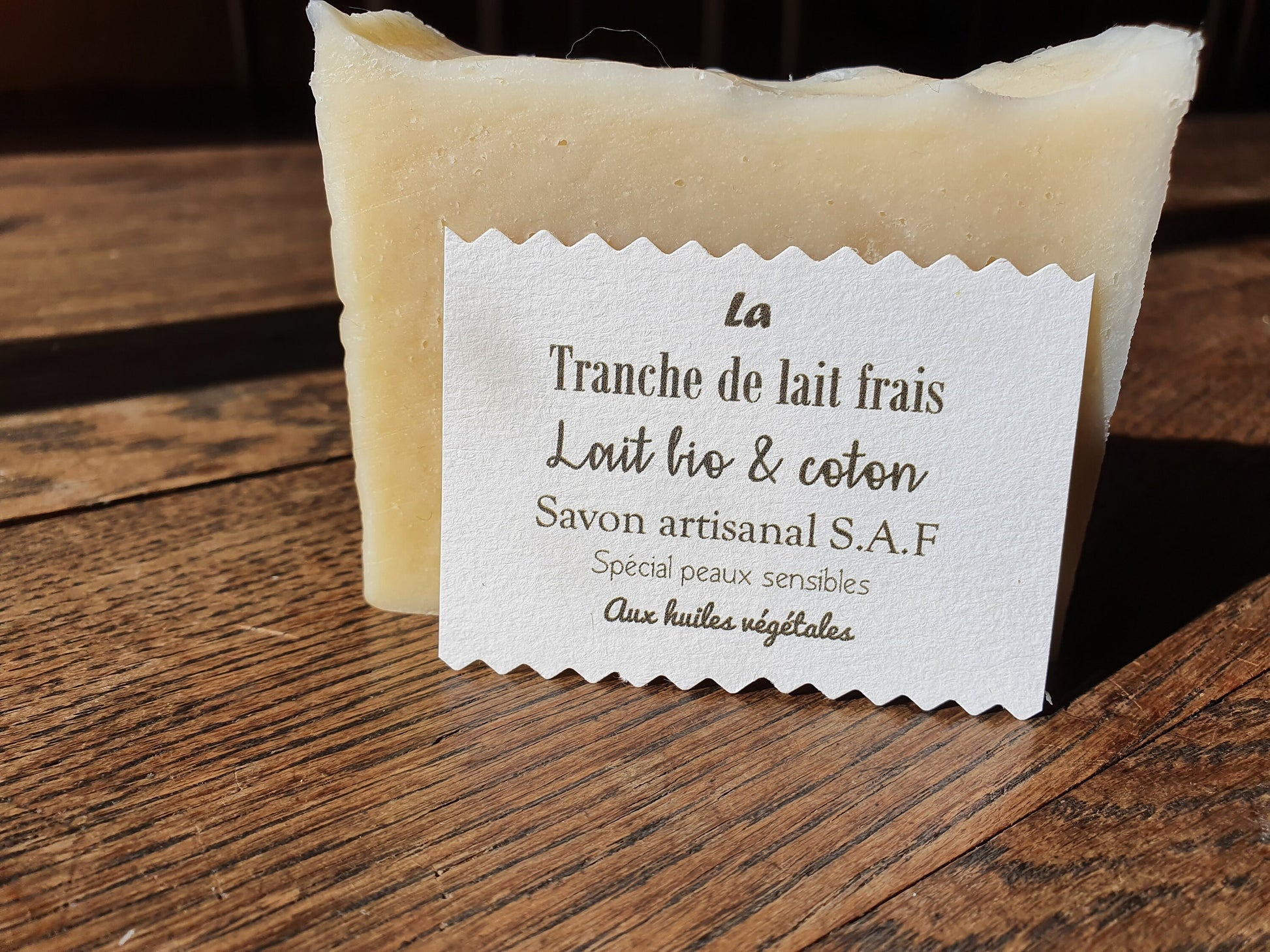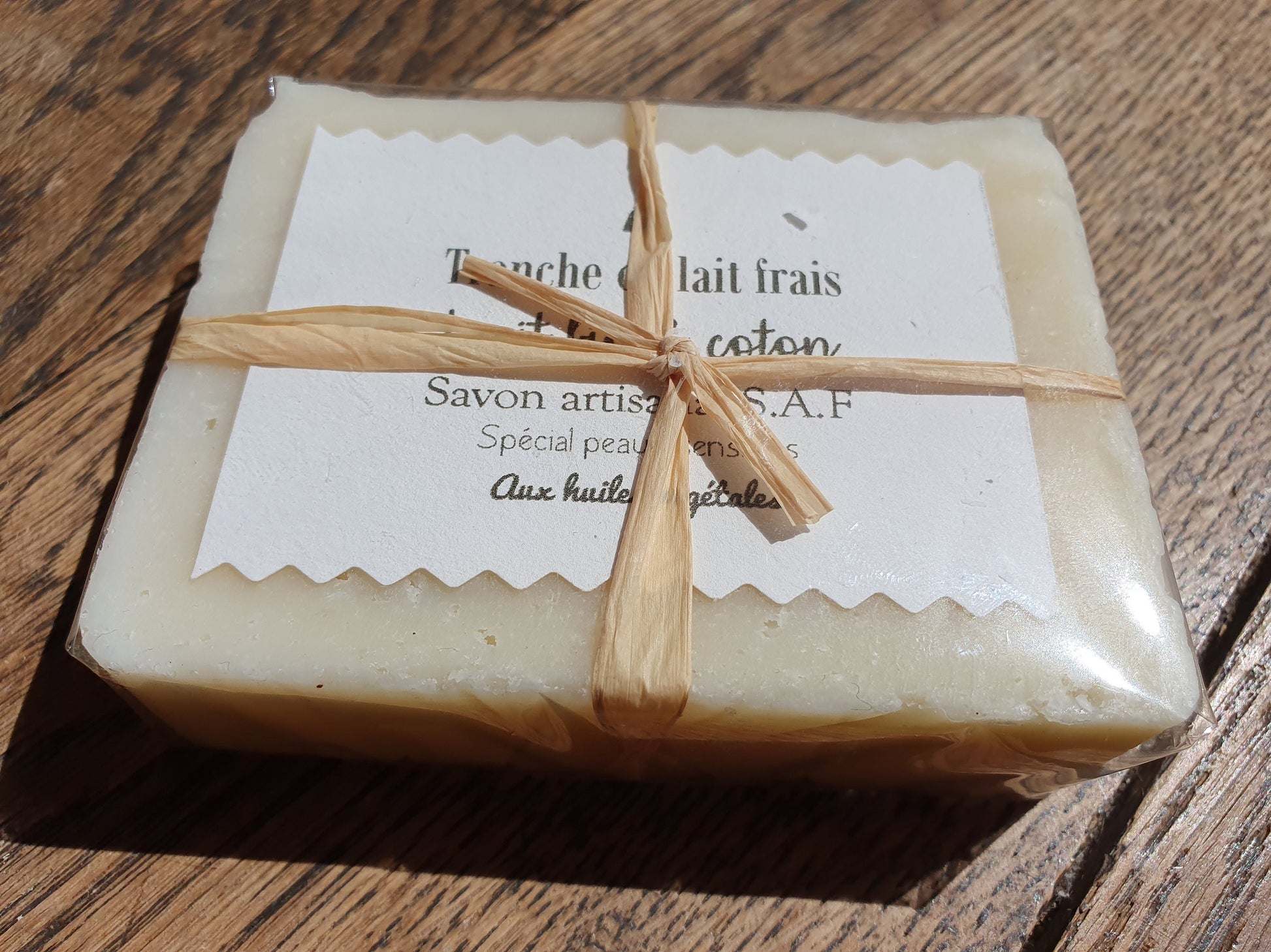 La "Tranche de lait frais", savon artisanal surgras saponifié à froid au lait bio et parfumé au coton pour les peaux fragiles et sensibles