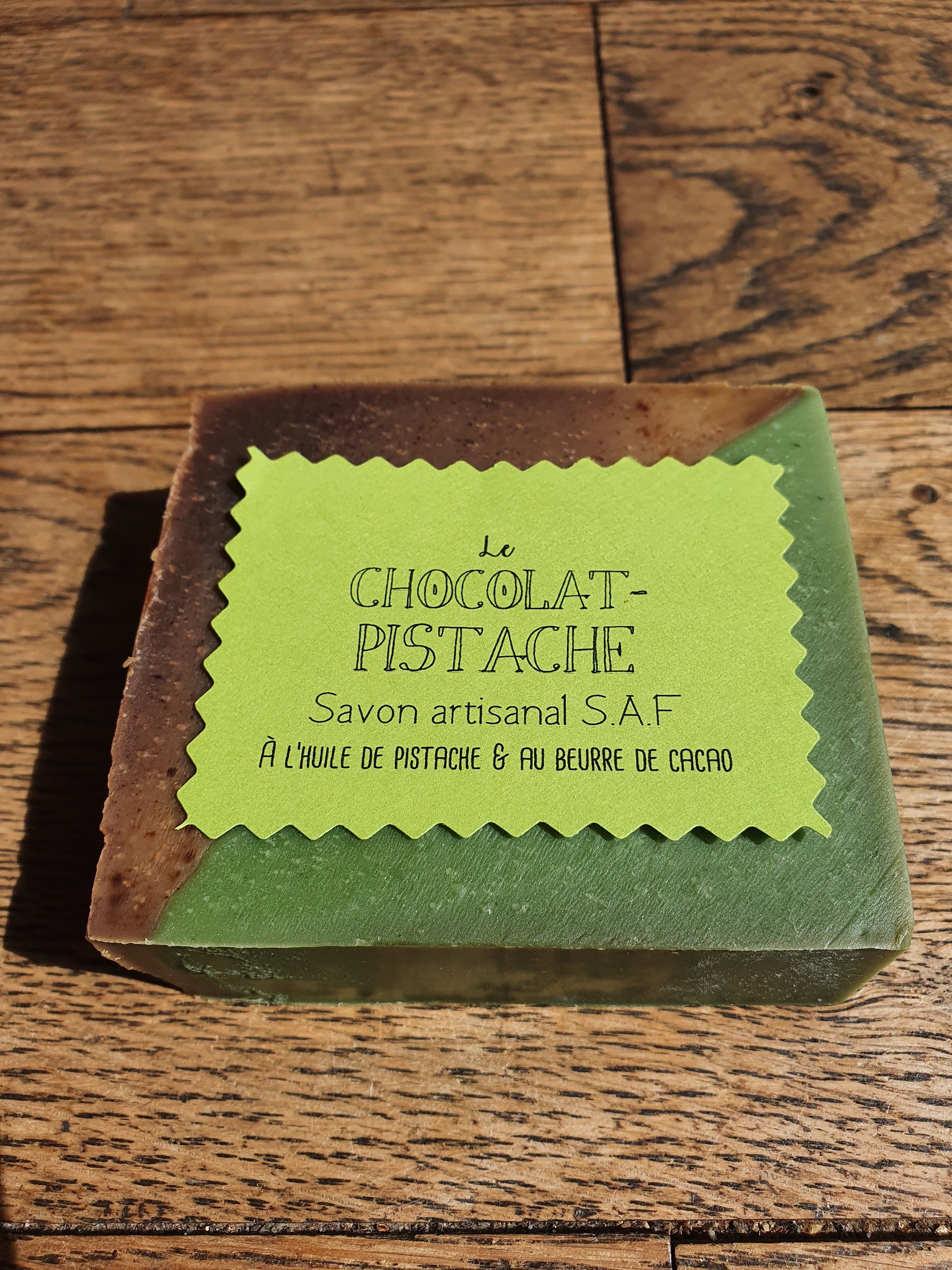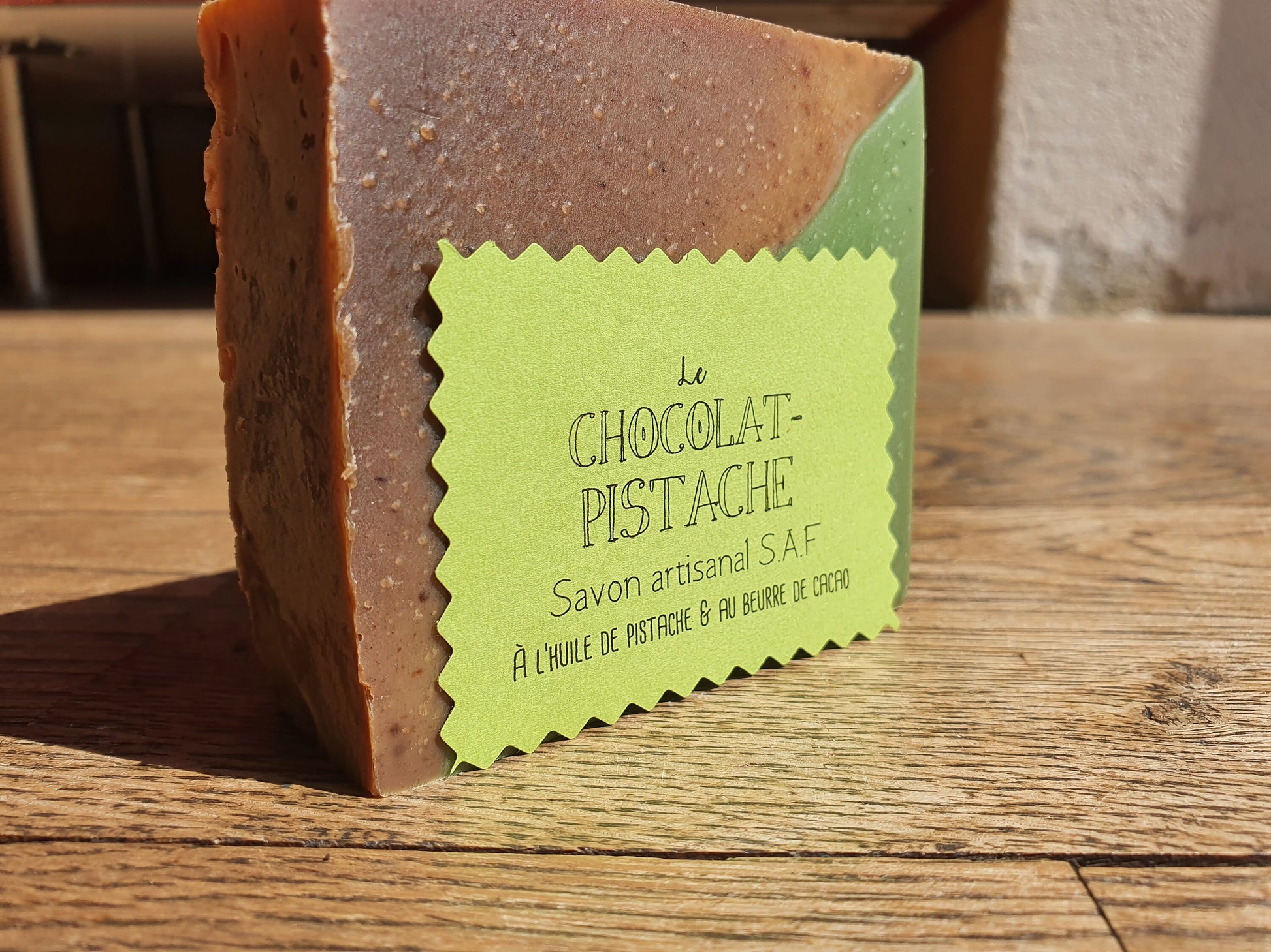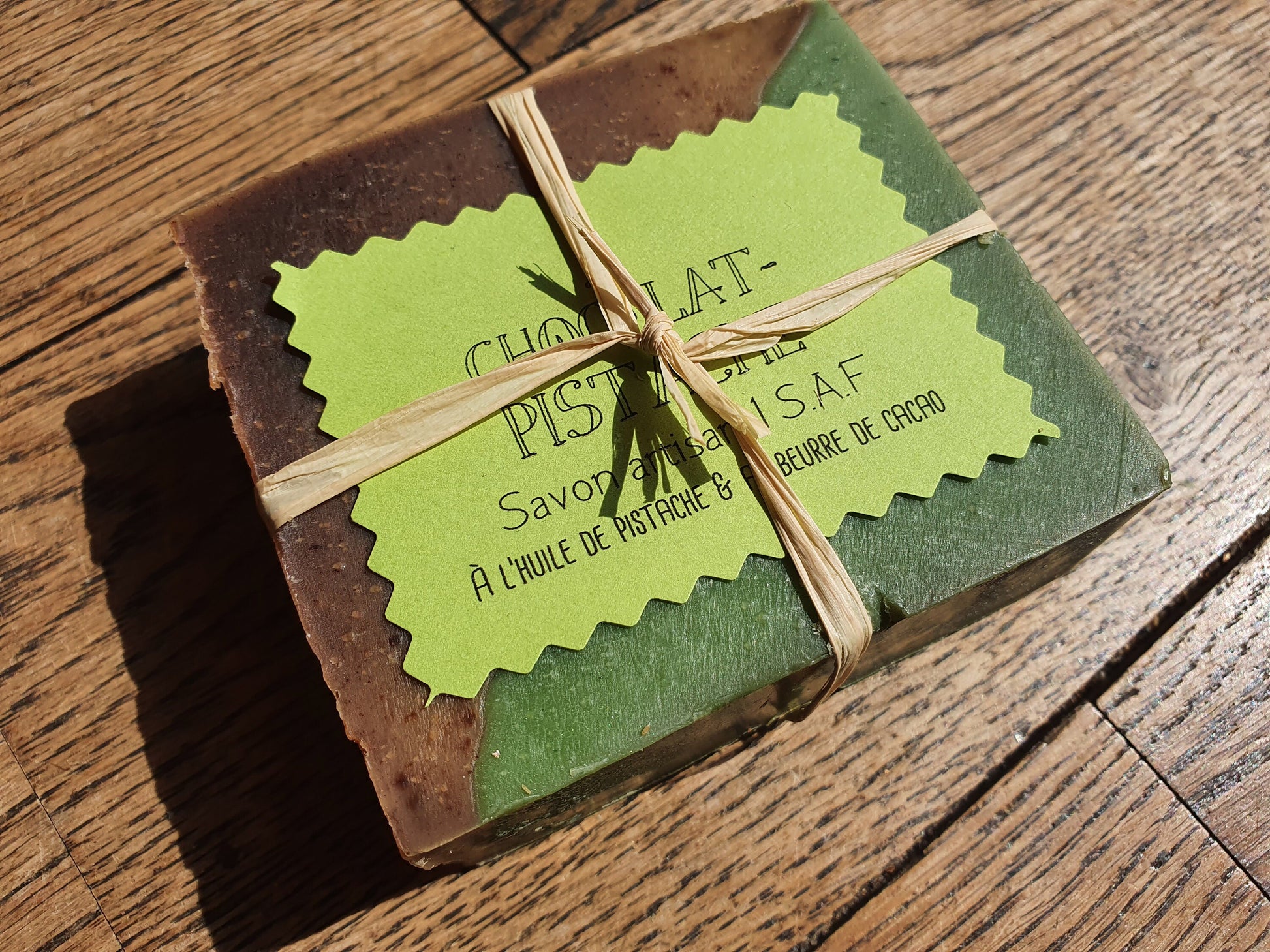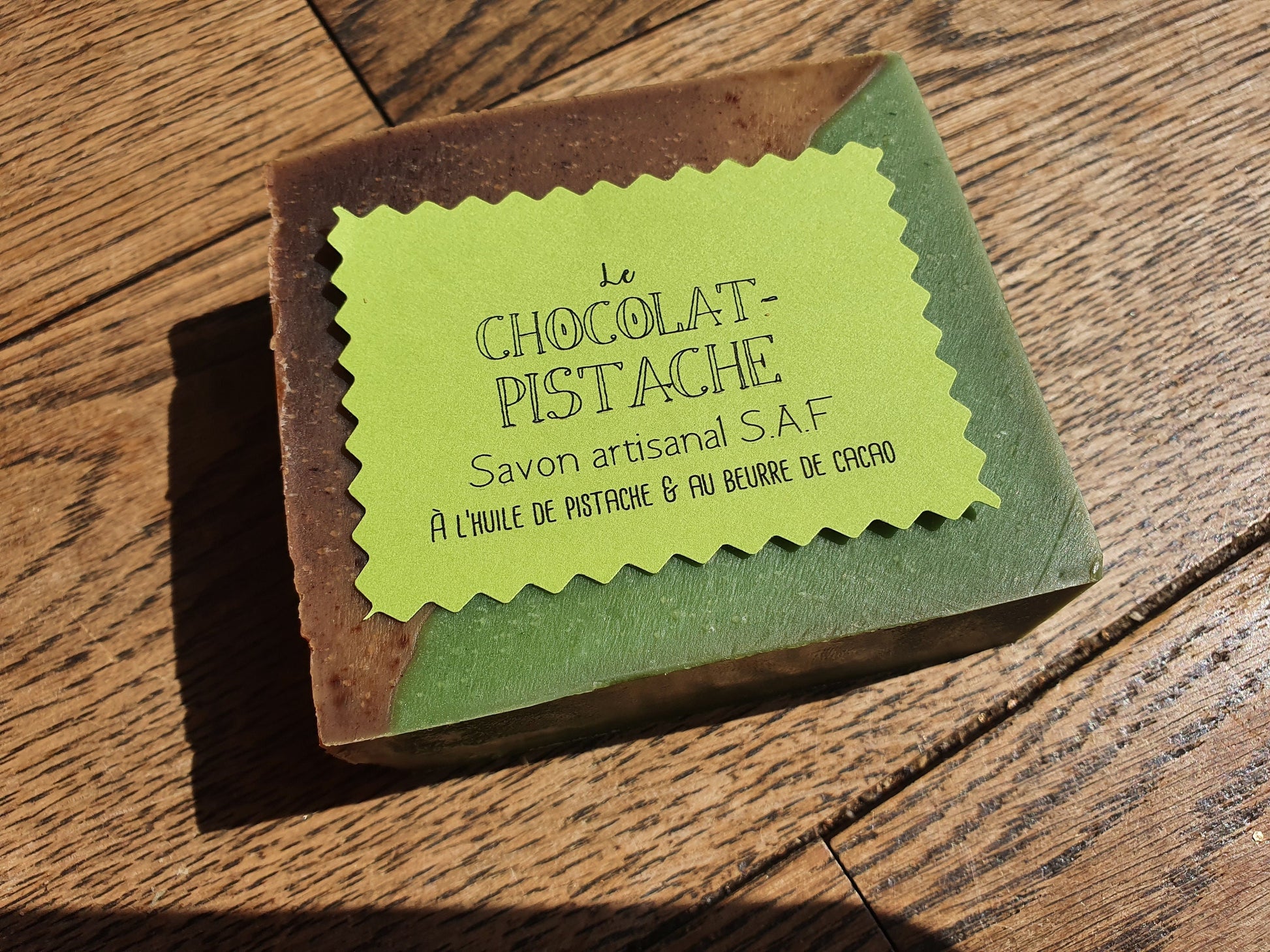 Le "Chocolat-pistache", savon artisanal surgras saponifié à froid divin à l'huile de pistache et au beurre de cacao pour les peaux gourmandes