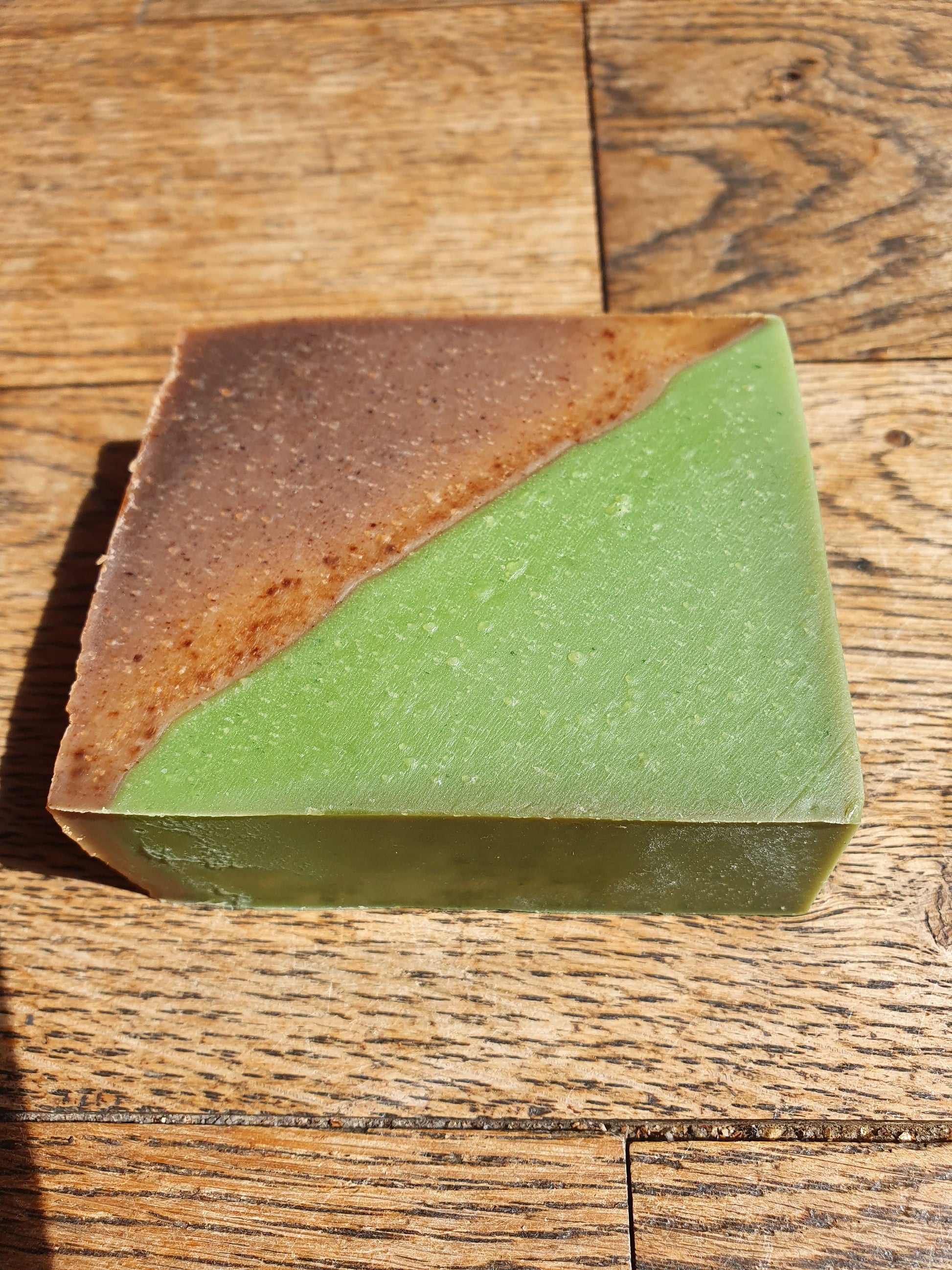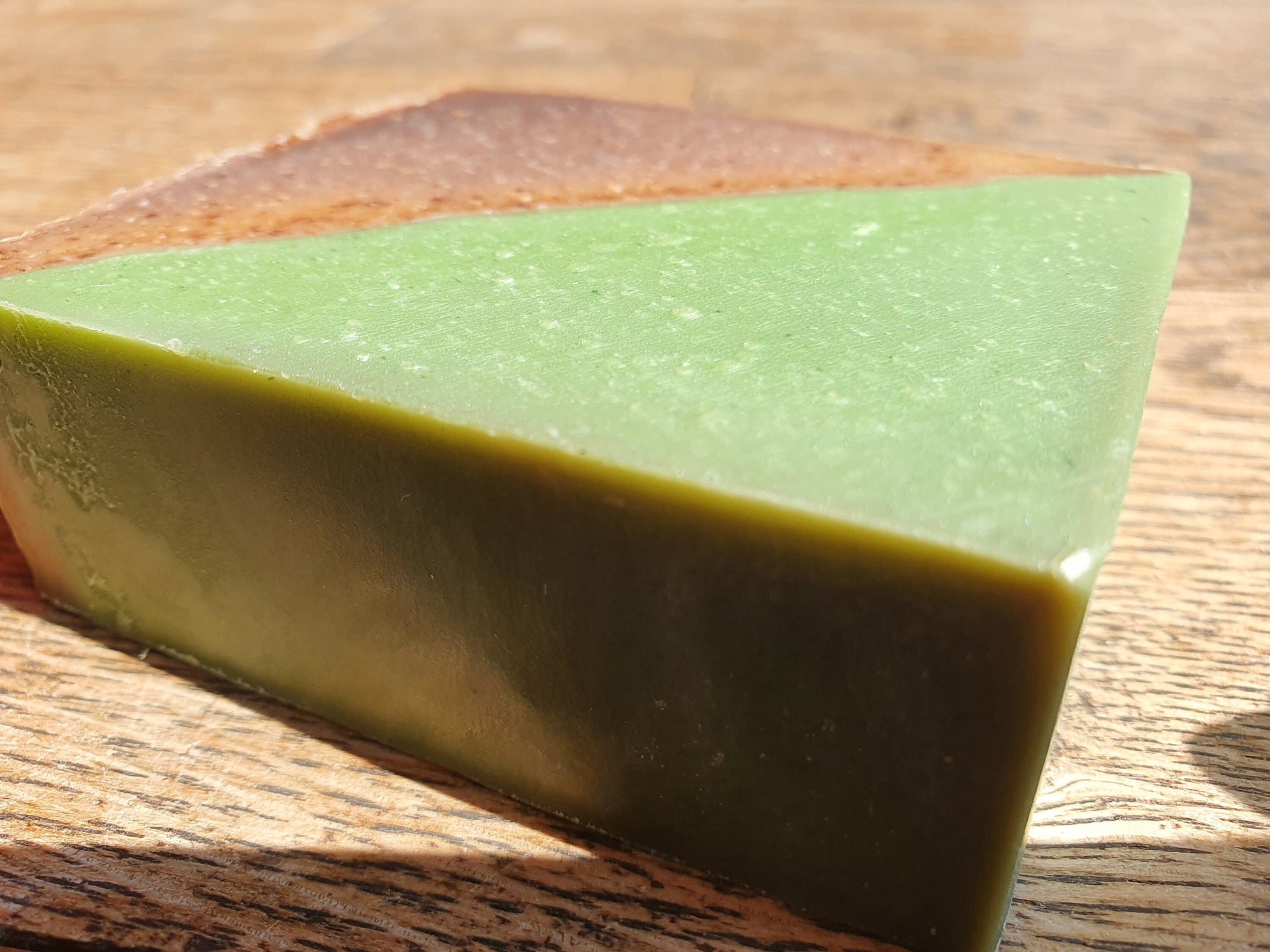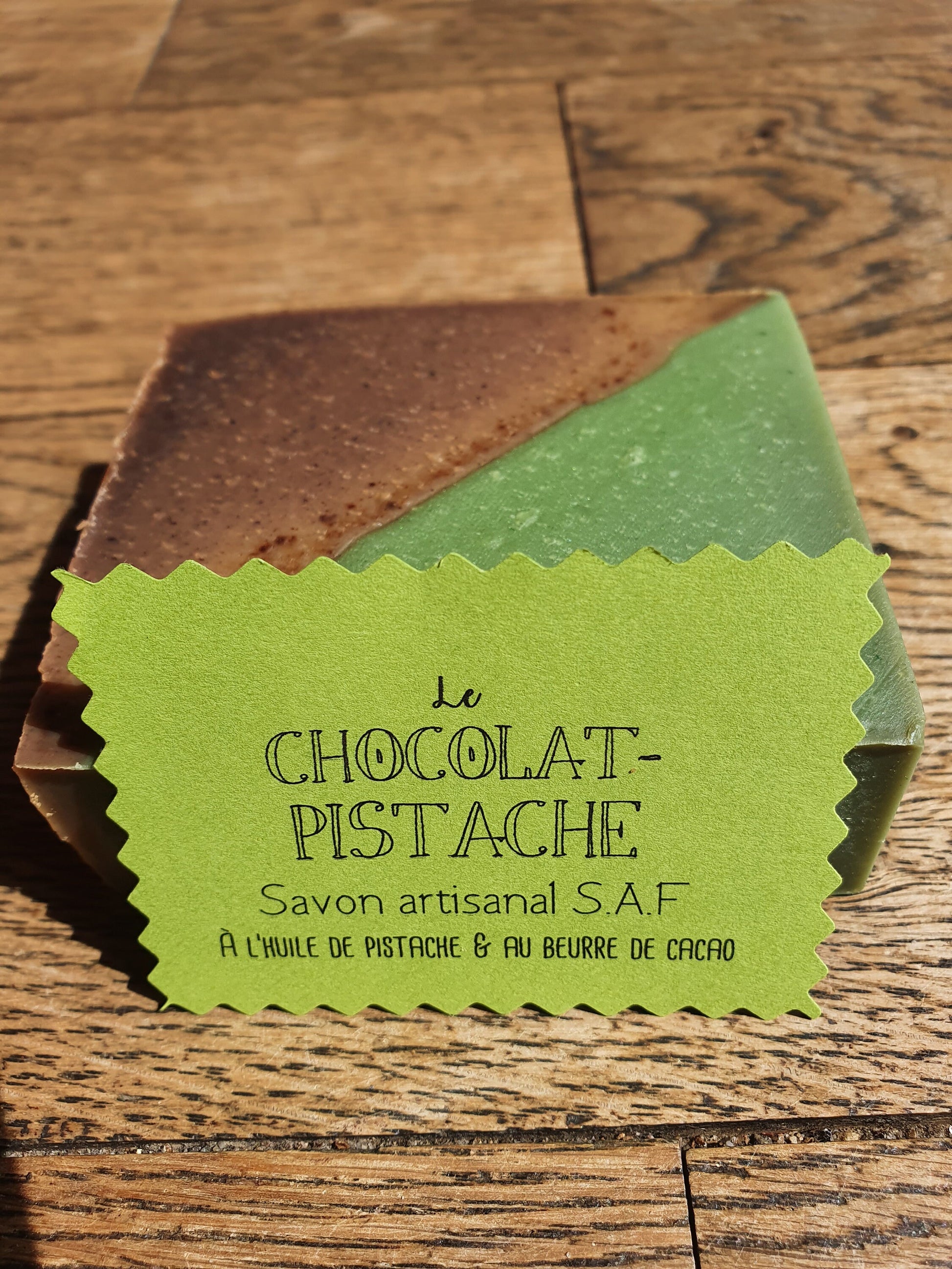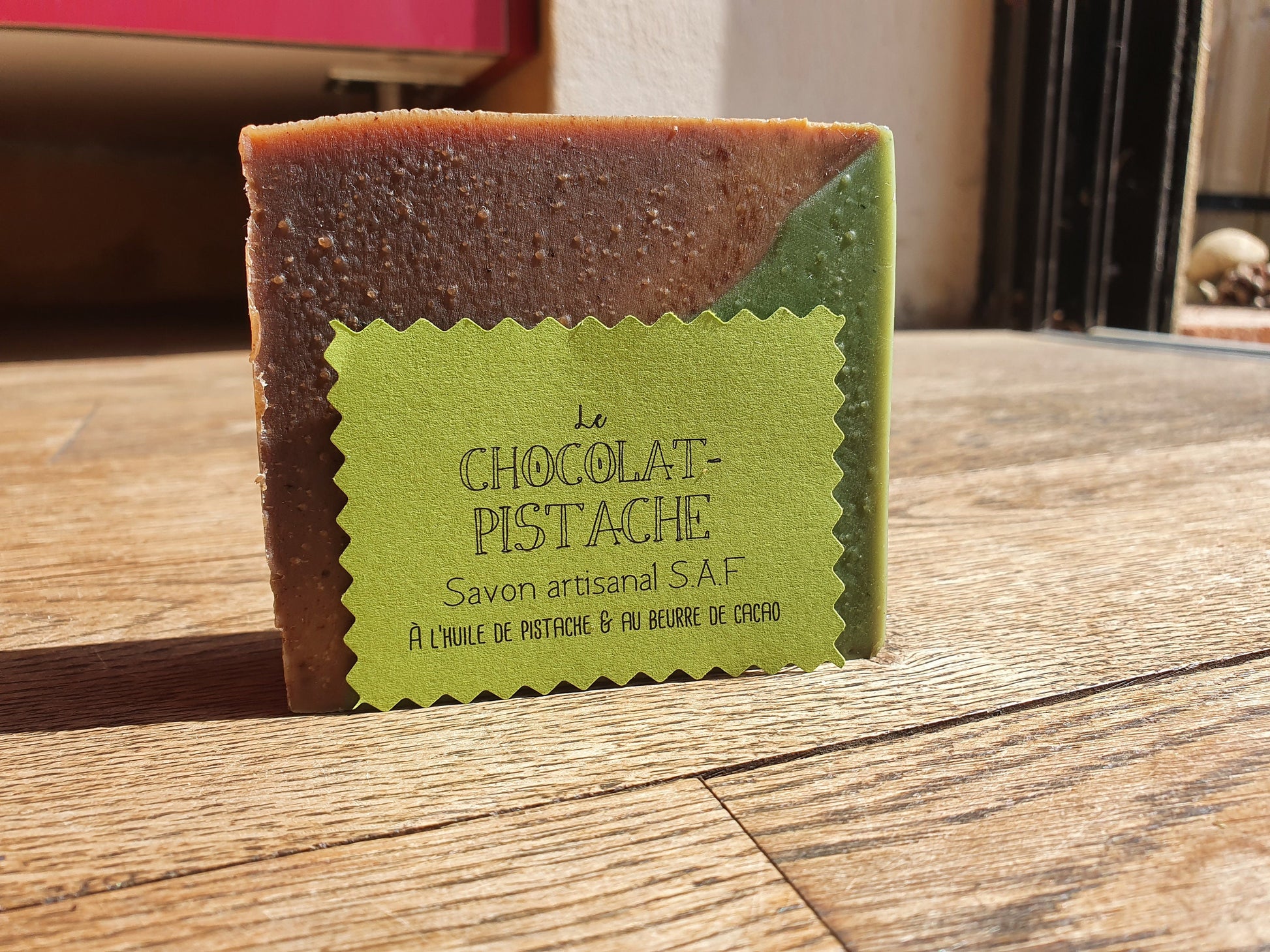 Le "Chocolat-pistache", savon artisanal surgras saponifié à froid divin à l'huile de pistache et au beurre de cacao pour les peaux gourmandes