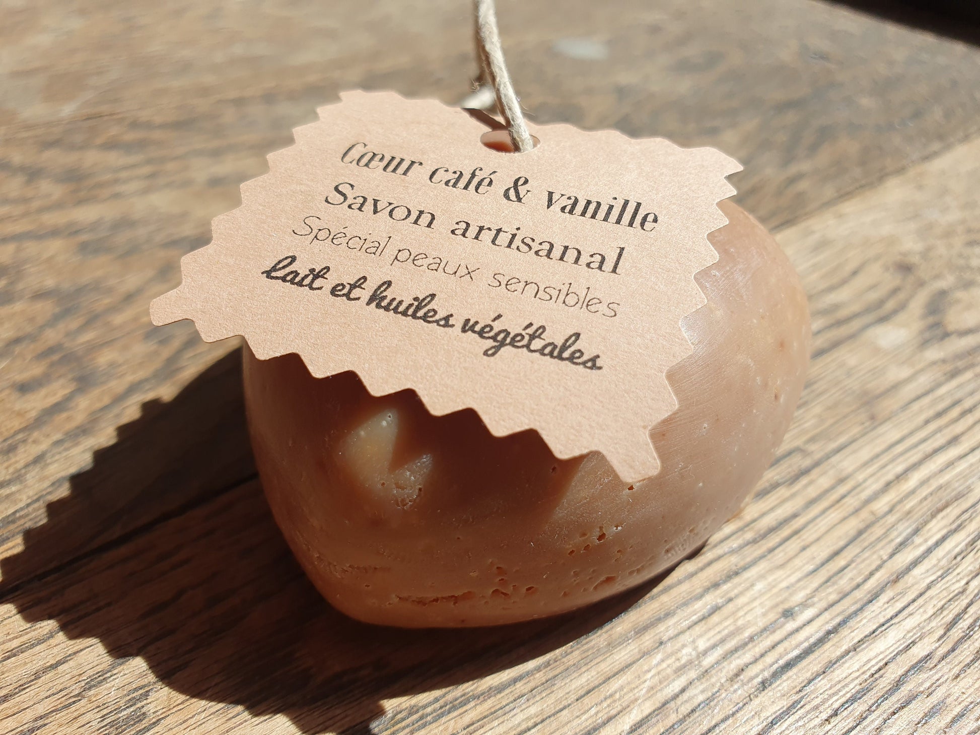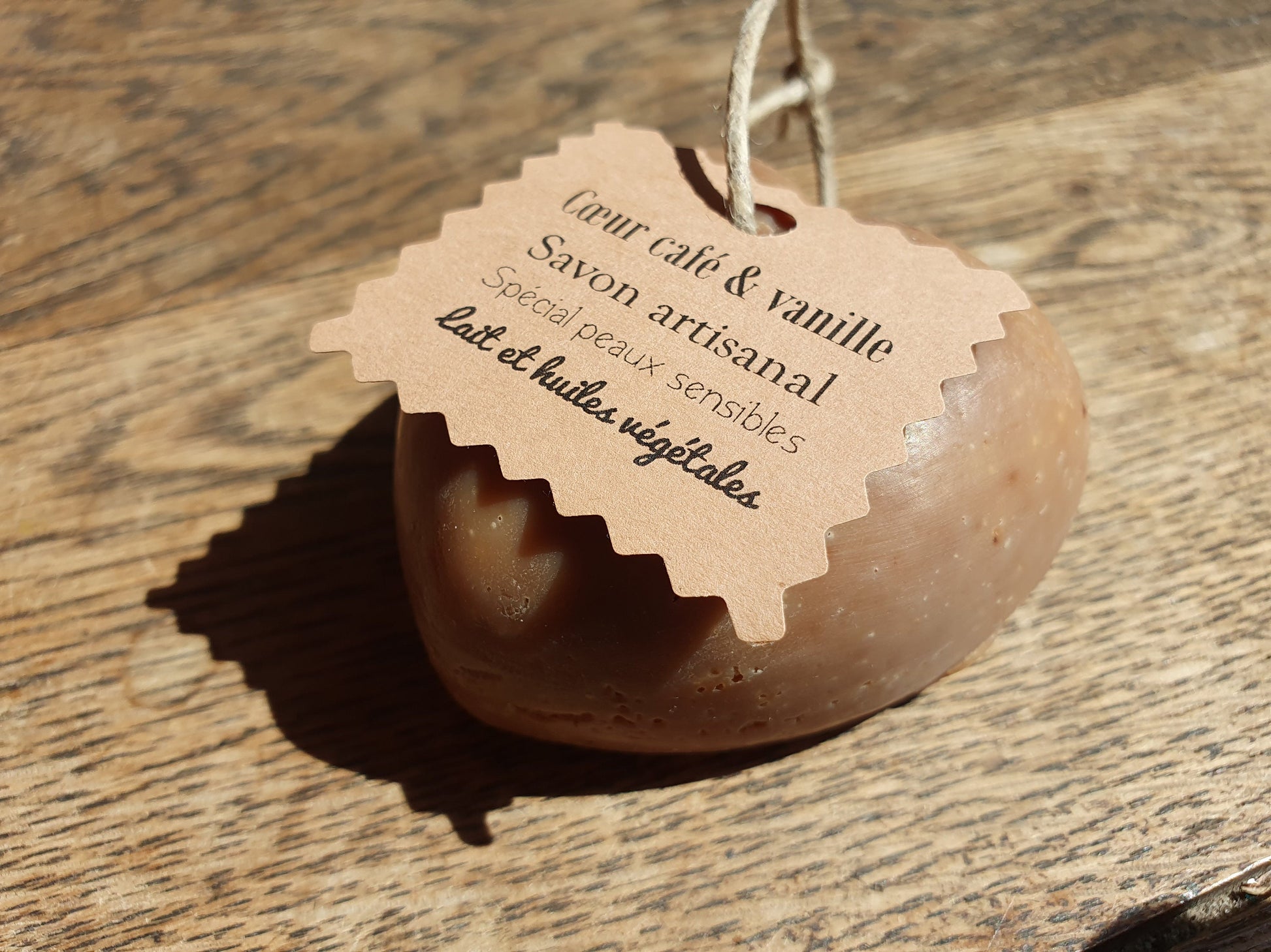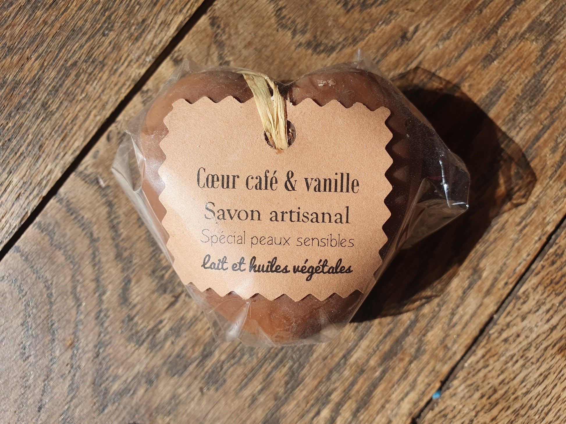 Le "Cœur café-vanille", savon artisanal surgras saponifié à froid au café et parfumé à la vanille légèrement exfolient