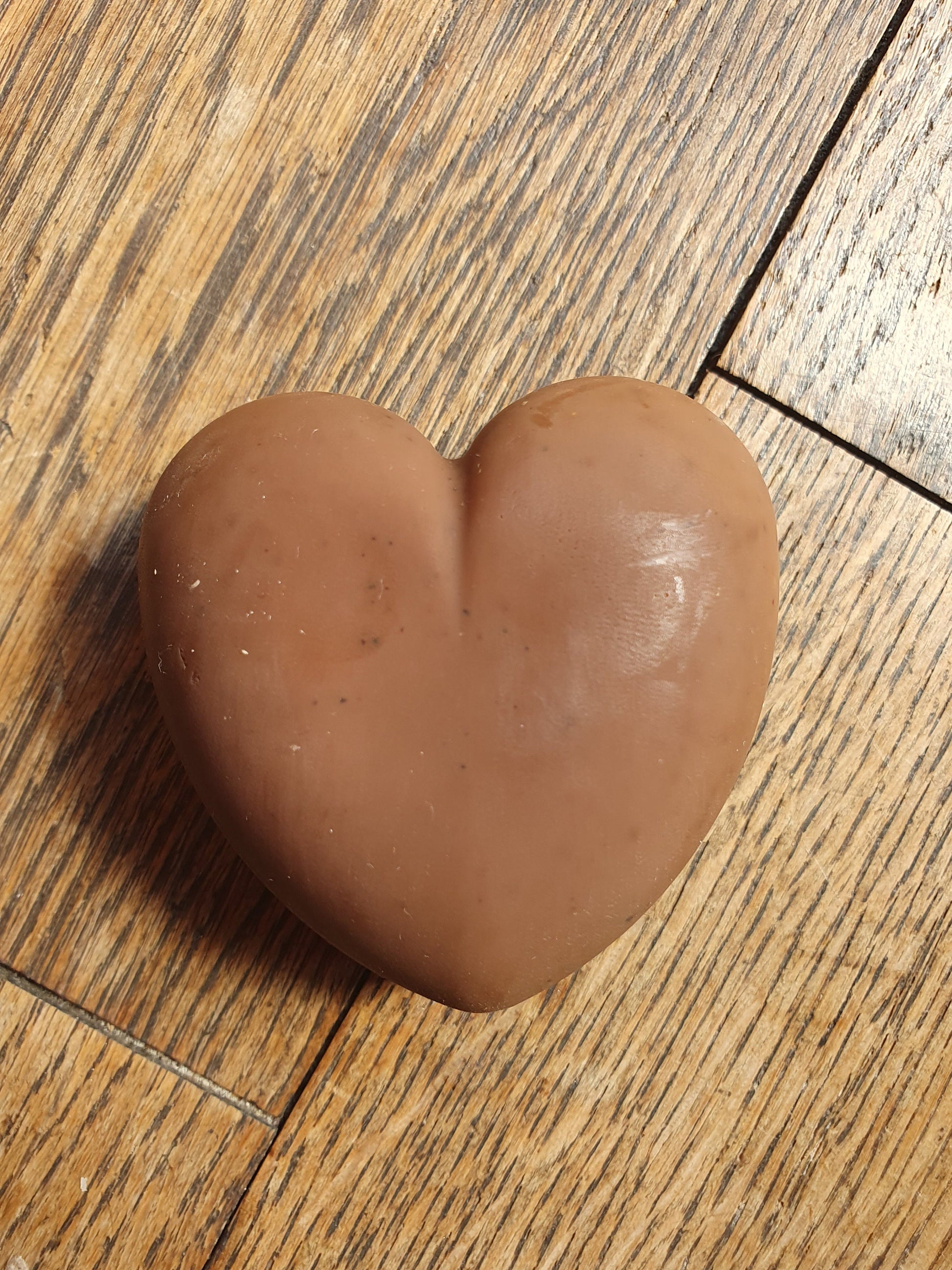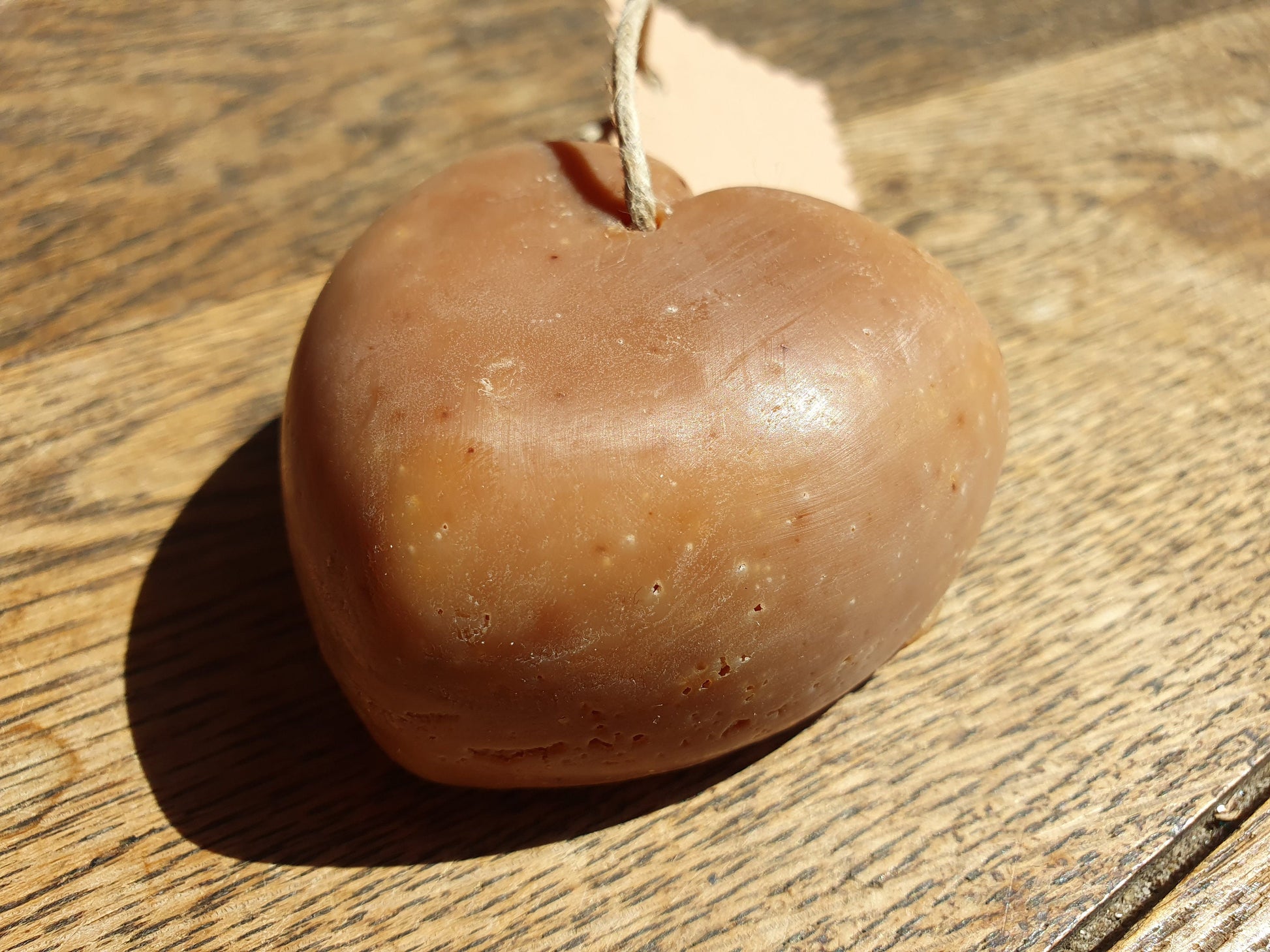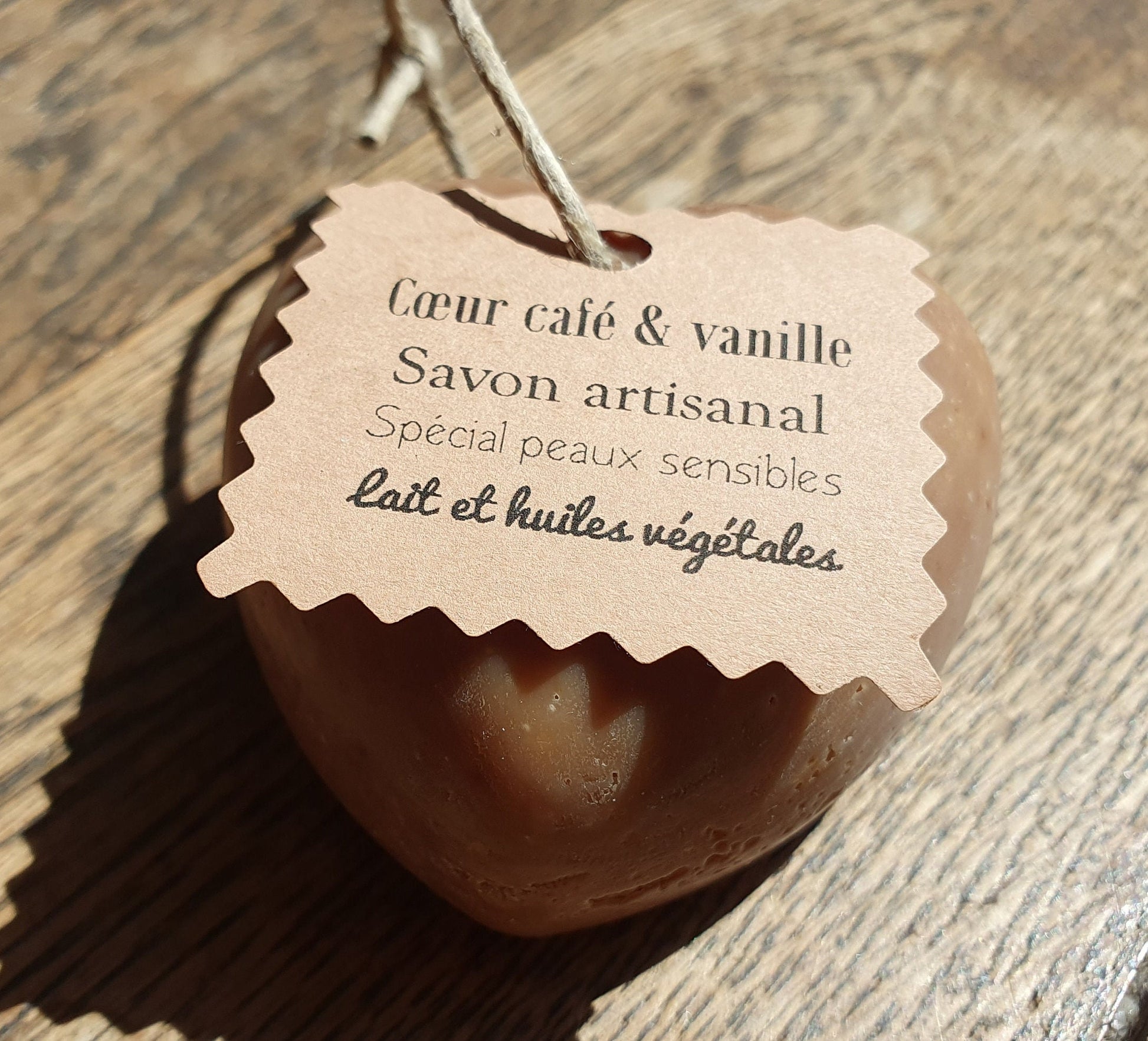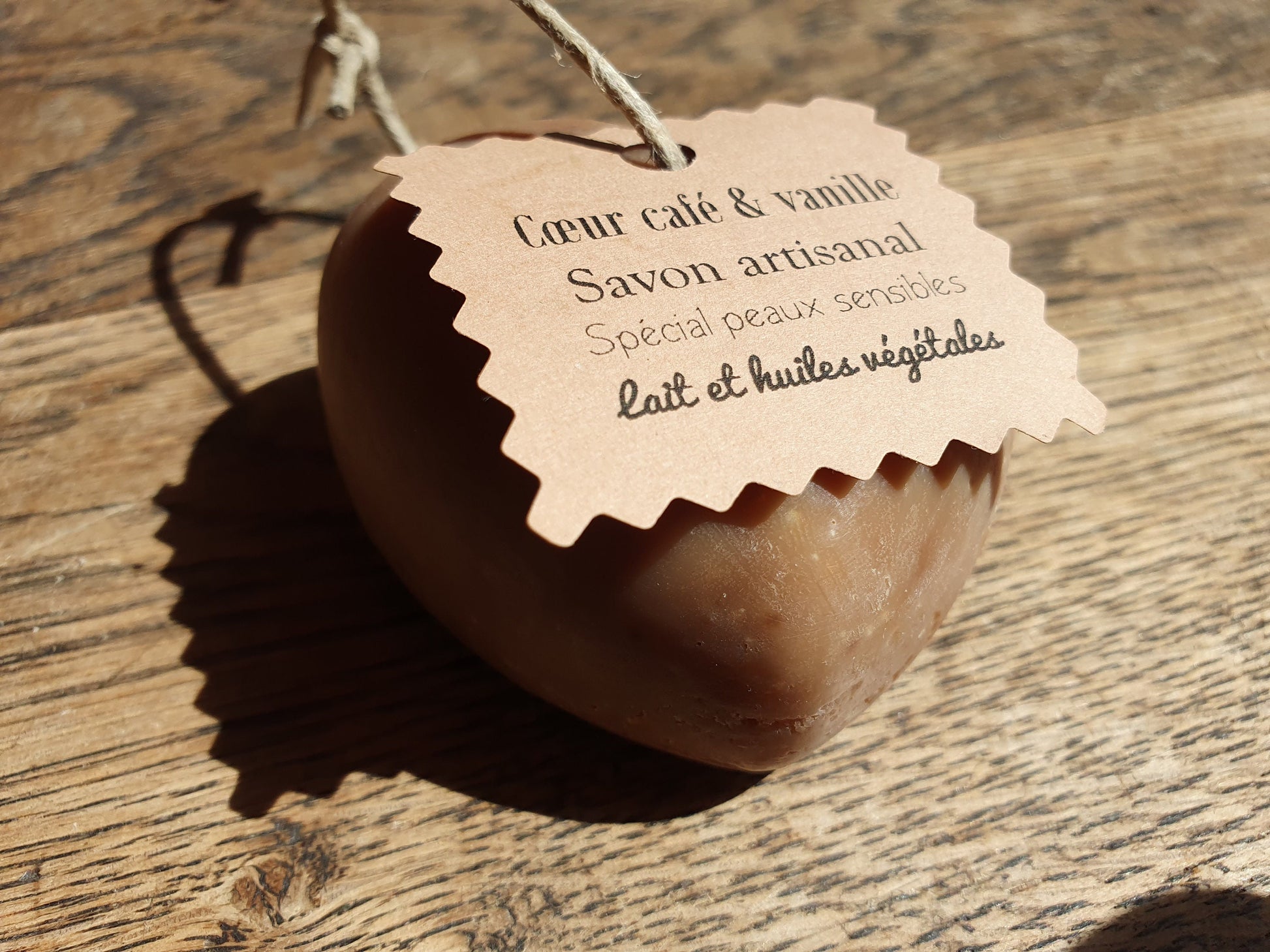 Le "Cœur café-vanille", savon artisanal surgras saponifié à froid au café et parfumé à la vanille légèrement exfolient