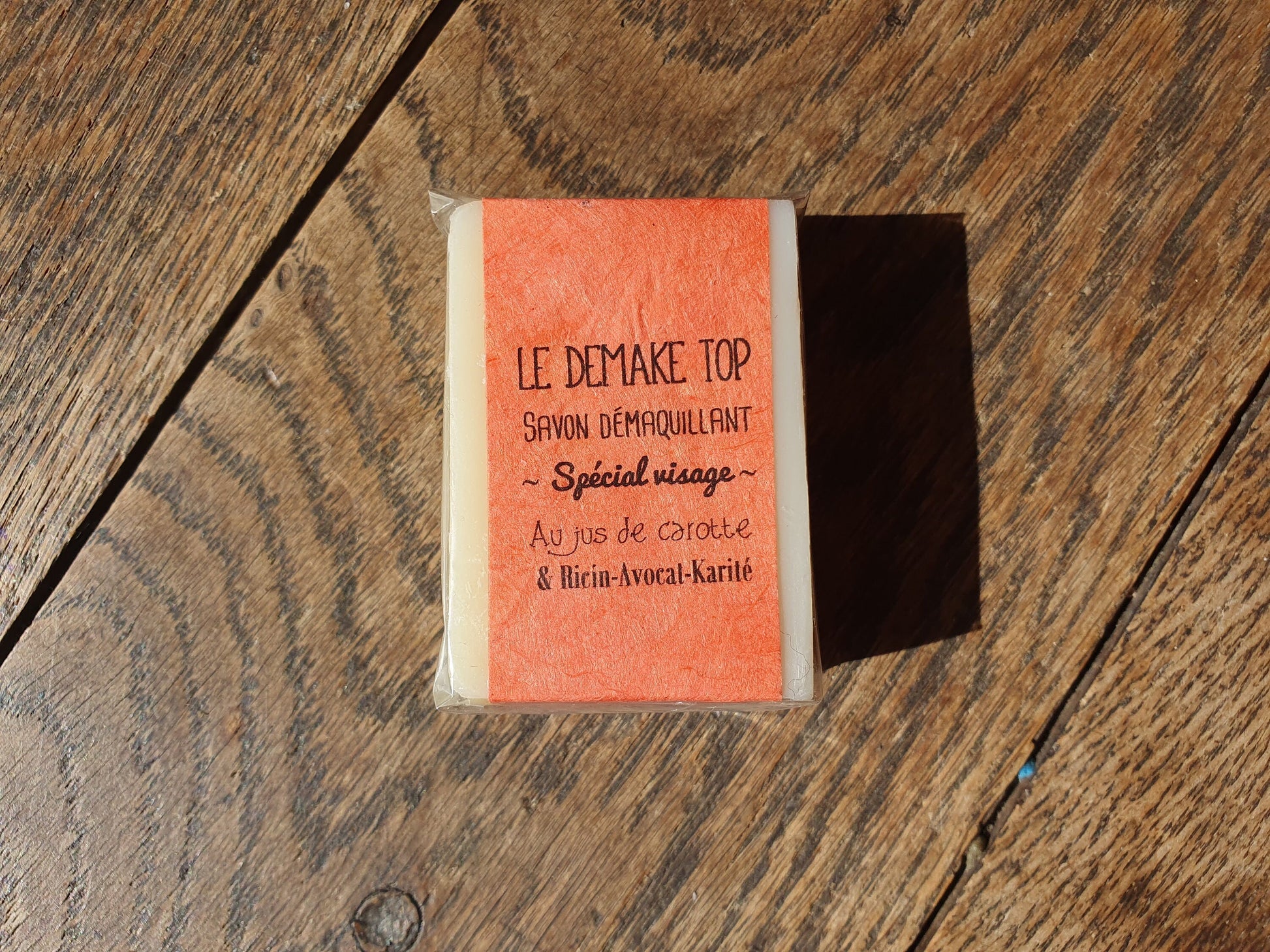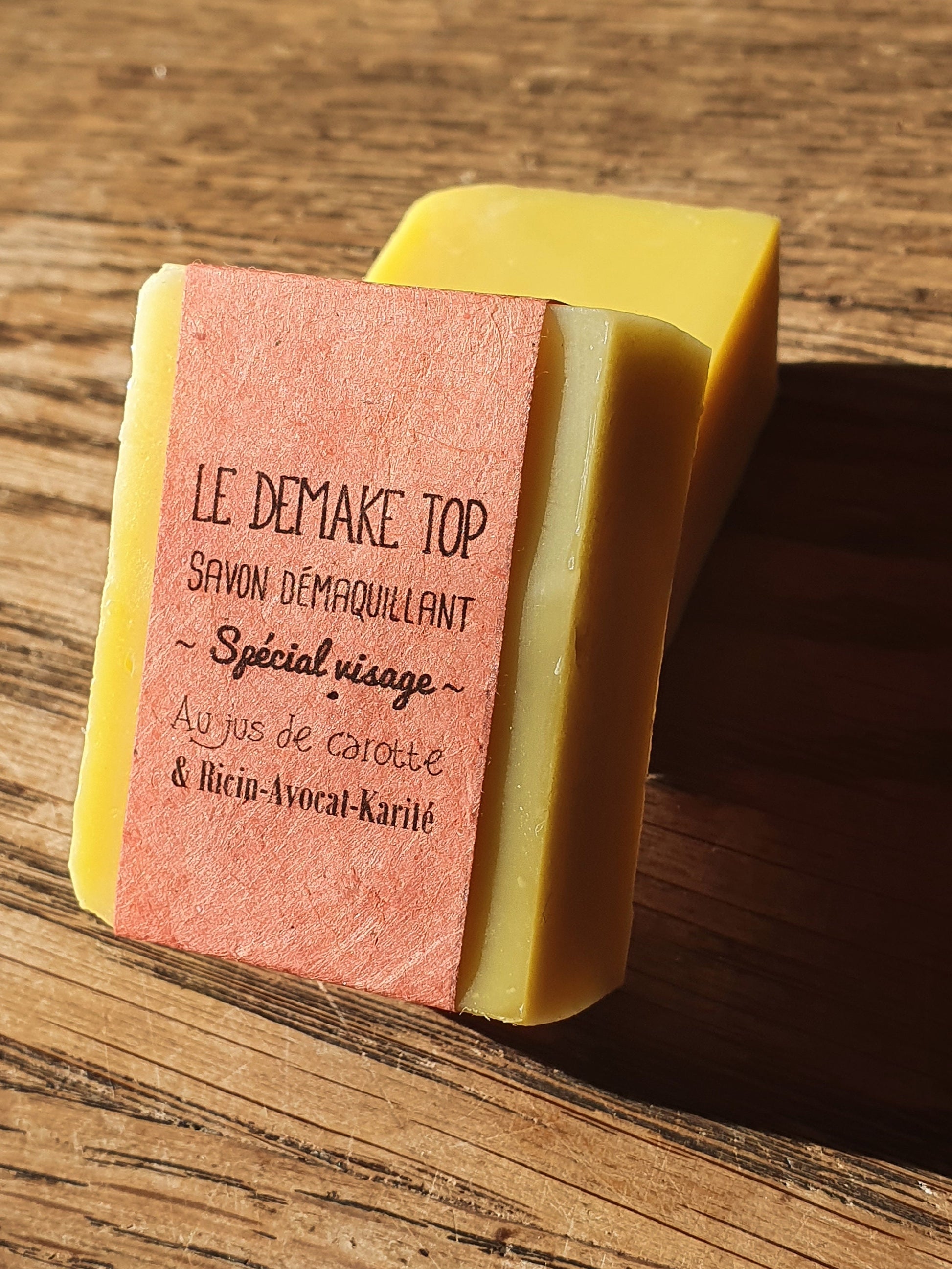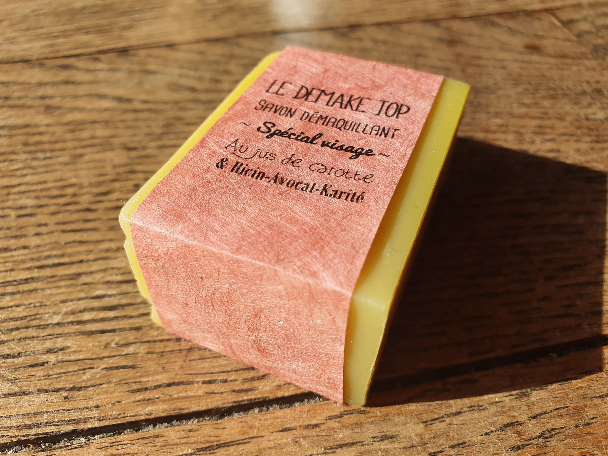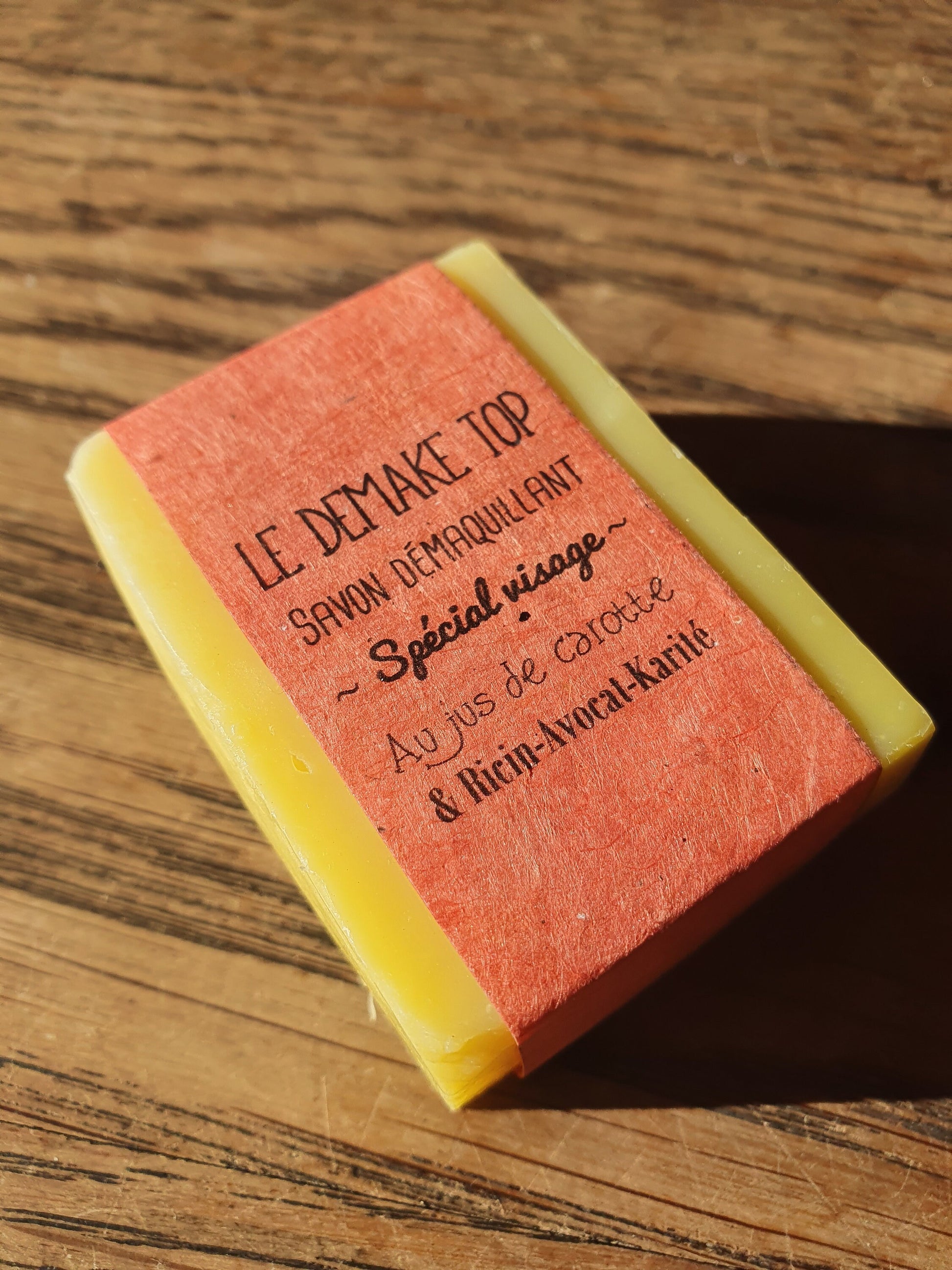 Le "Demake top", savon artisanal surgras saponifié à froid démaquillant bonne mine pour le visage au jus de carotte, huiles de ricin, olive, avocat et beurre de karité