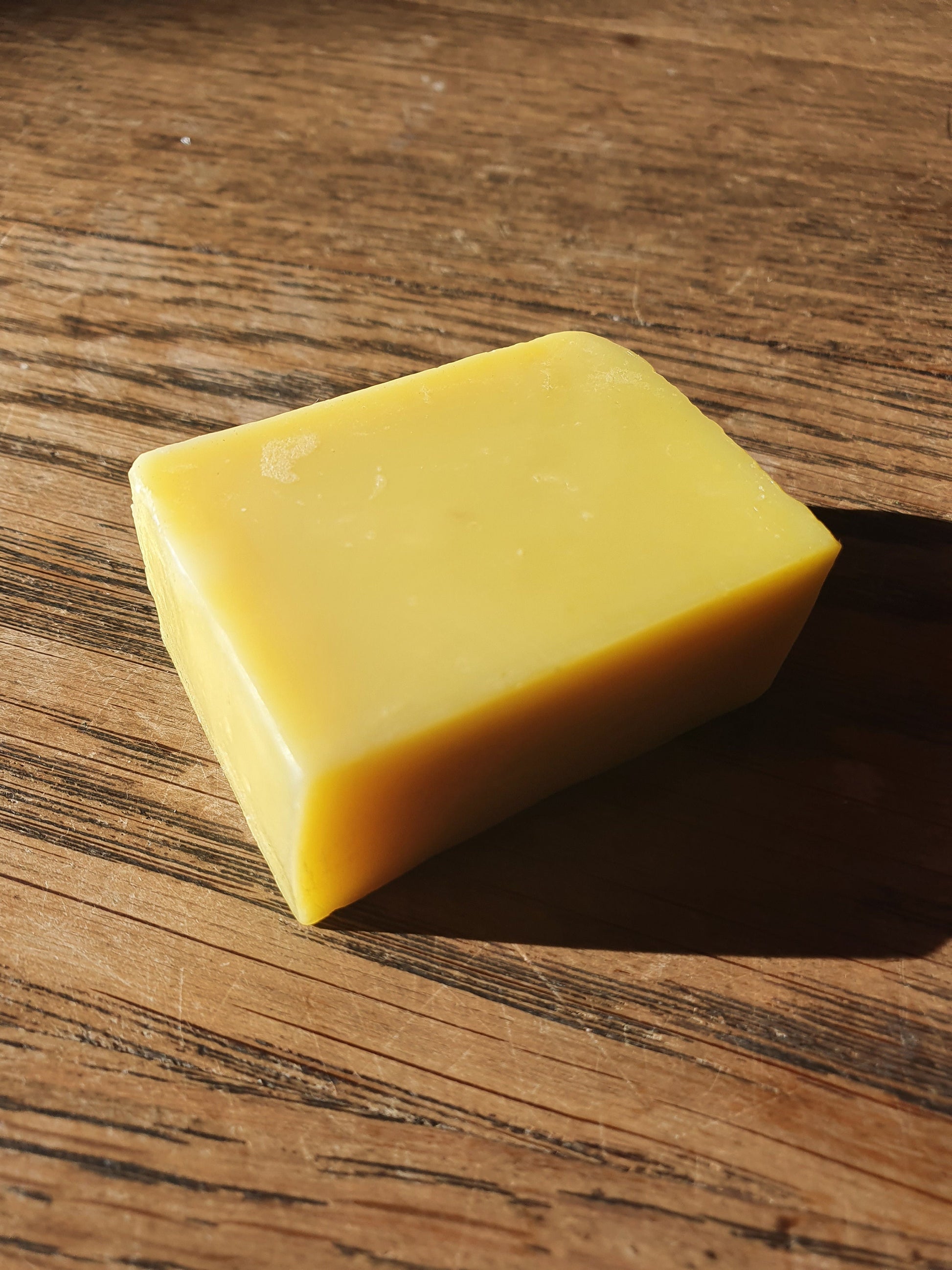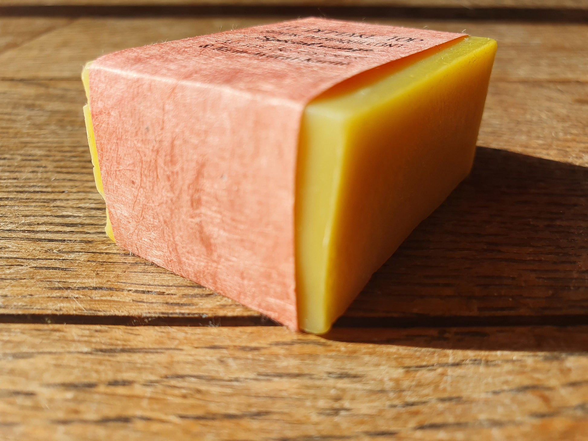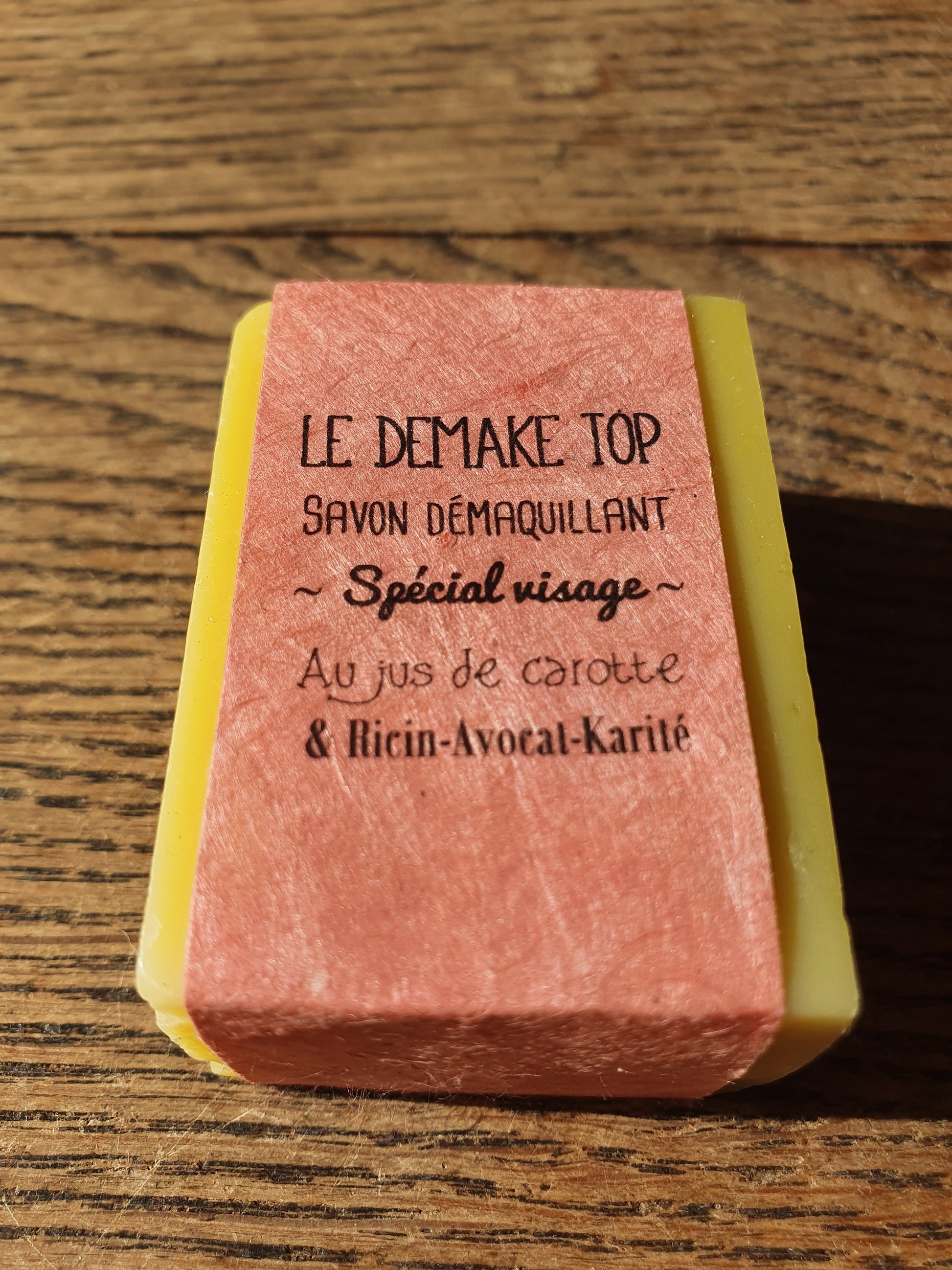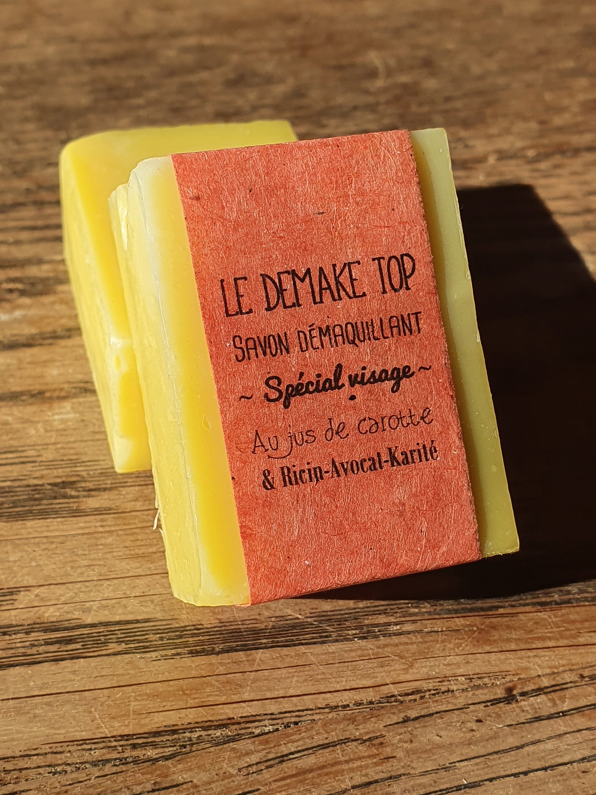 Le "Demake top", savon artisanal surgras saponifié à froid démaquillant bonne mine pour le visage au jus de carotte, huiles de ricin, olive, avocat et beurre de karité