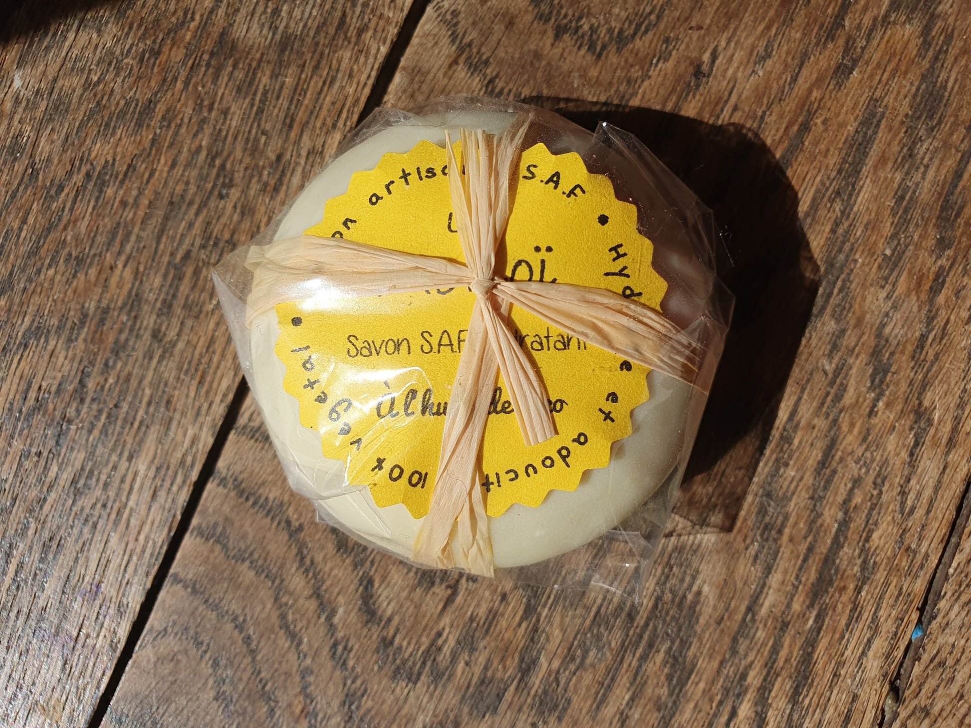 Savon artisanal surgras, doux et hydratant, obtenu par saponification à froid aux huiles végétales. Il contient :