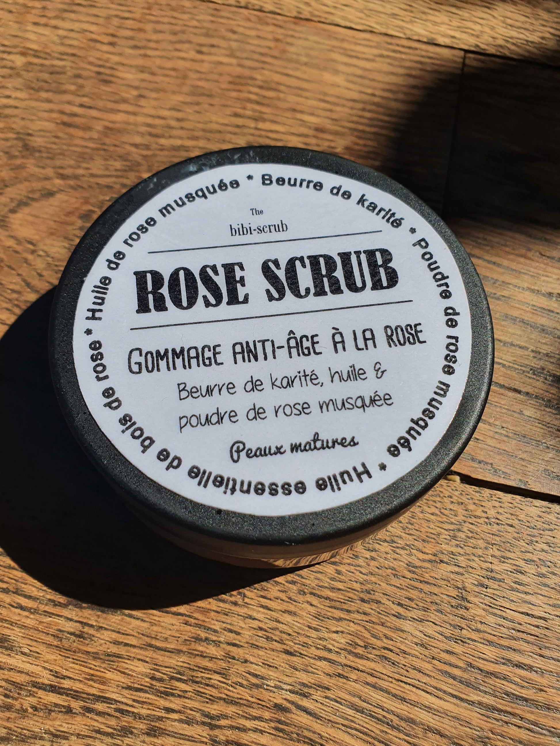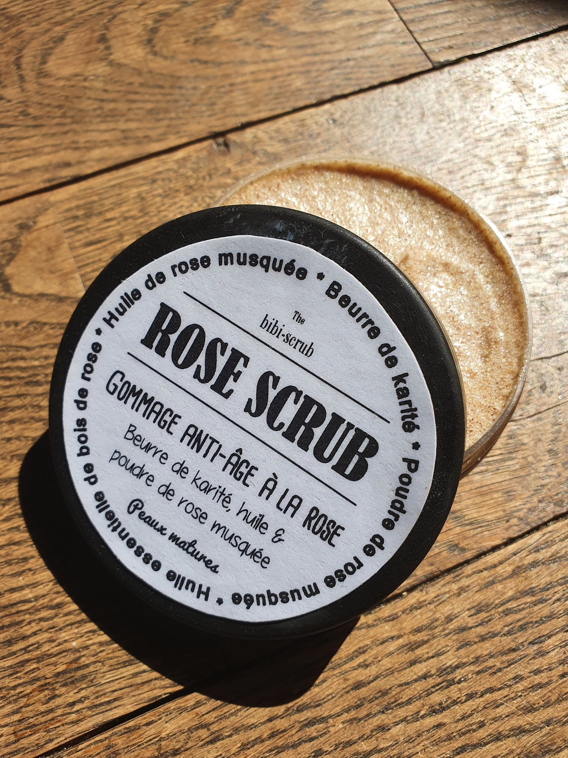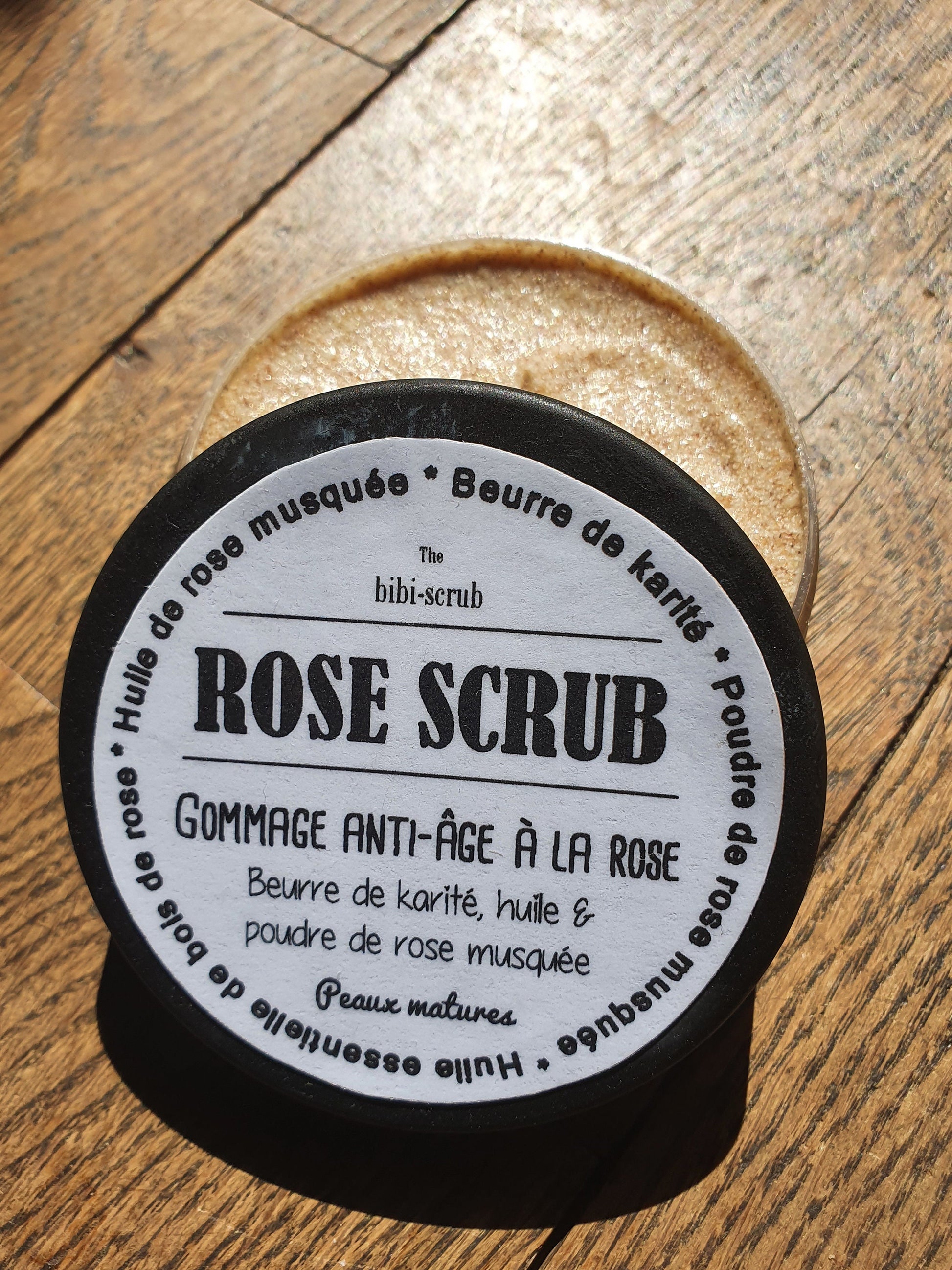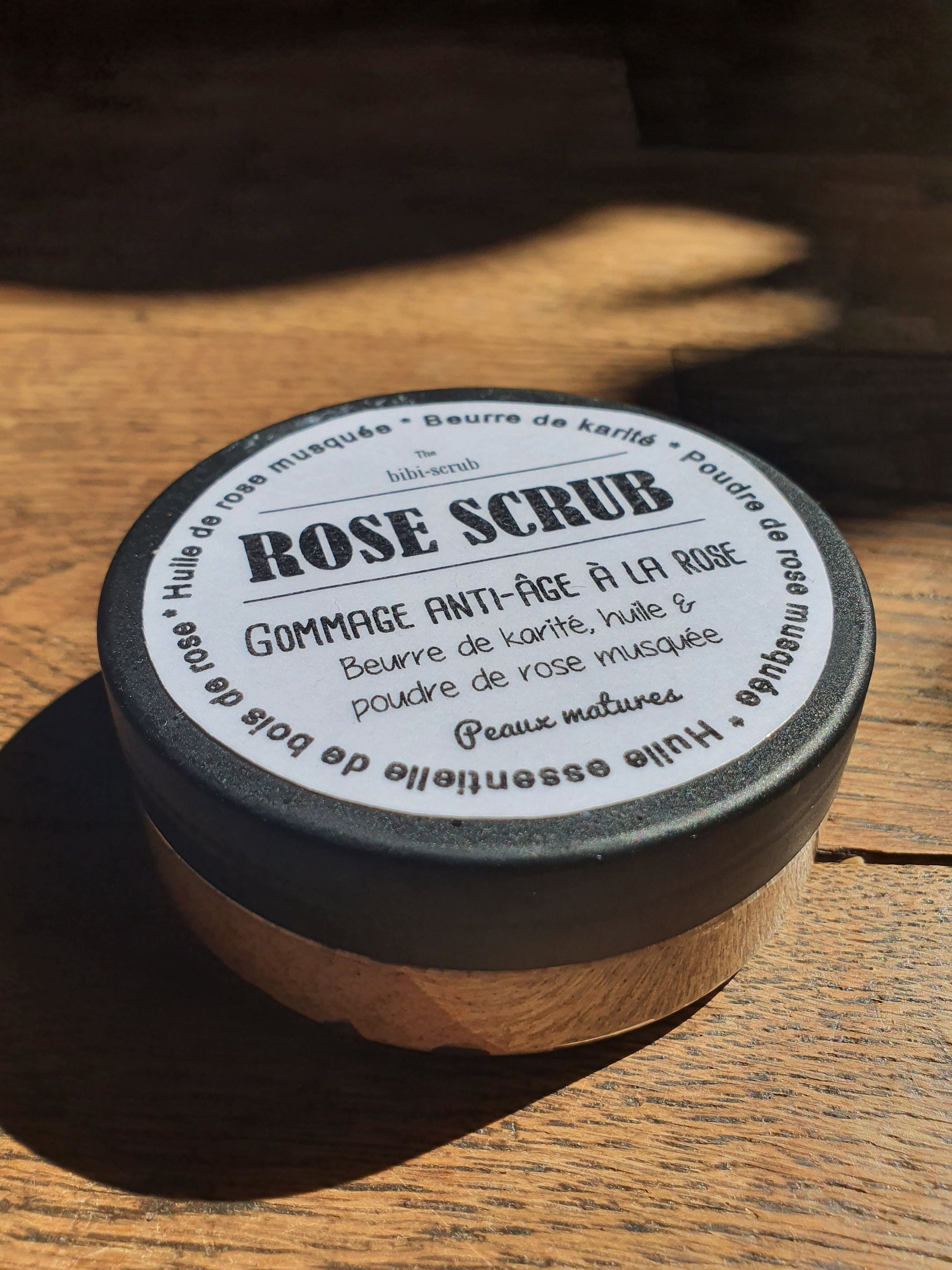 Le "Rose scrub", crème gommante gommage précieux anti-âge à la rose musquée, au beurre de karité et au bois de rose pour les peaux matures