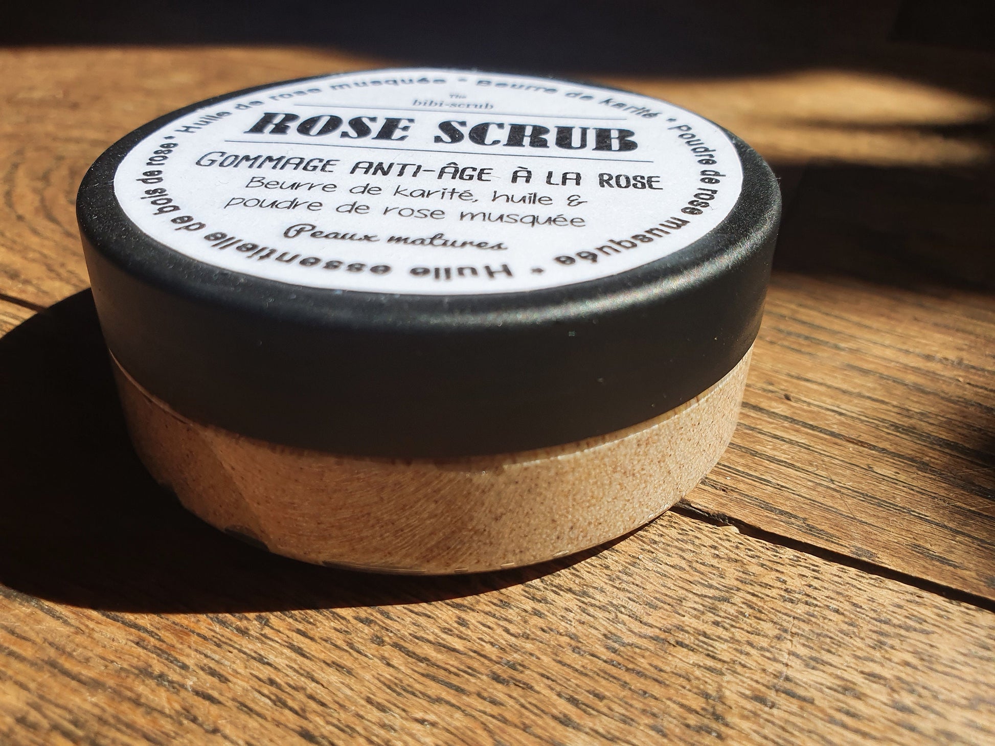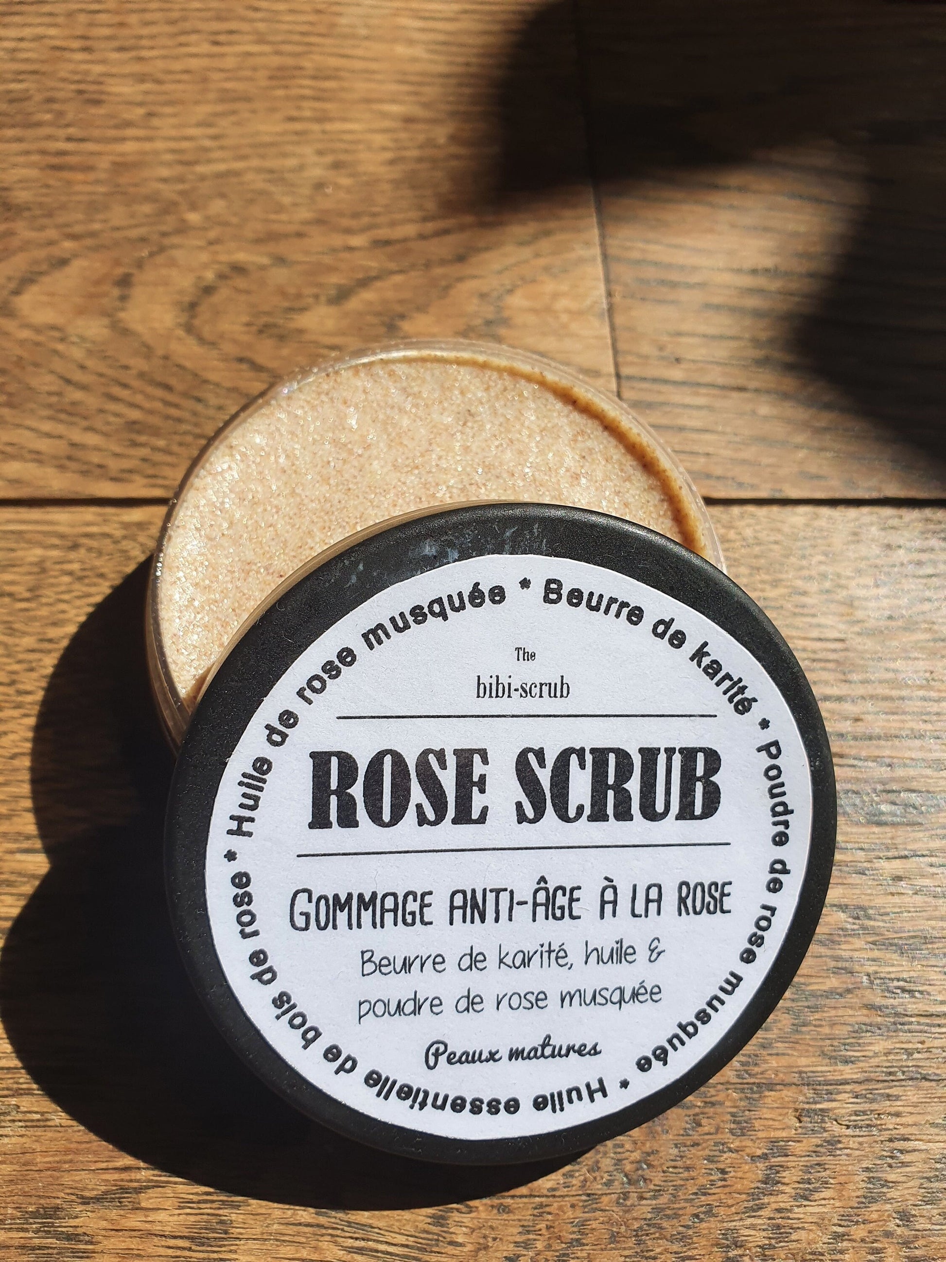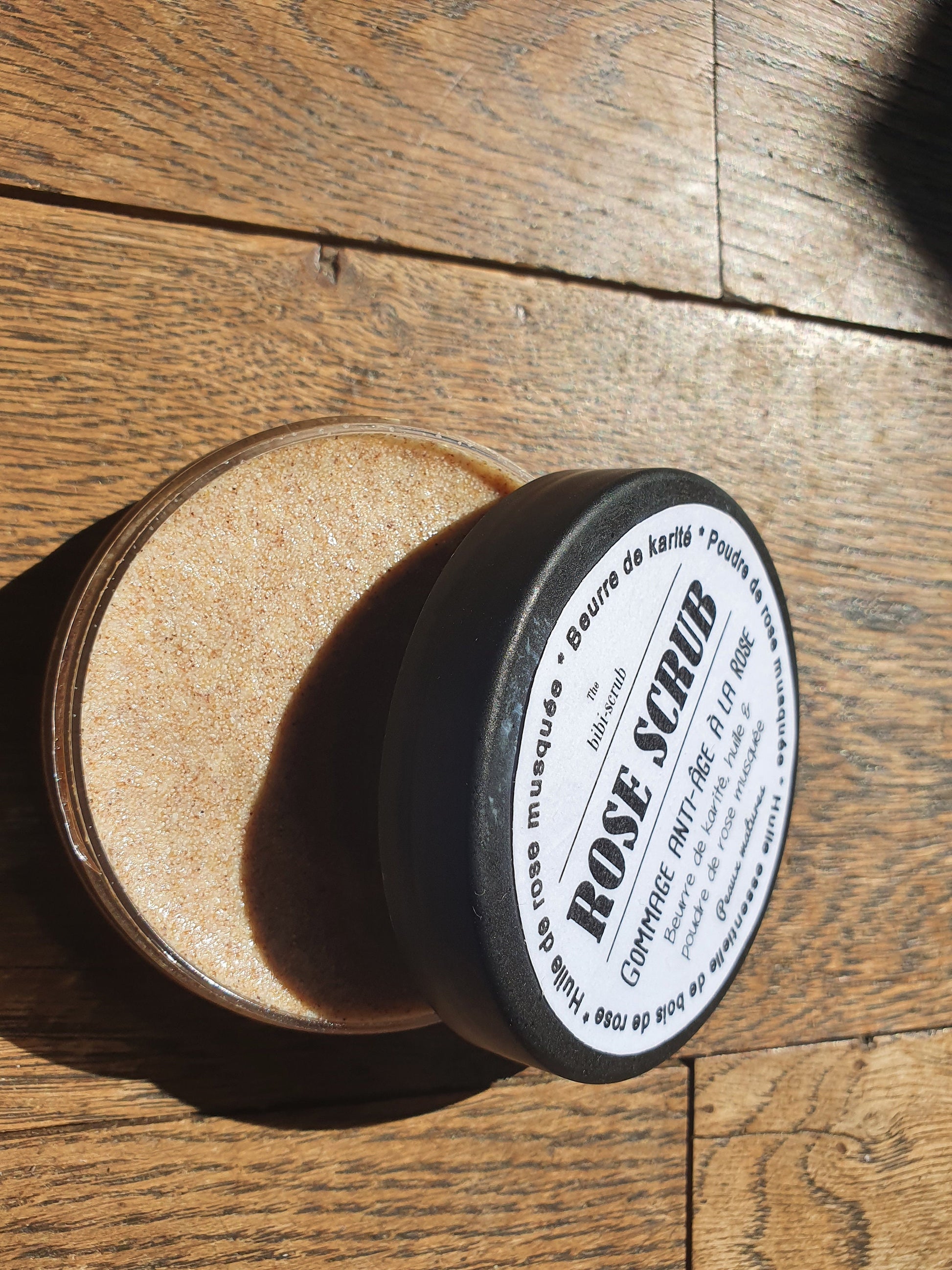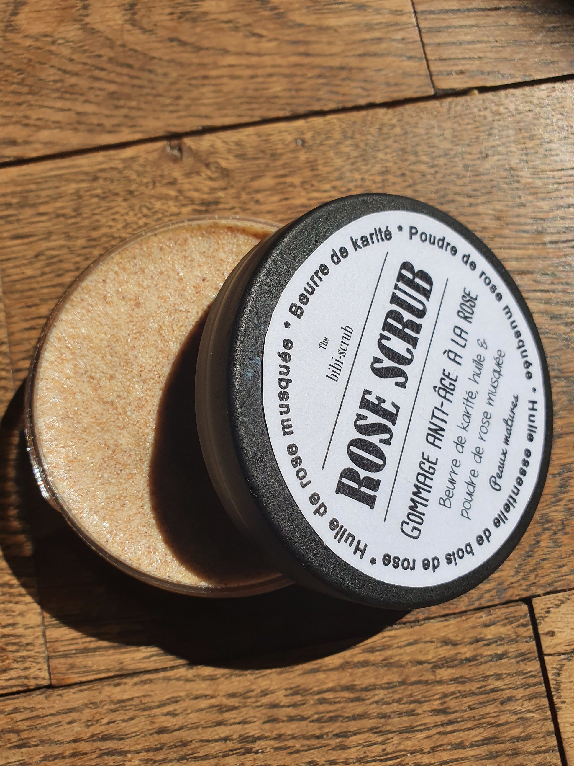 Le "Rose scrub", crème gommante gommage précieux anti-âge à la rose musquée, au beurre de karité et au bois de rose pour les peaux matures