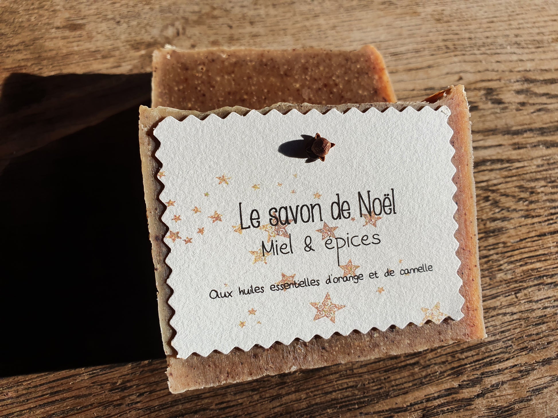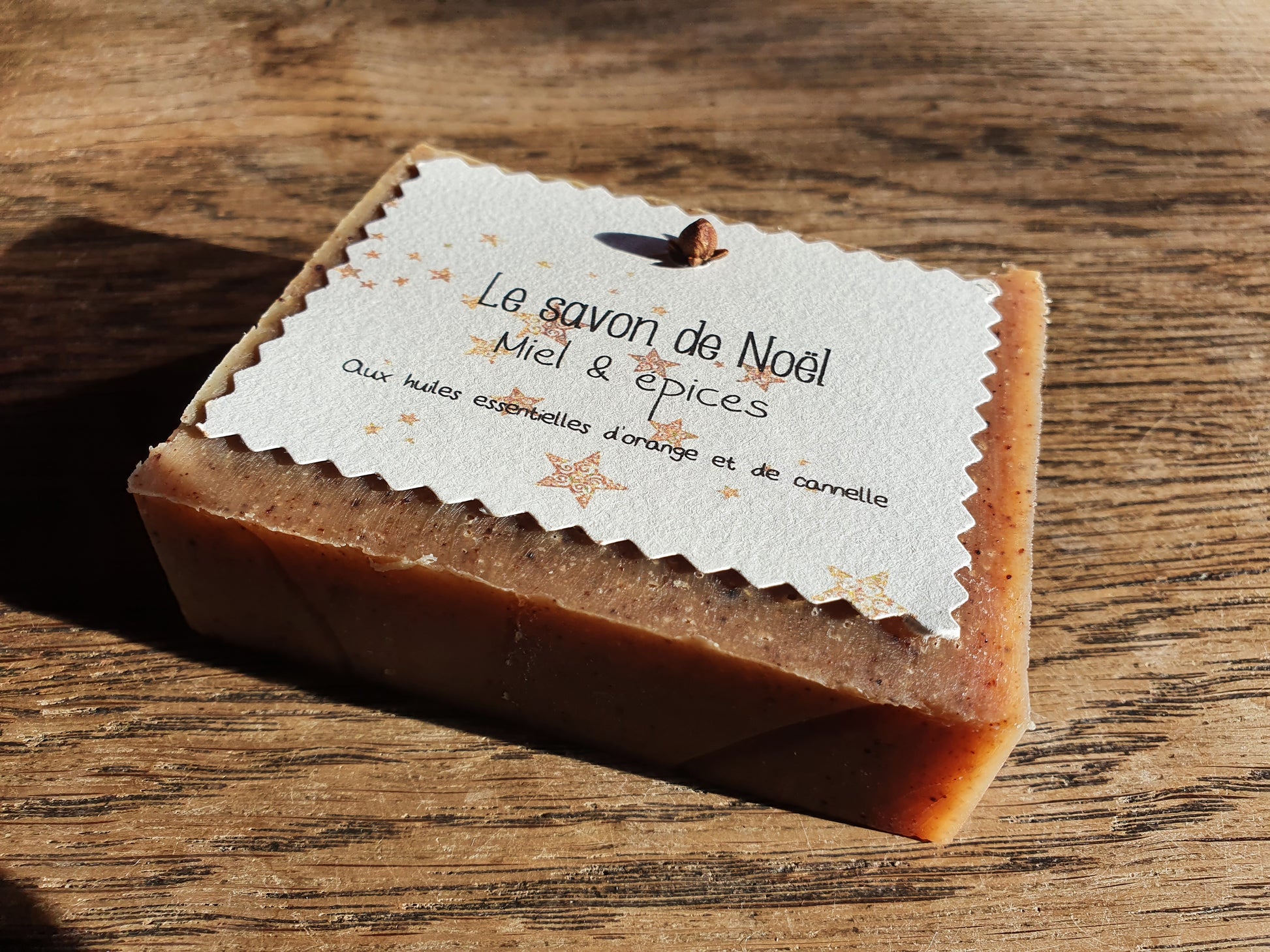 Le "Savon de Noël", savon artisanal saponifié à froid au miel, aux épices et aux huiles essentielles d'orange et de cannelle