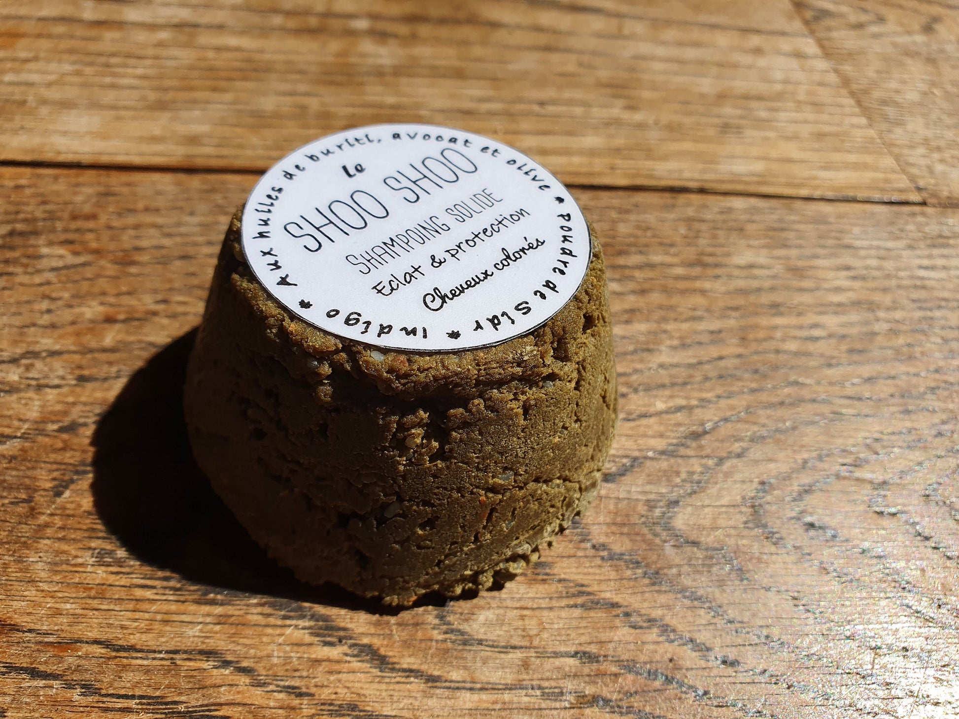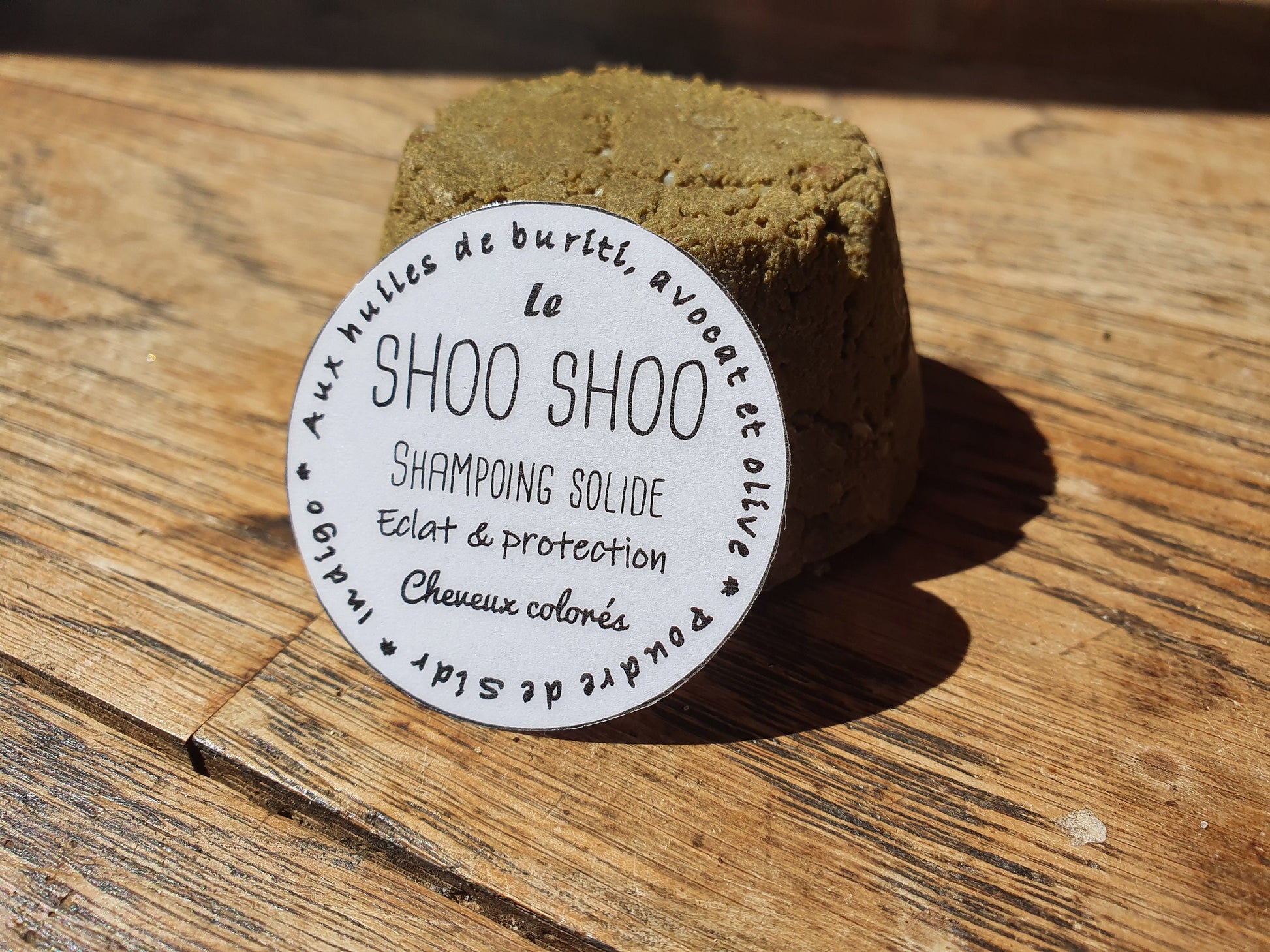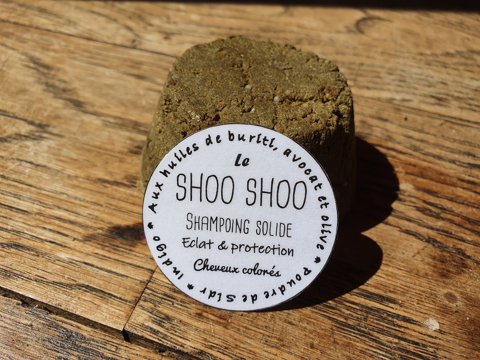 Le "Shoo Shoo cheveux colorés", shampoing solide artisanal à l'huile d'olive, coco, amande douce et poudres ayurvédiques