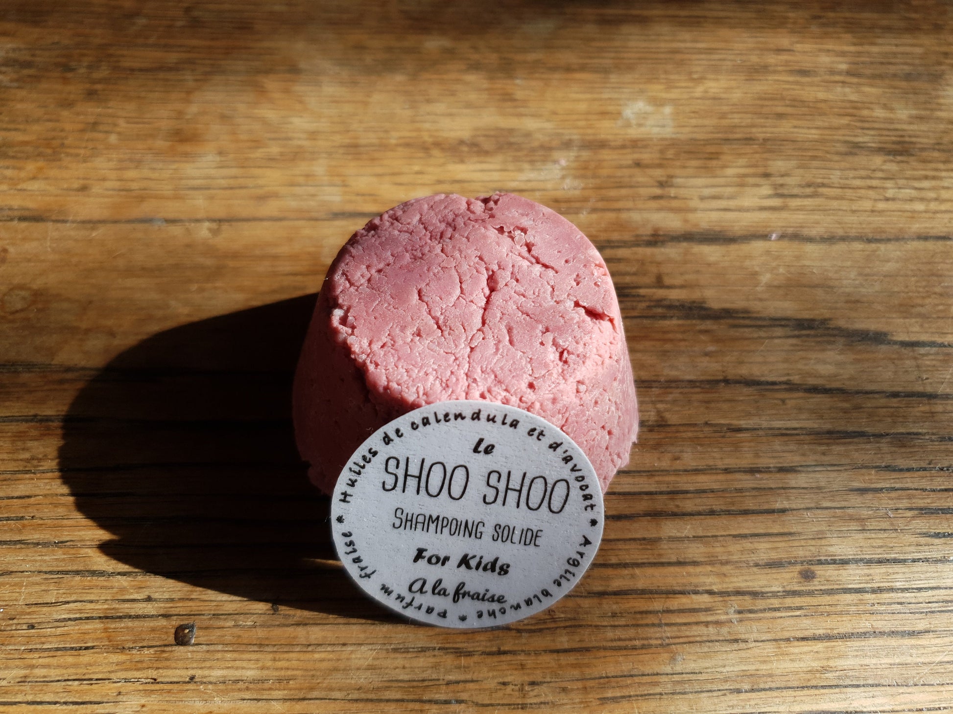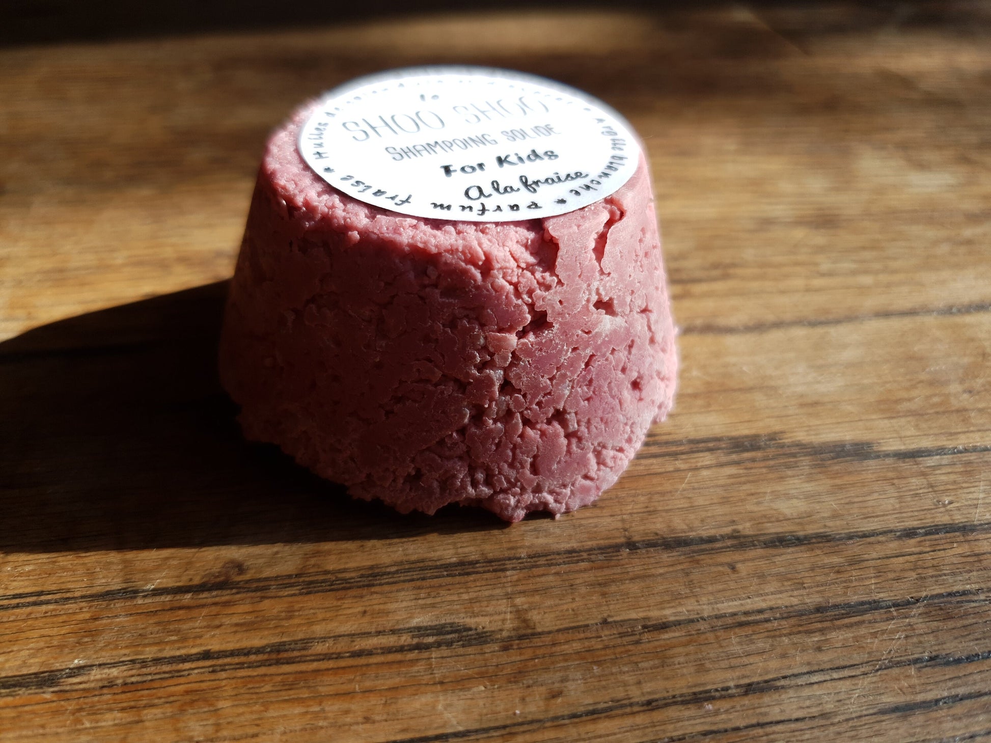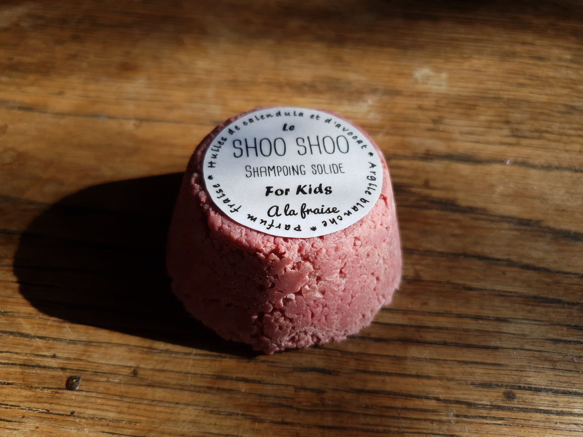 Le "Shoo Shoo for kids", shampoing solide artisanal ultra doux pour les enfants à l'huile d'avocat et de calendula sans huile essentielle, parfumé à la "fraise"