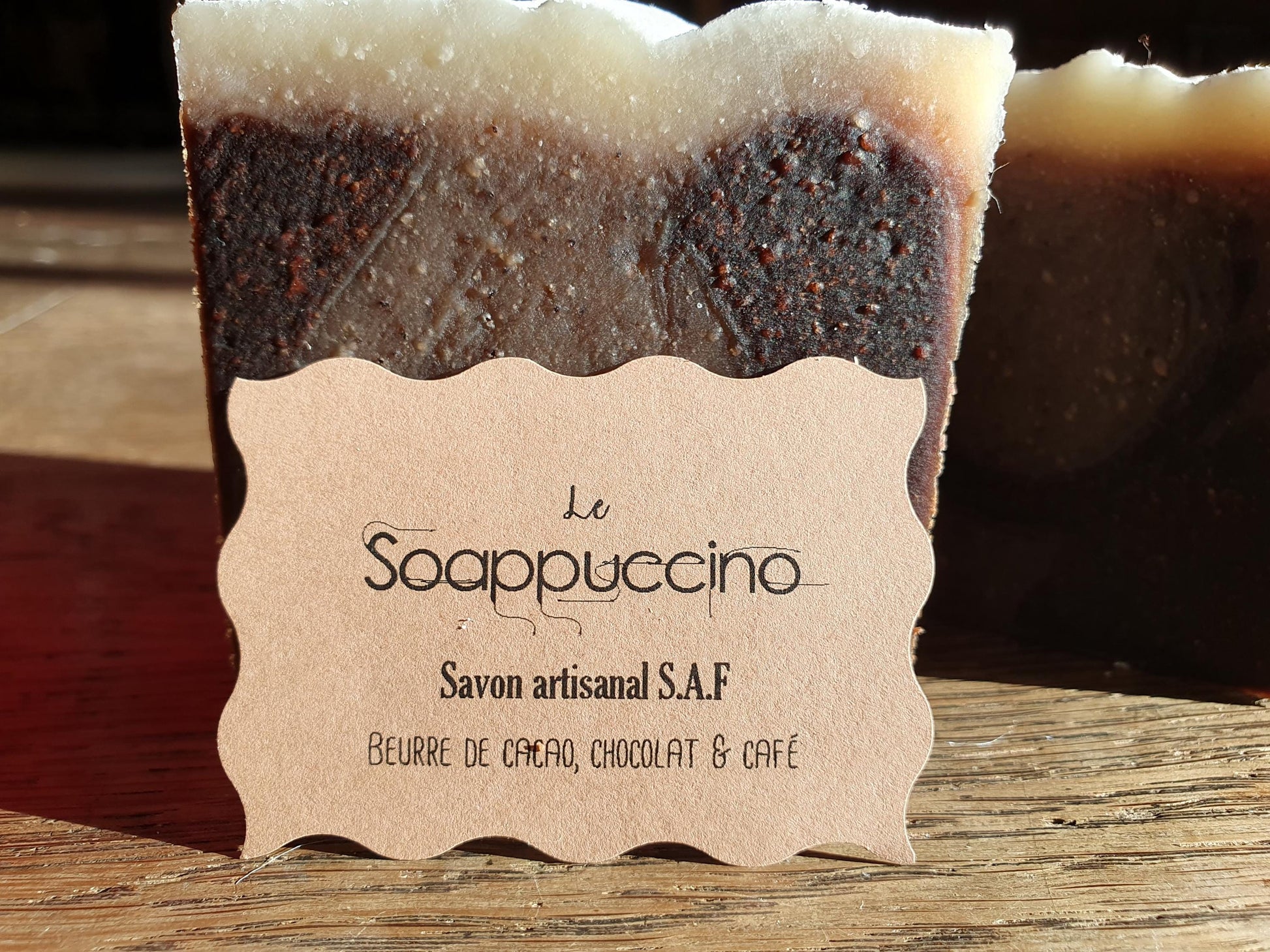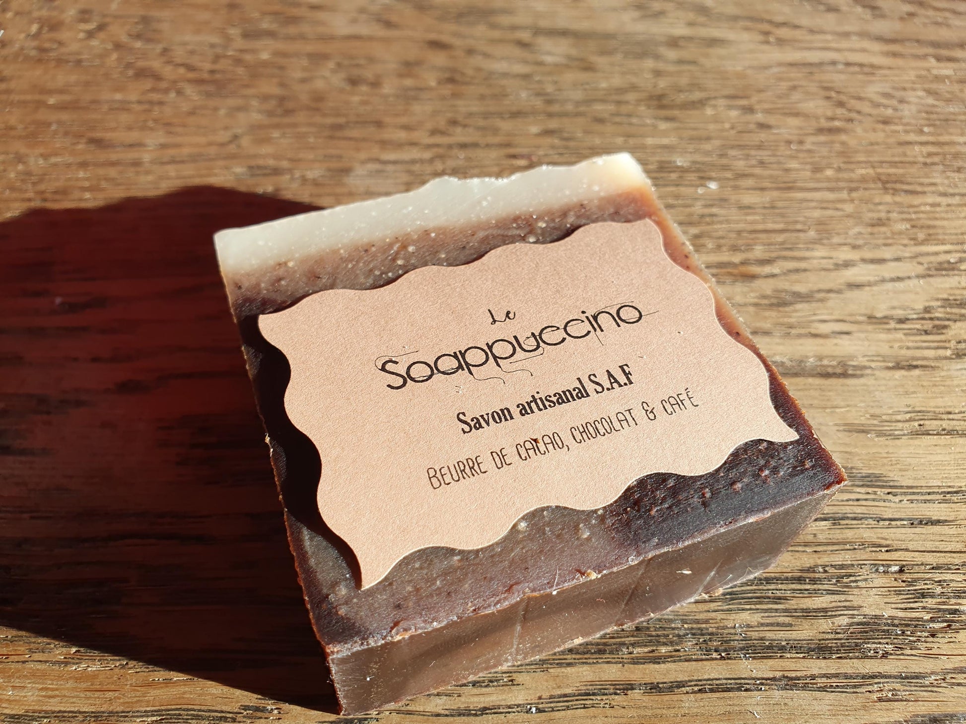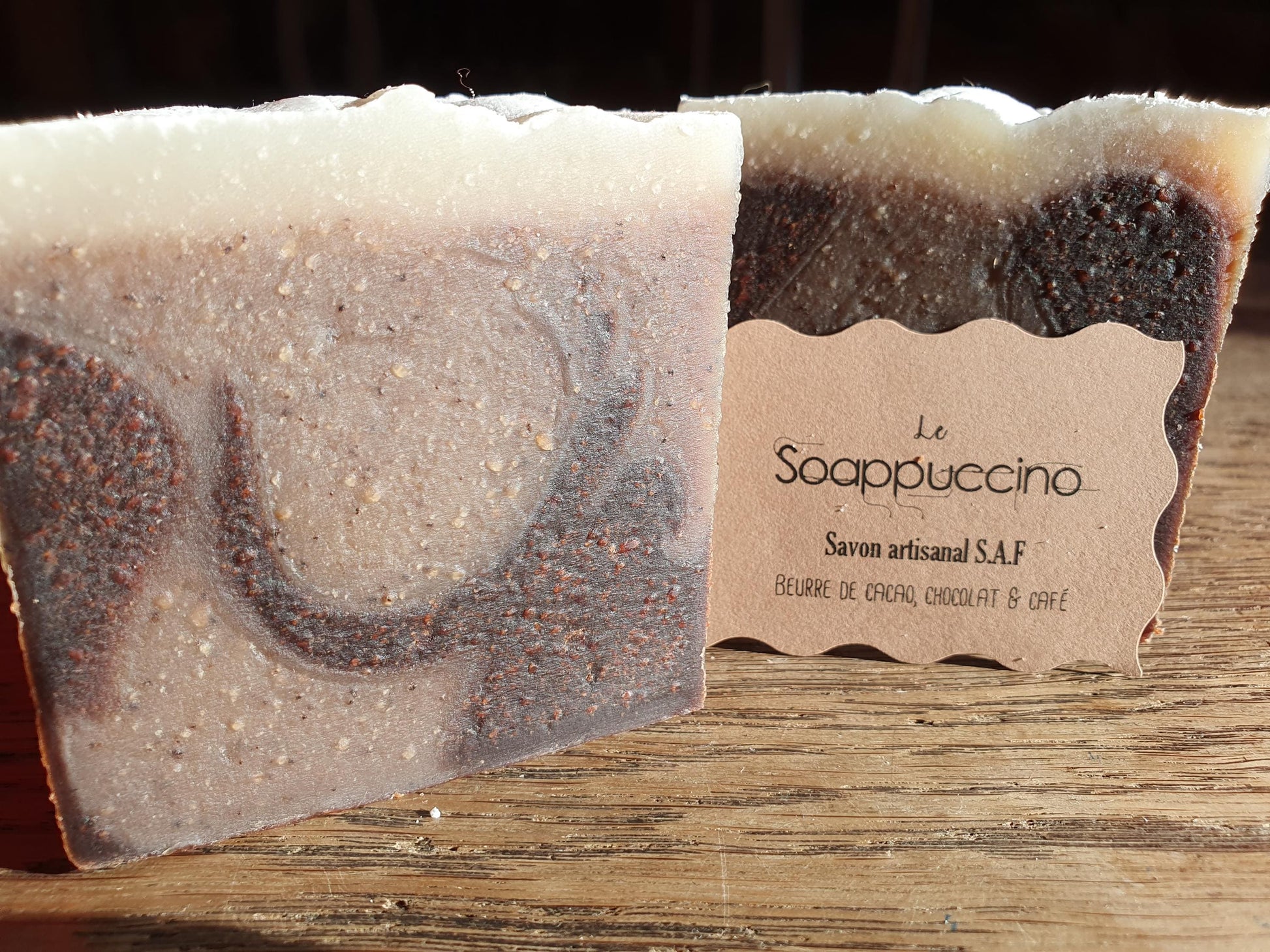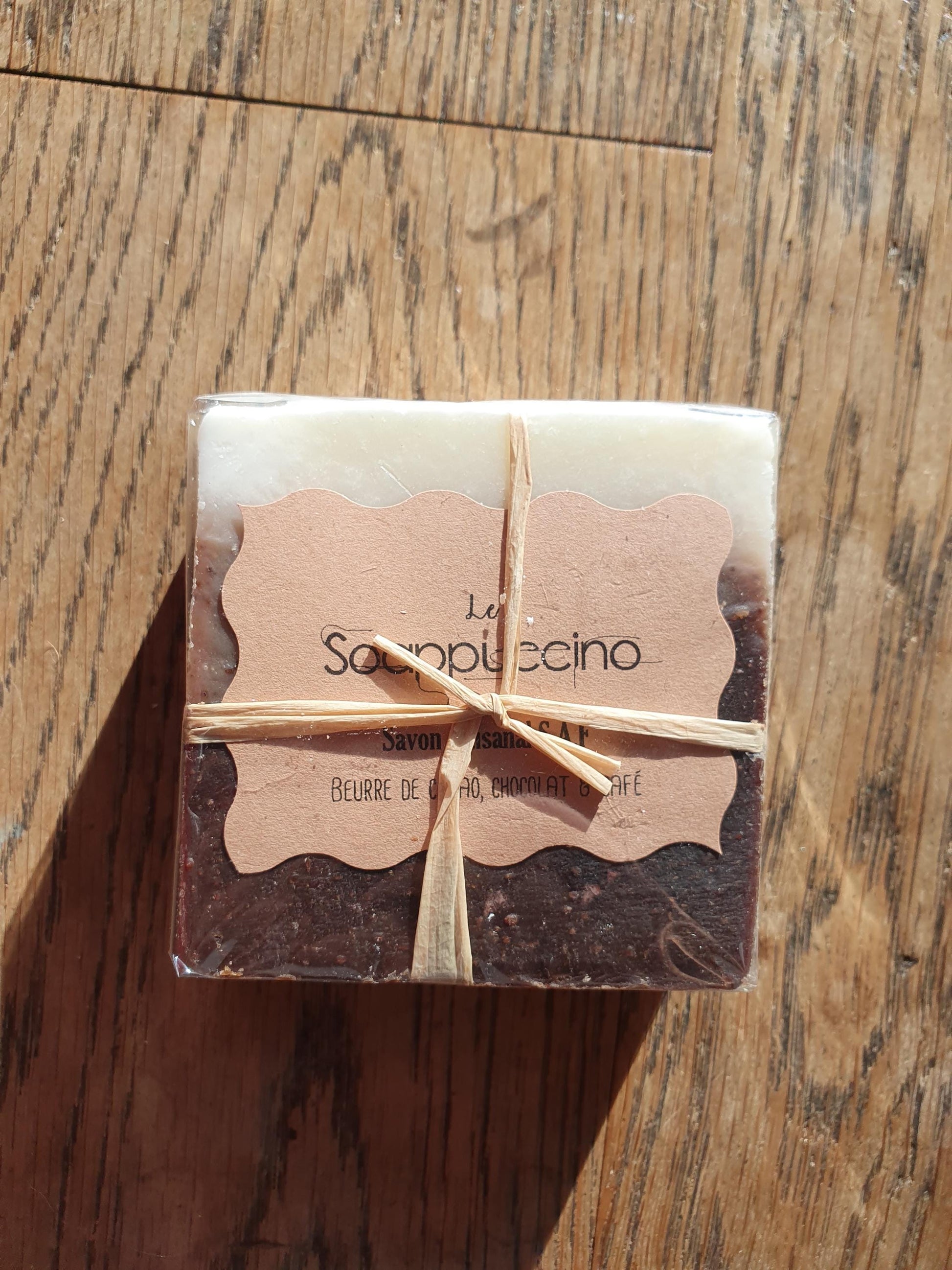 Le "Soappuccino", savon artisanal surgras saponifié à froid marbré au chocolat, café, huiles végétales et beurre de cacao