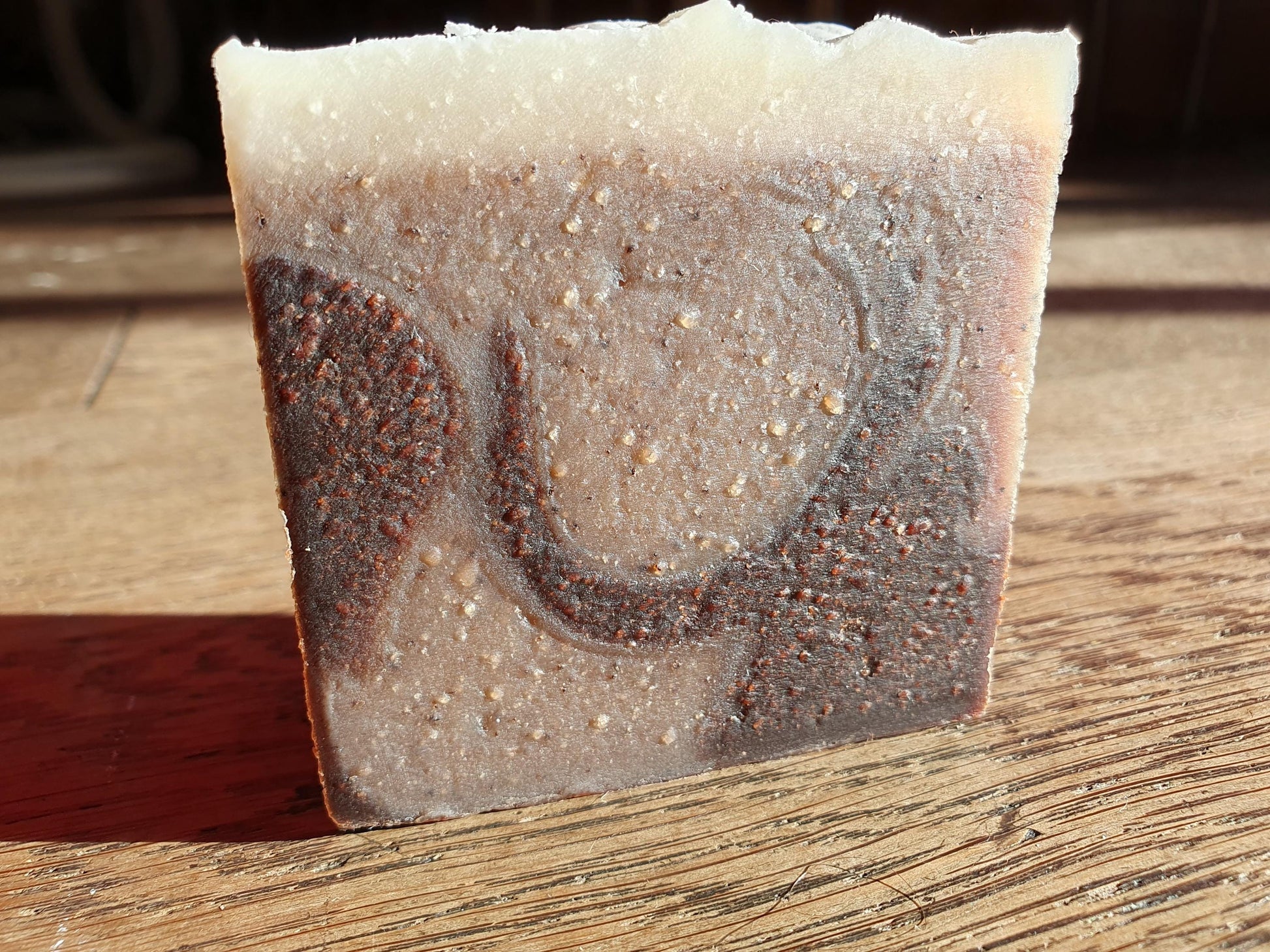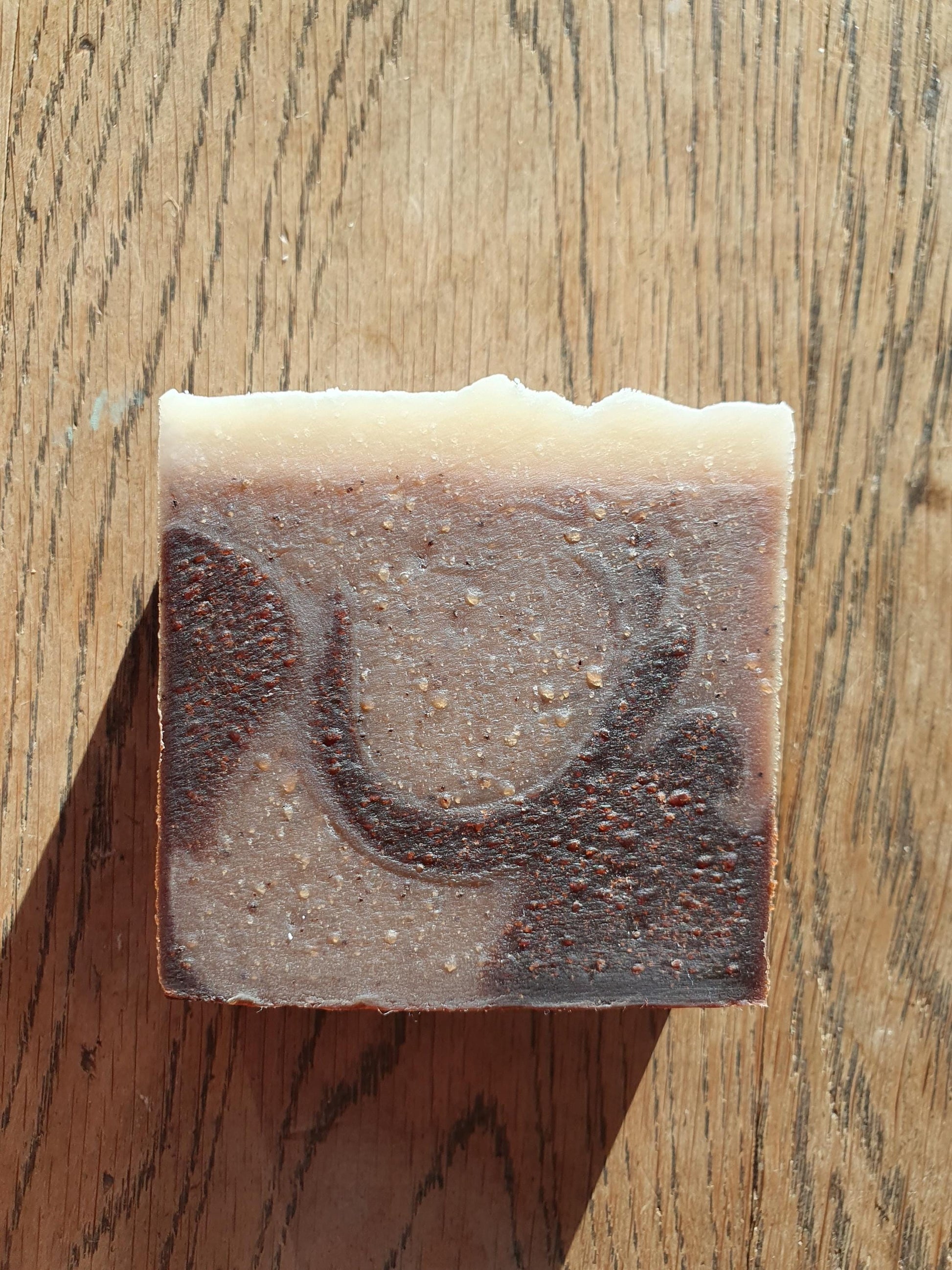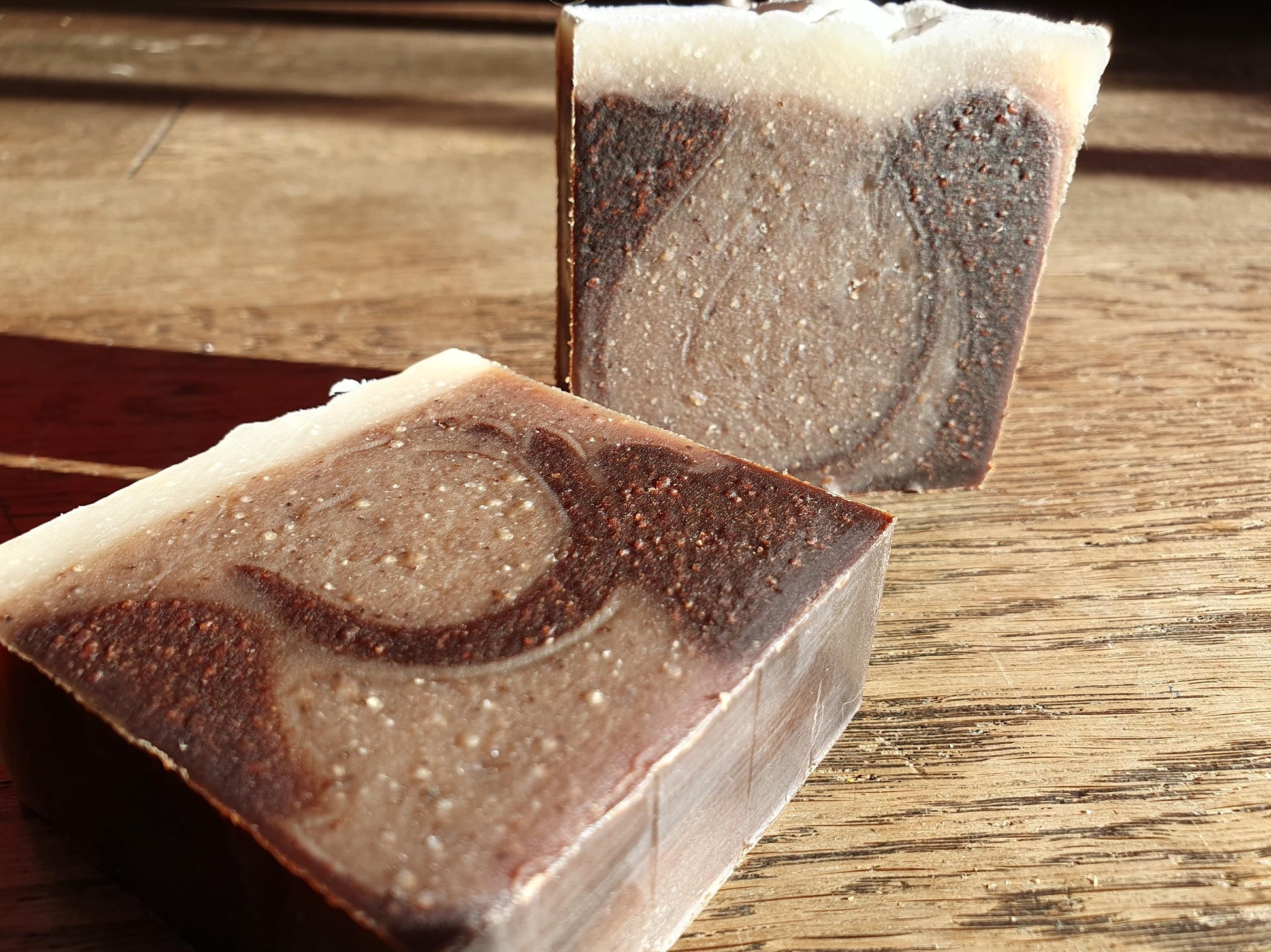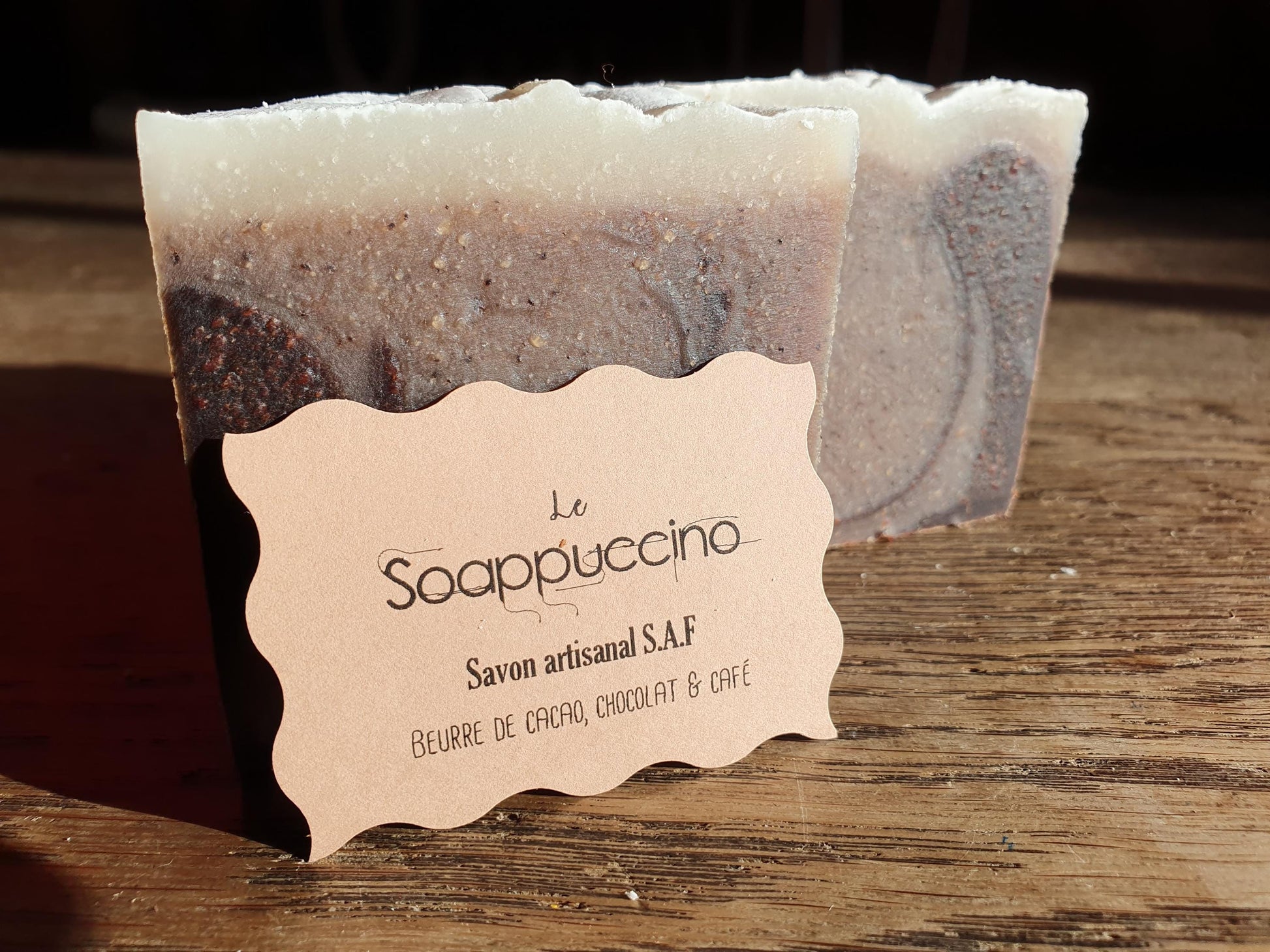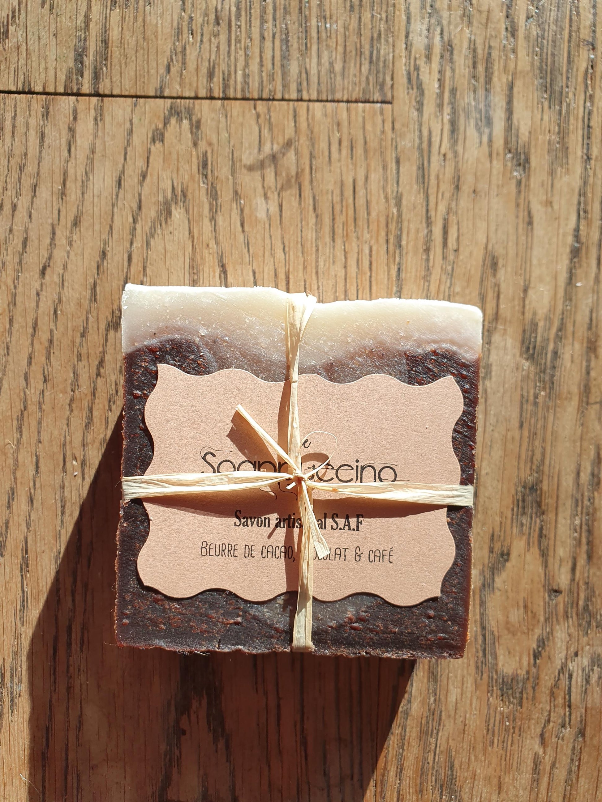 Le "Soappuccino", savon artisanal surgras saponifié à froid marbré au chocolat, café, huiles végétales et beurre de cacao