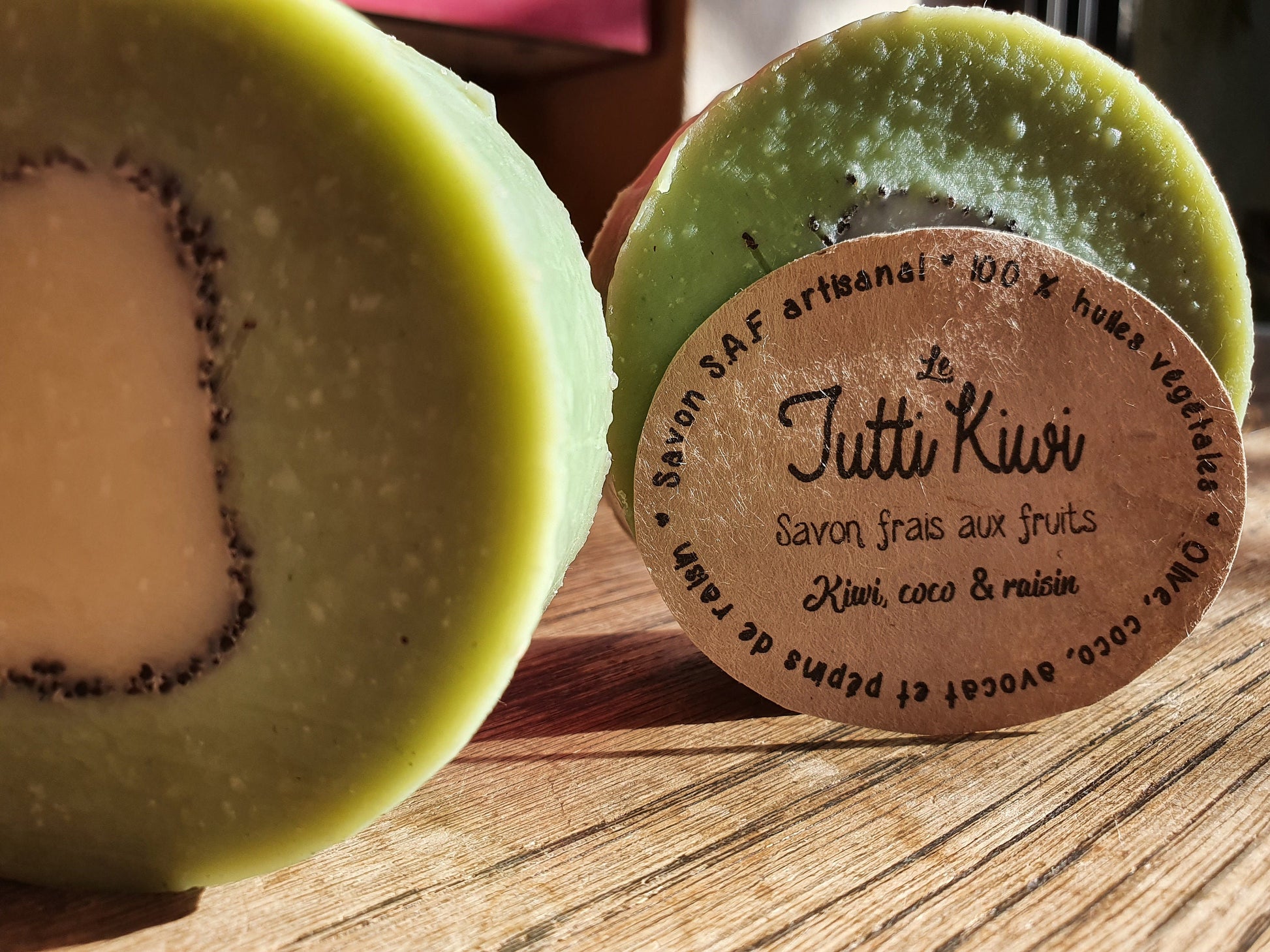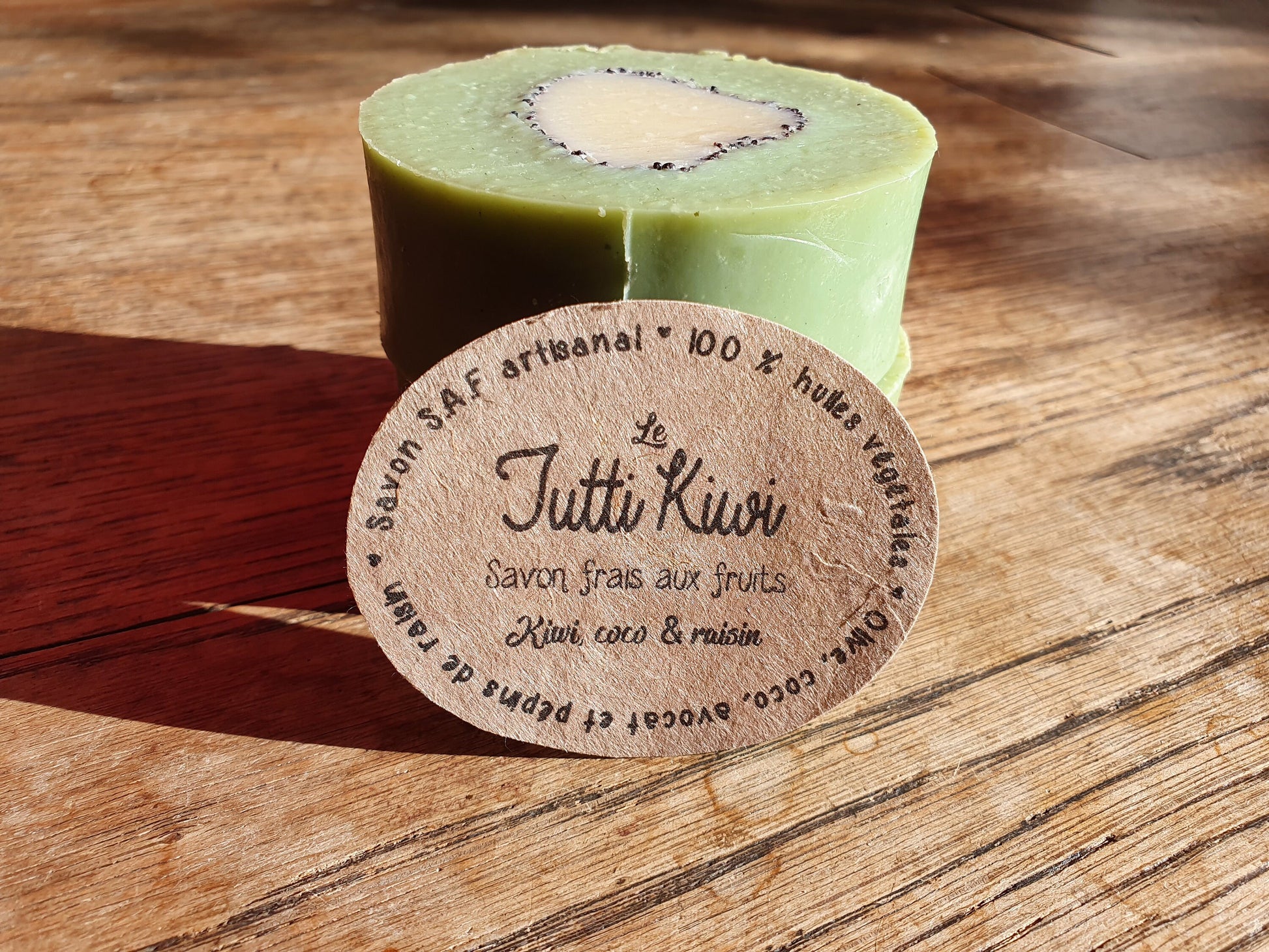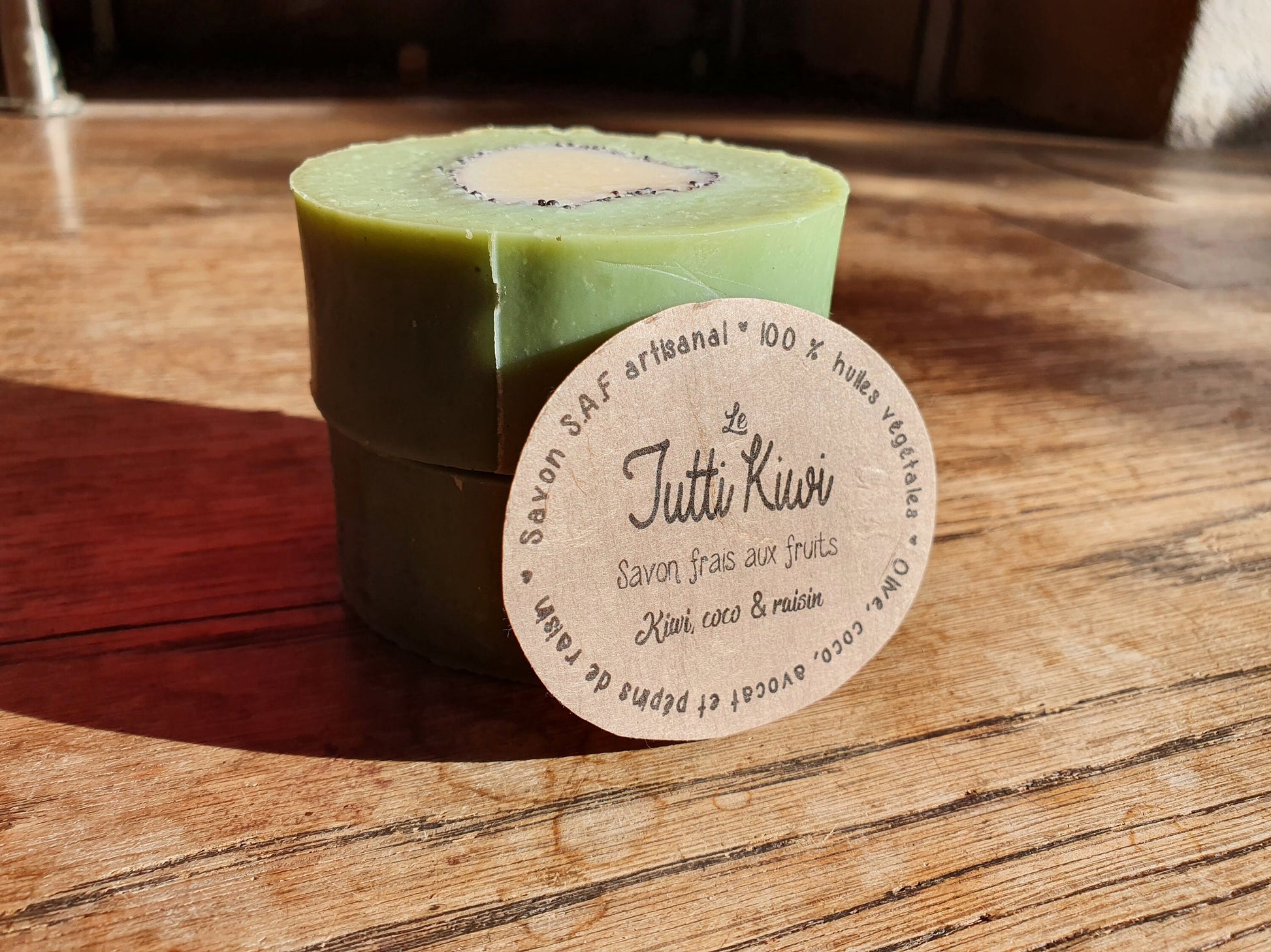 Le "Tutti Kiwi", savon artisanal surgras saponifié à froid frais aux huiles végétales et parfumé au fruit